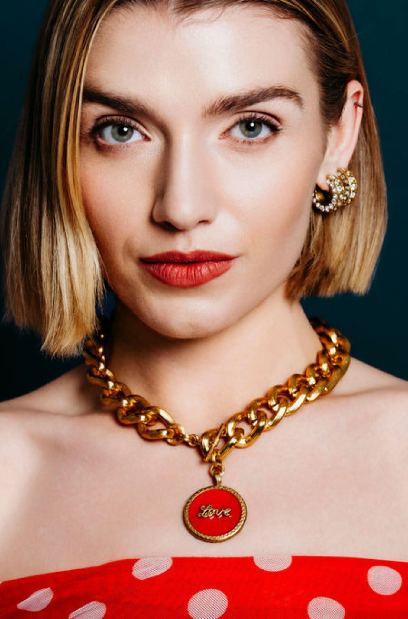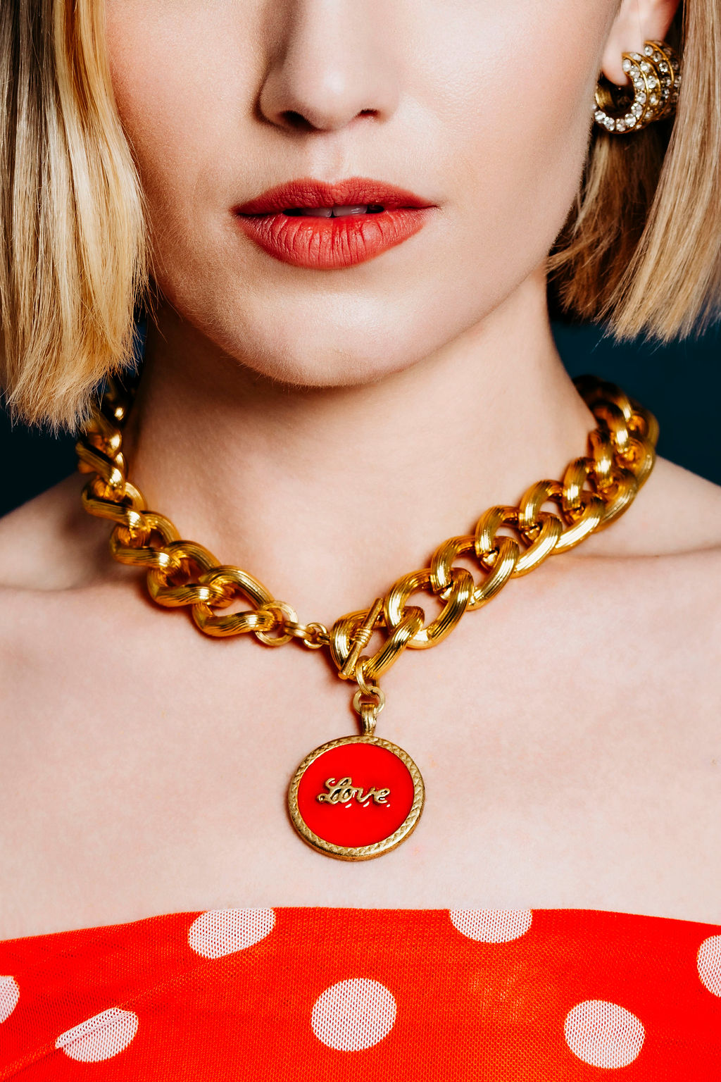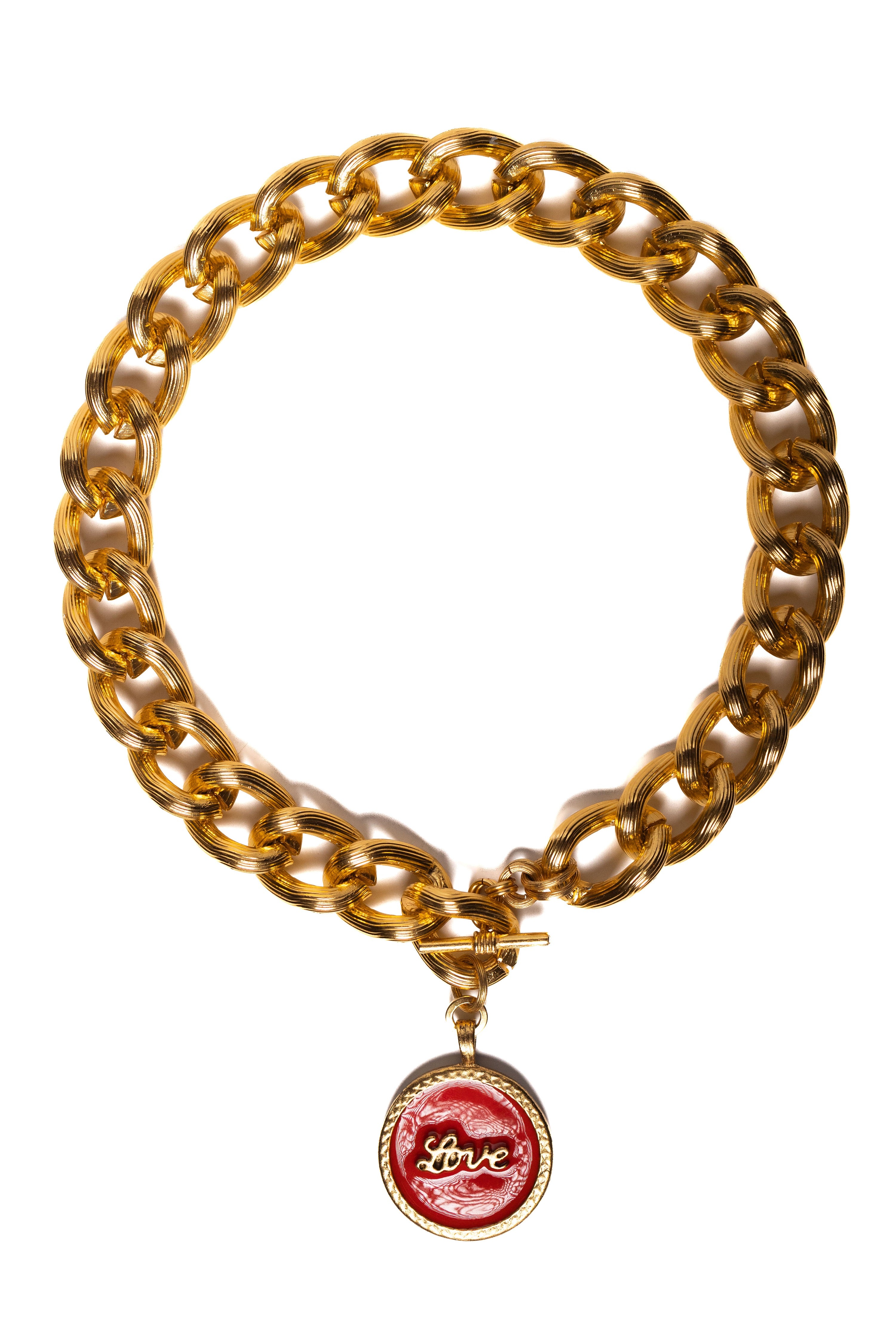 Make a bold statement with the Amor Necklace, featuring a striking open link chain paired with a vibrant red enamel disc charm with the word "love." This daring piece combines edgy design and heartfelt sentiment, perfect for standing out and expressing passion in a fearless way. 24K Gold Plate. Front Toggle Clasp Closure. Made with love in the U.S.A