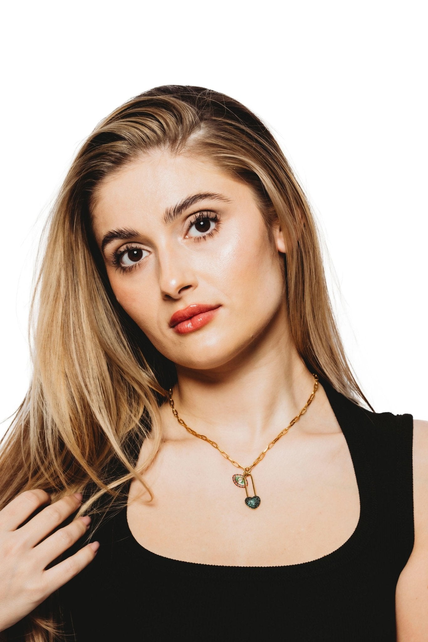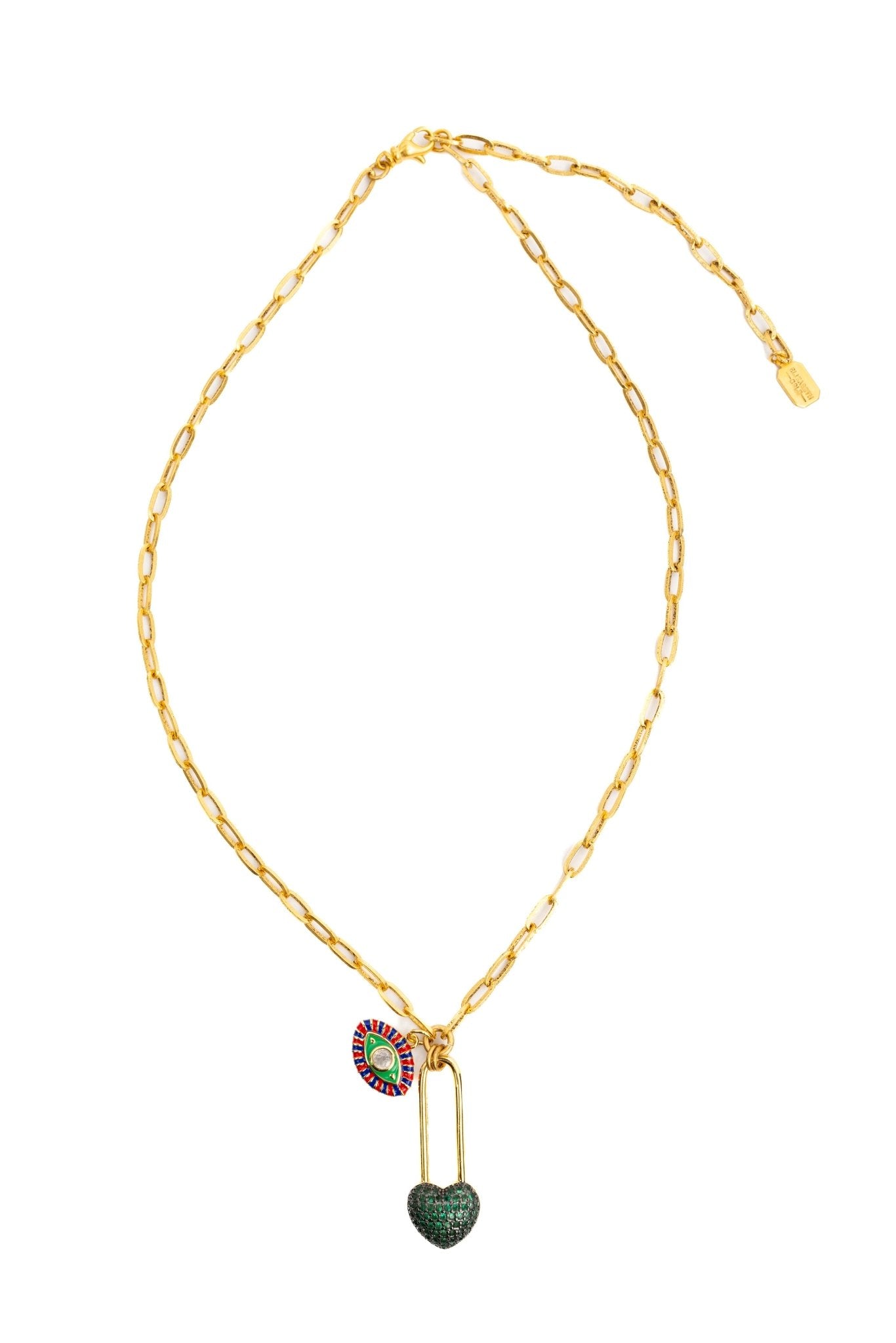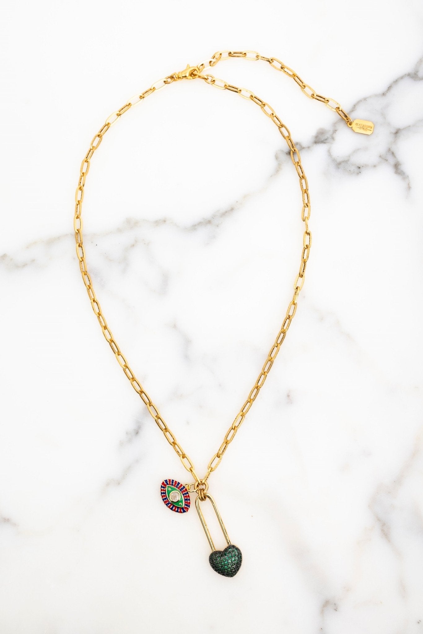 Elevate your style with the Aviana Necklace. This stunning open link chain features a green crystal pave' heart lock charm and an eye-catching evil eye charm in green, red, and blue enamel. The round crystal center adds a touch of sparkle. A must-have piece for any fashionista. 24k Gold Plated. Made in the U.S.A