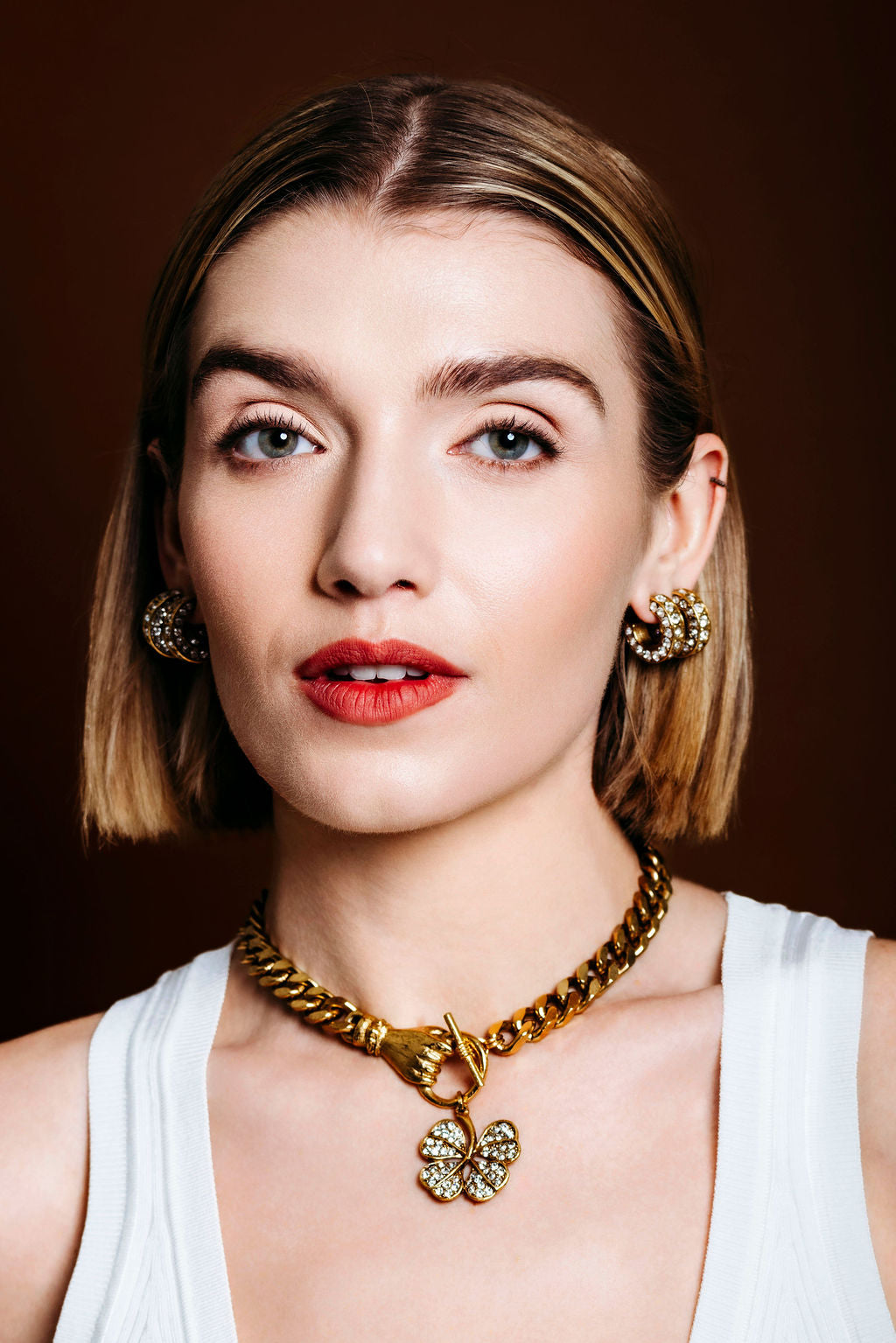 Make a bold statement with the Clovette Necklace, featuring a striking Cuban link chain and a distinctive hand and toggle clasp at the front. The centerpiece is a large crystal clover charm that catches the light and commands attention. Perfect for those who dare to stand out, this necklace combines edgy design with a touch of elegance. 24K Gold Plate. Swarovski Crystals. Front Toggle Clasp. Proudly made in the U.S.A