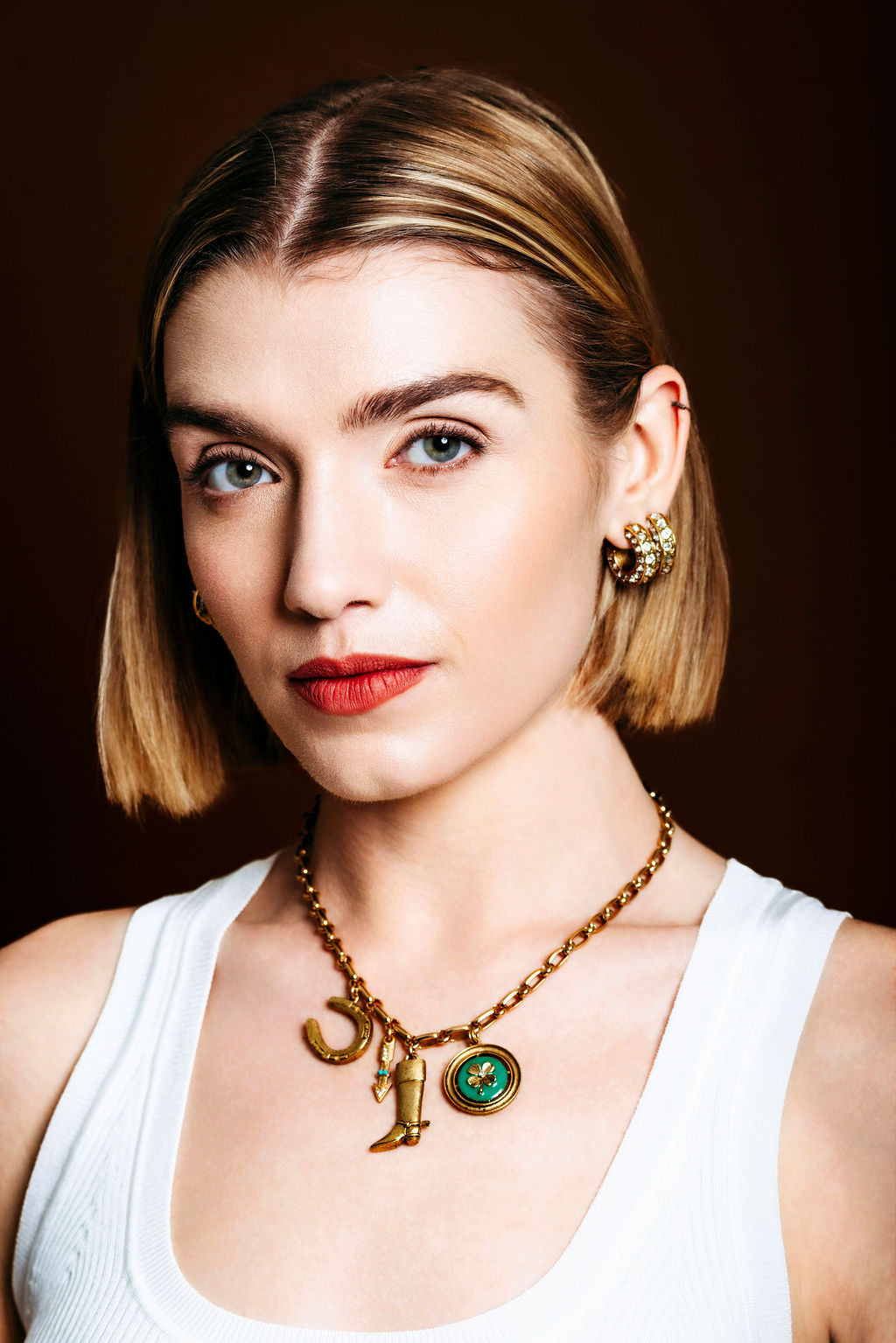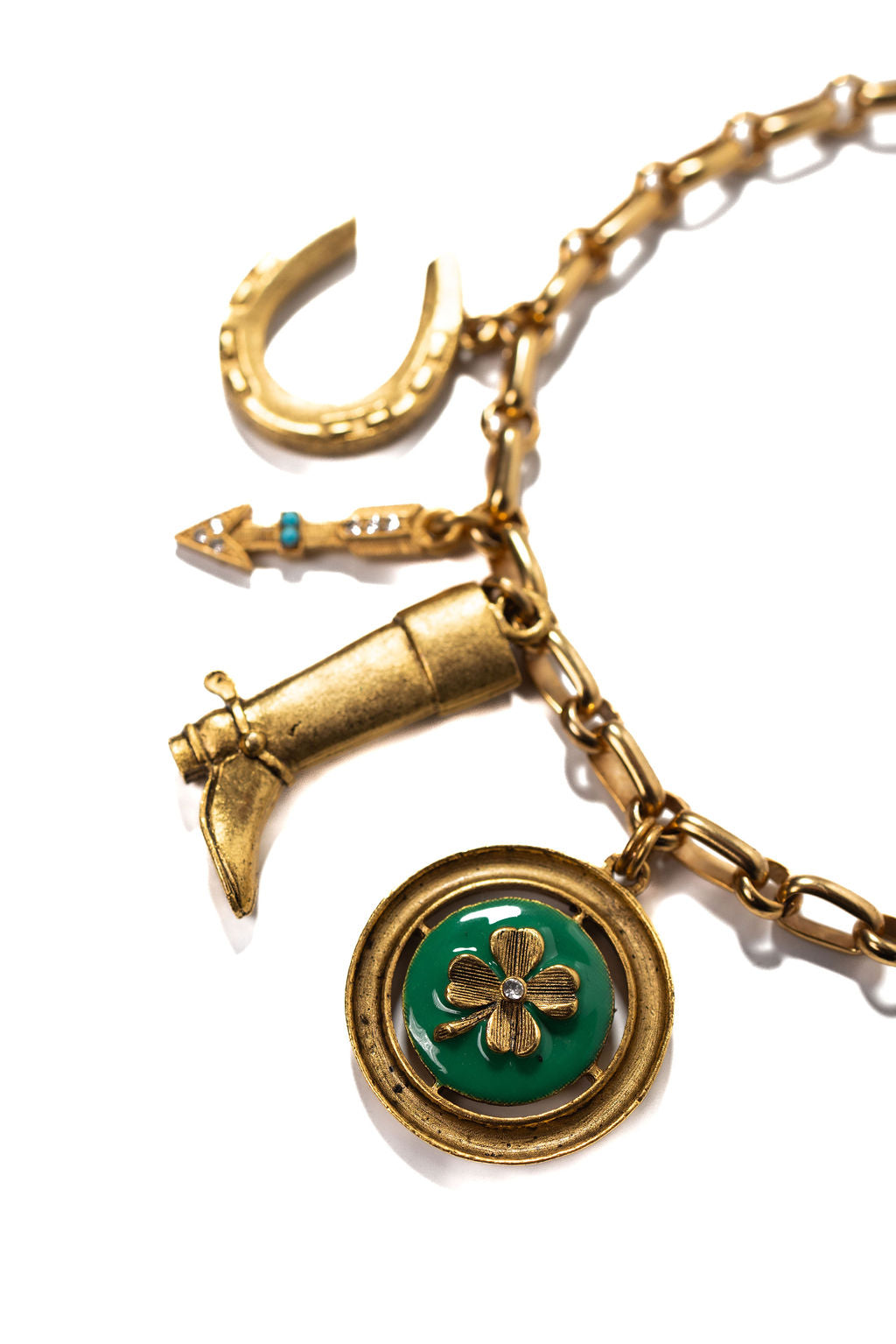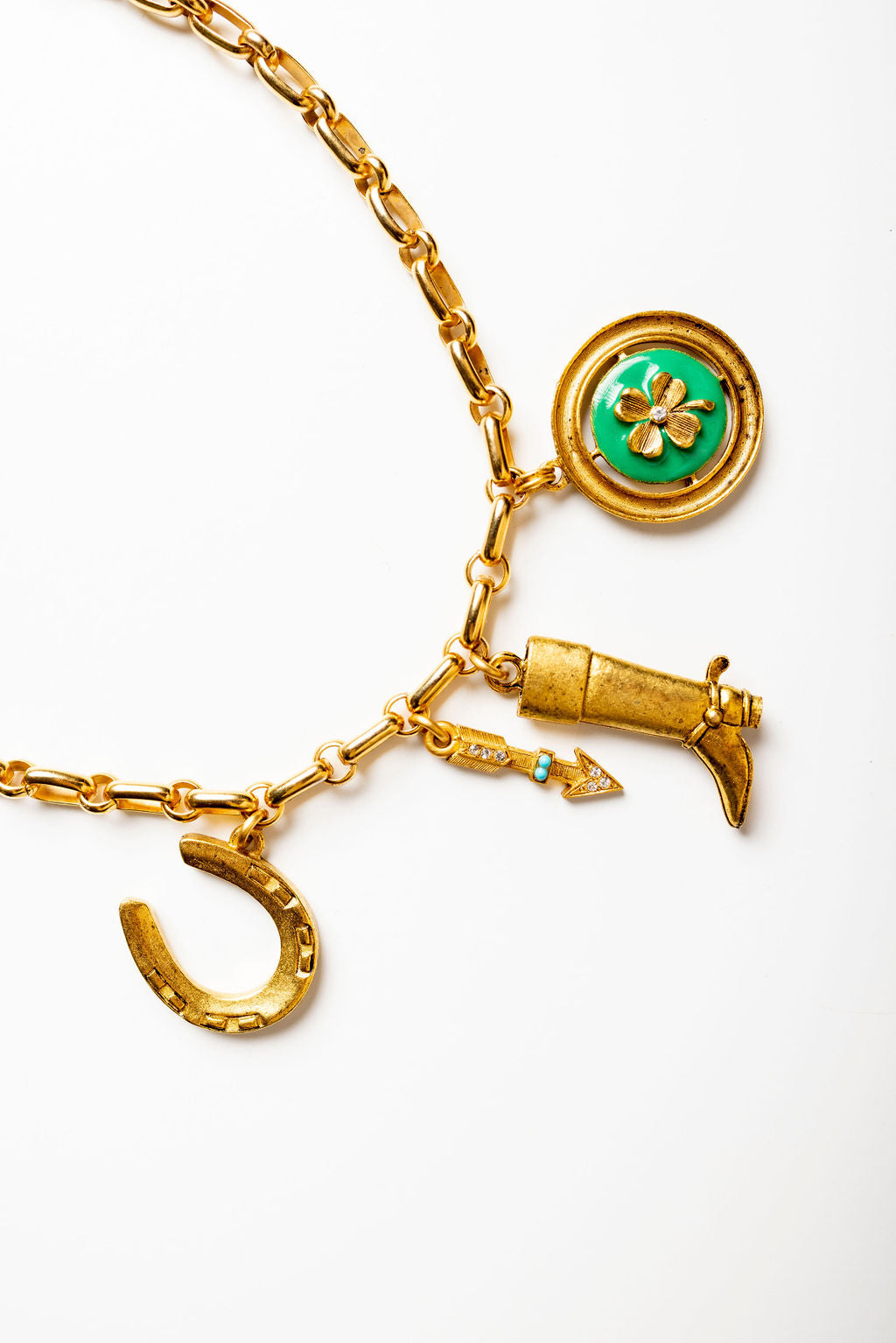 The Elmira Necklace features an open link chain adorned with four meaningful charms: a horseshoe, arrow, cowboy boot, and a green enamel four-leaf clover. Designed to inspire luck and resilience, this necklace offers a subtle yet supportive statement piece to uplift your everyday look.24K Gold Plate. Lobster Claw Closure. Proudly made in the U.S.A