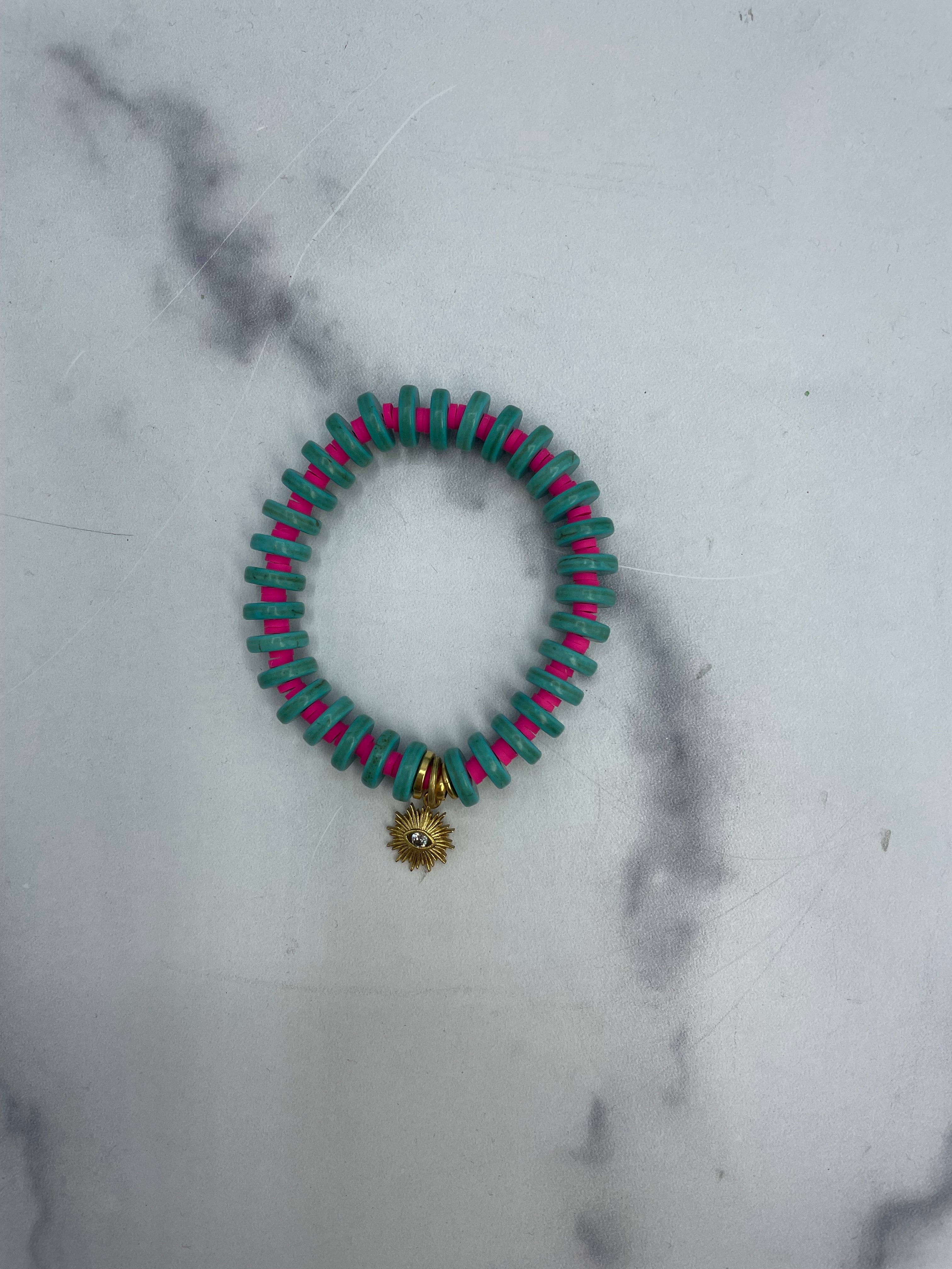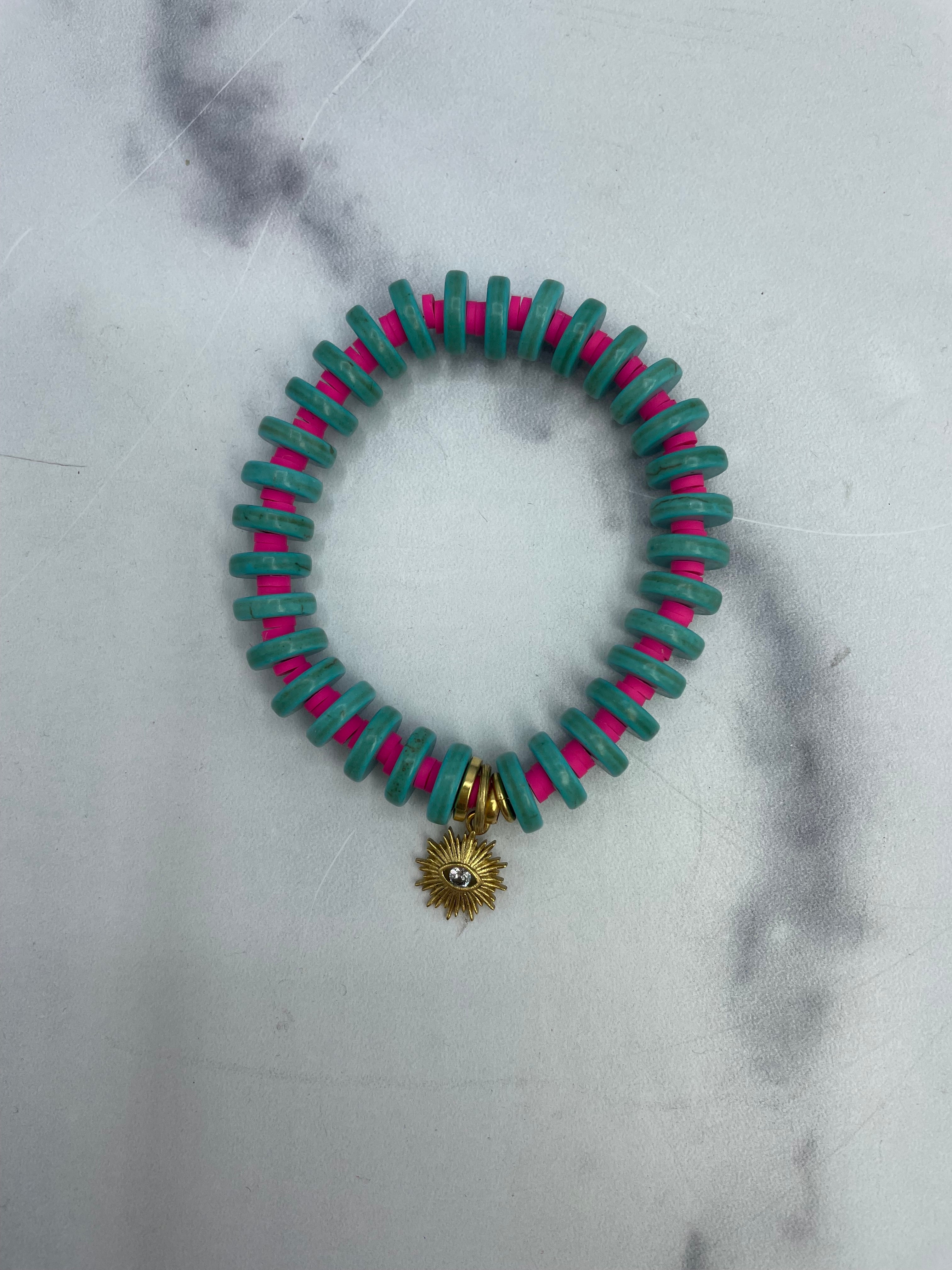 The Neris Bracelet is your ticket to effortless boho style with a spiritual twist. This stretchy beauty features turquoise heishi discs punctuated by vibrant pink vinyl spacers that keep things fun and fresh. The real magic? A stunning sunburst evil eye charm that doubles as your personal good-vibes guardian. Whether you're layering it with other bracelets or letting it take center stage, this playful piece brings color, meaning, and just the right amount of mystique to your everyday look.
