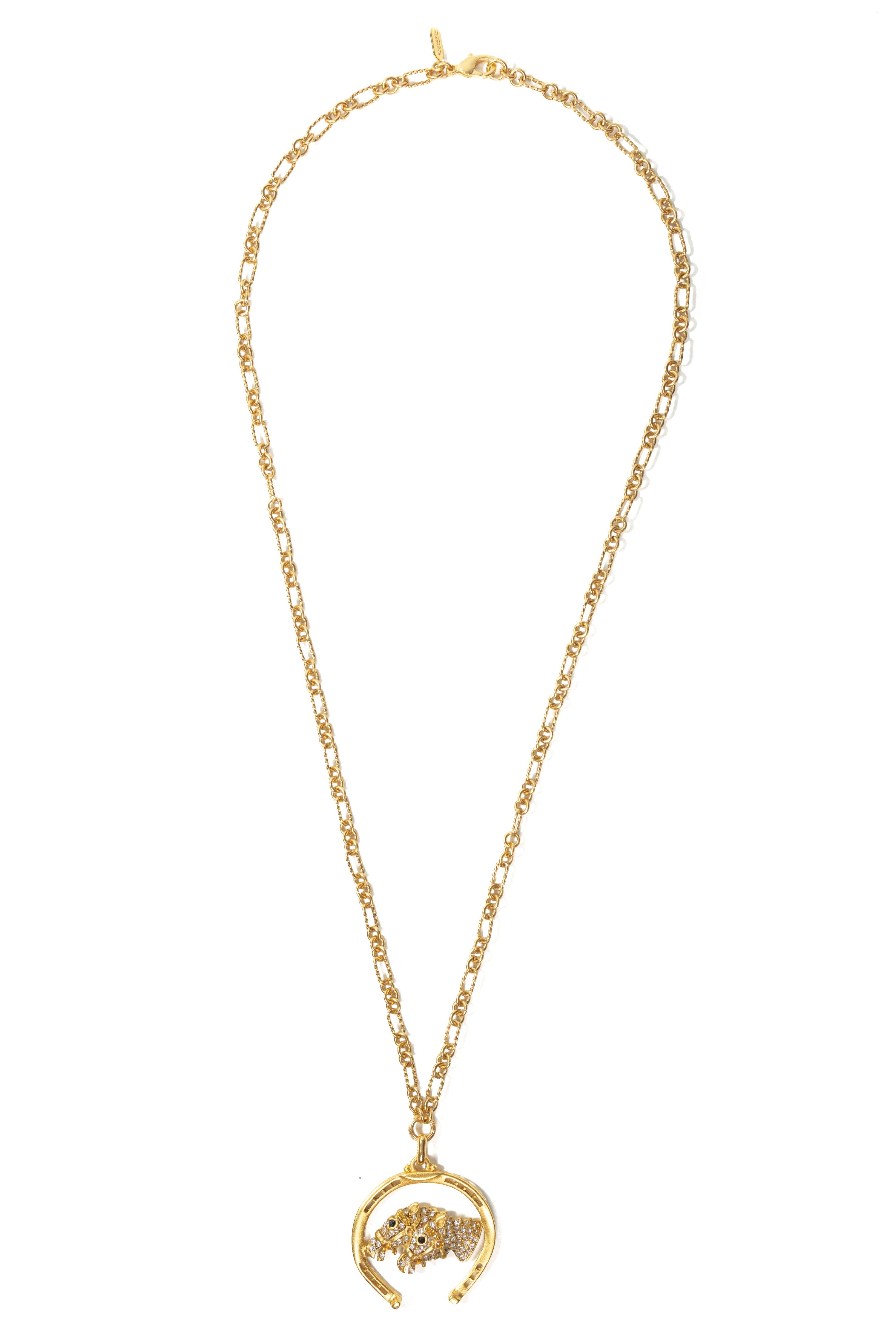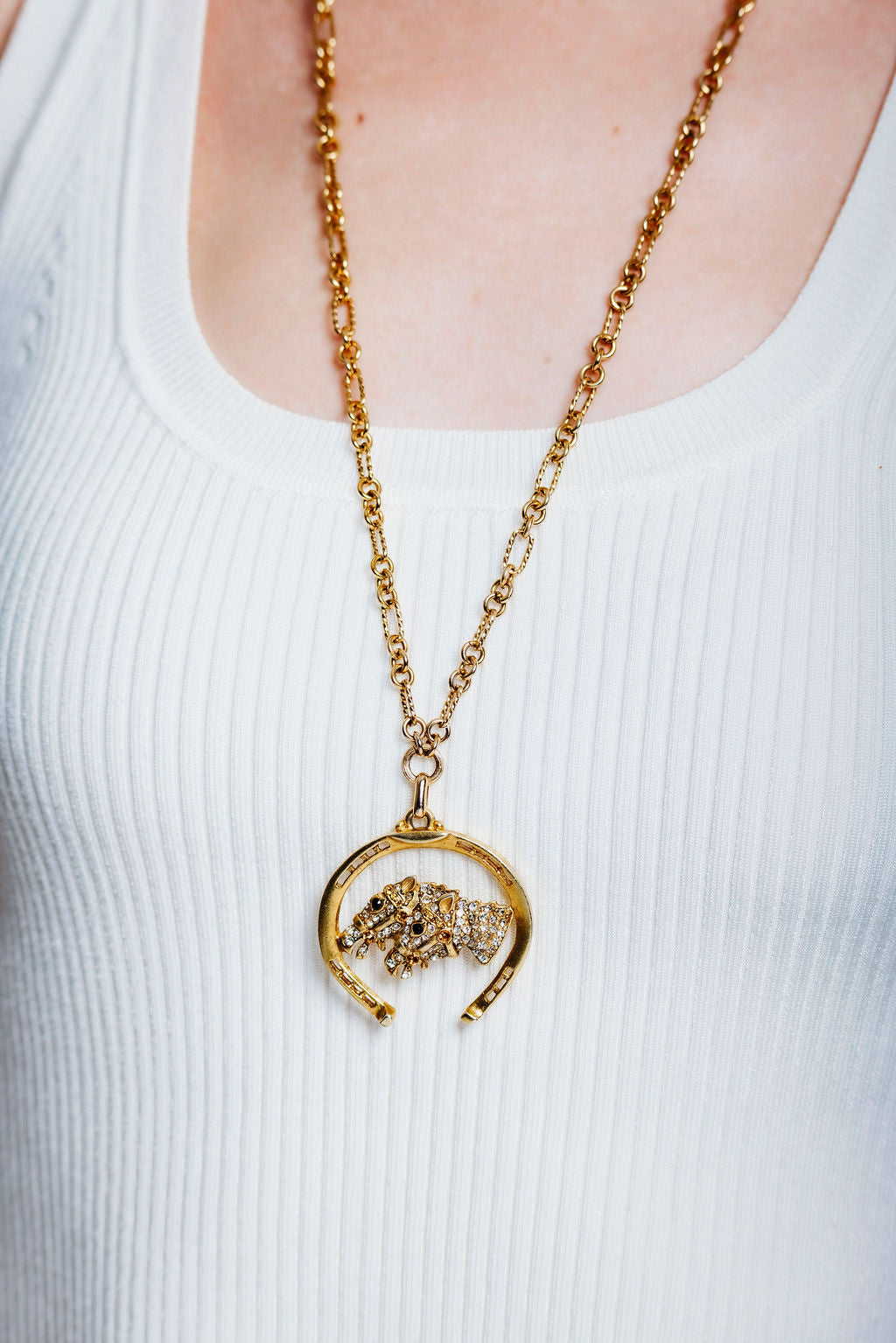 The Philippa Necklace features a delicate open link chain that beautifully complements its crystal-encrusted double horse head horseshoe charm. This elegant design adds a subtle sparkle while symbolizing luck and strength. Perfect for everyday wear, it offers a graceful touch to any outfit, making it a meaningful and stylish addition to your jewelry collection. 24K Gold Plate. Premium Crystals. Lobster Claw Closure. Proudly made in the U.S.A