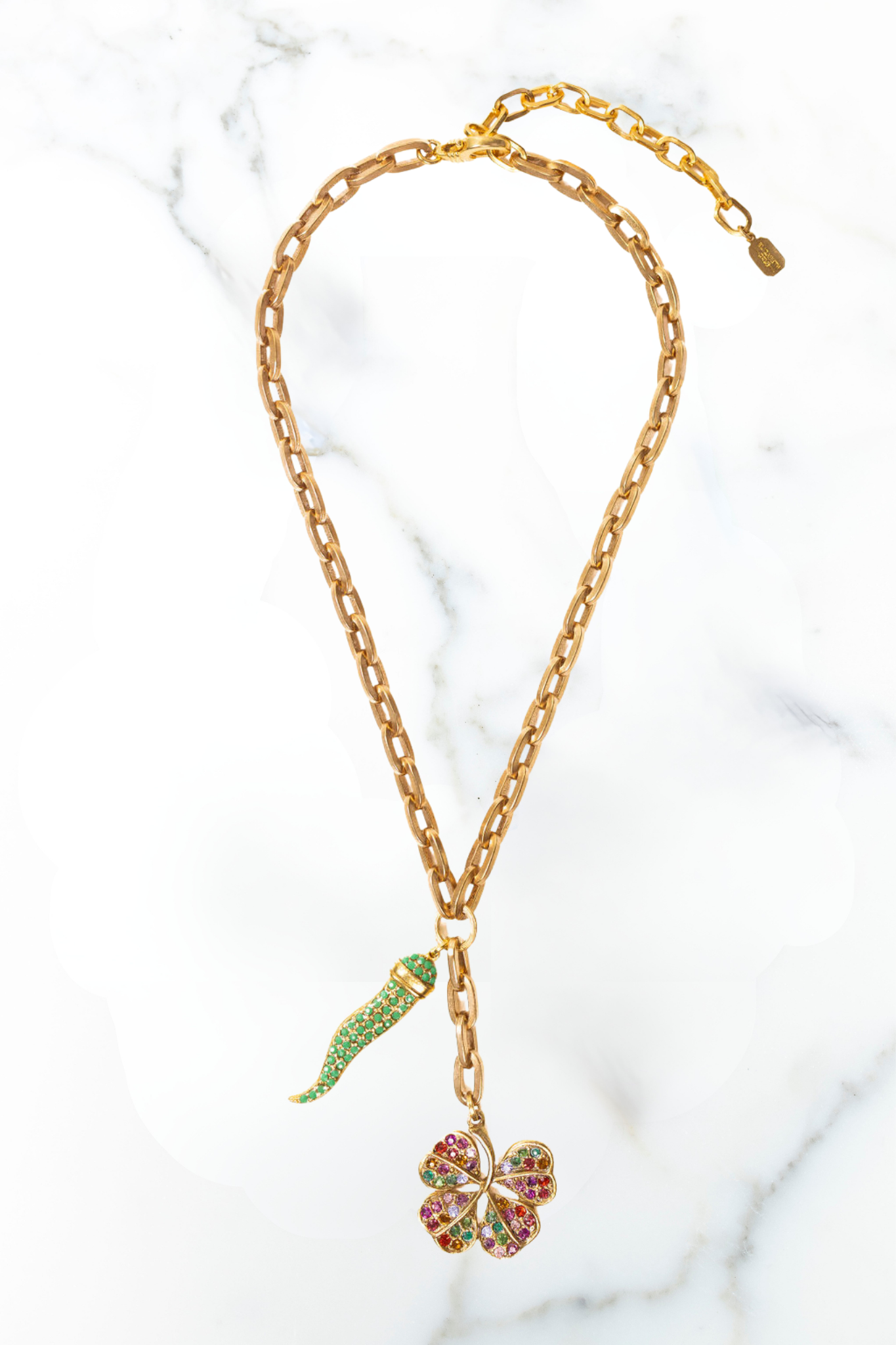 The Suerte Necklace features an open link chain adorned with a vibrant rainbow crystal clover charm and a striking green crystal horn charm. This daring combination brings bold energy and unique flair, making it an ideal accessory for those who want to stand out and attract good fortune with confidence.