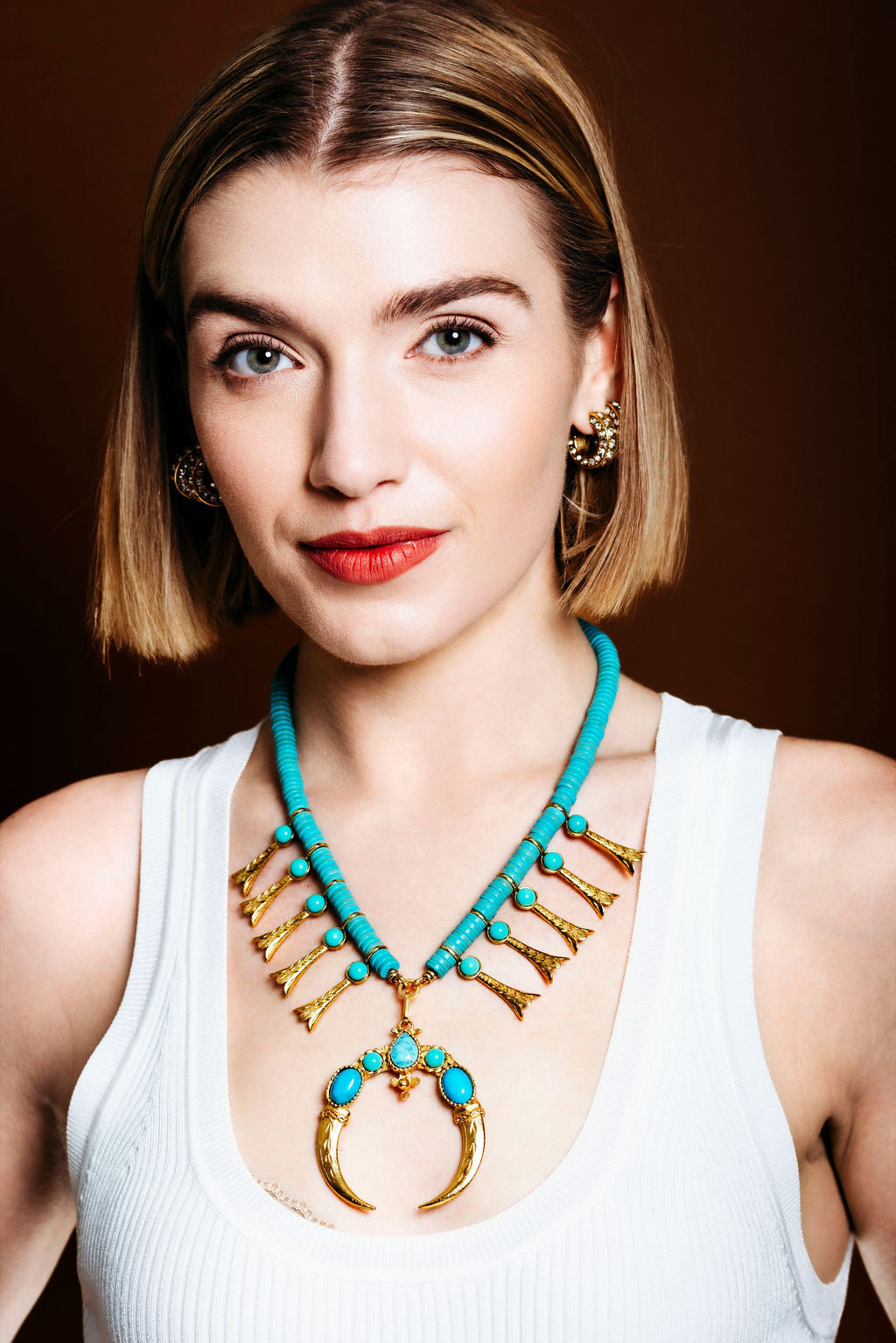 Rock a modern twist on a classic squash blossom with our Turquessa Necklace! Hand-crafted in the USA, this necklace features vibrant turquoise glass stones on a 24kt gold plated chain. Don't settle for ordinary, add a touch of elegance with this unique statement piece.