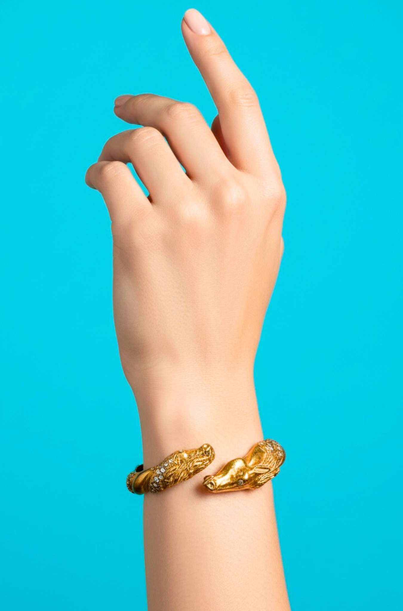 Celebrate your inner cowgirl with the Kissing Horse Bracelet! Featuring two charming horse heads adorned with sparkling crystals, this playful piece adds a touch of Western spirit and fun to any outfit. Perfect for expressing your bold, free-spirited style with a dash of shimmer and personality. 24K Gold Plate. Hinge opening. Swarovski Crystals. Proudly made in the U.S.A
