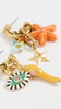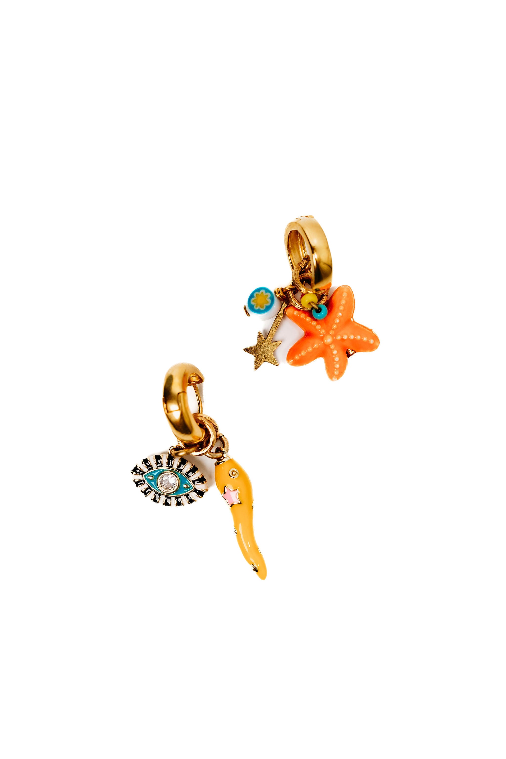 Dive into the whimsical world of our Staryu Earrings! These playful asymmetrical hoops showcase a delightful collection of starfish, spicy yellow peppers, and protective evil eyes. Crafted with luxurious 24kt gold plating and proudly made in the USA, these statement pieces add a splash of fun and mystique to any outfit. Turn heads with these charmingly unexpected combinations!