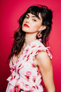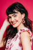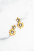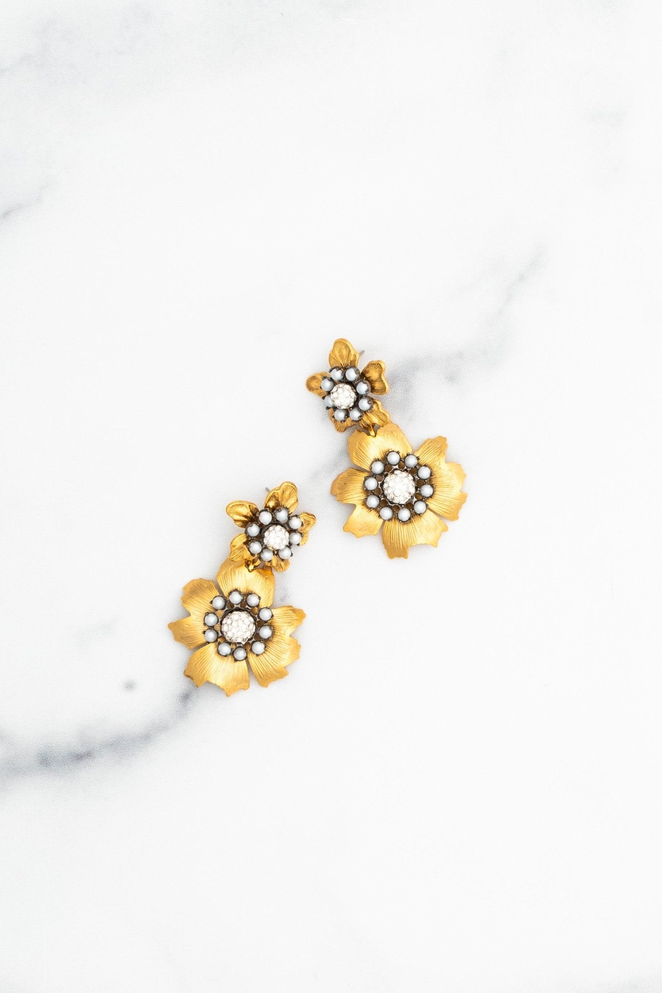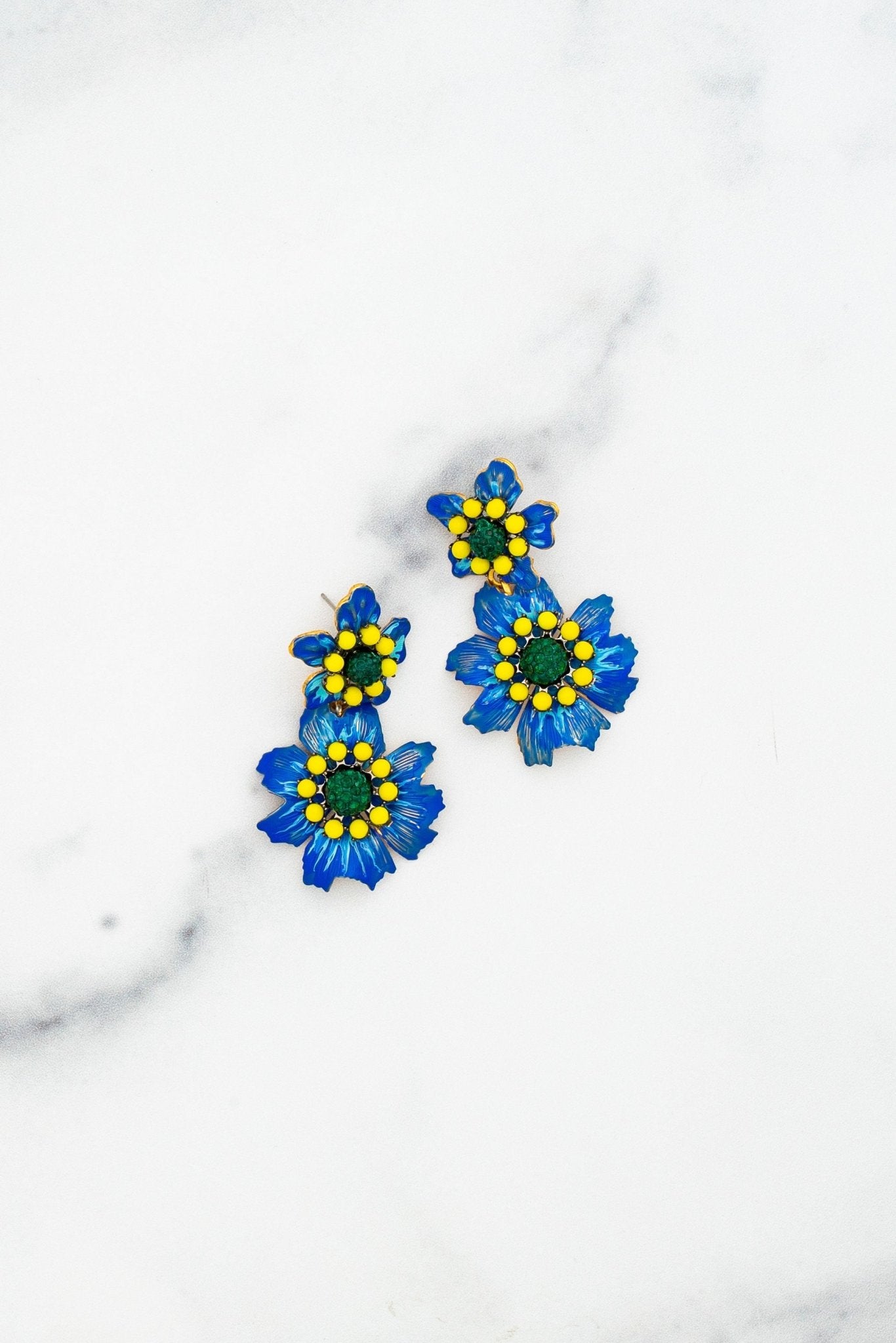 The Susan Earrings offer a double drop design featuring graduated flowers with a variety of colors such as gold, pink, and blue. These earrings are crafted with 24kt Gold plate and have sparkling centers for a touch of elegance.
