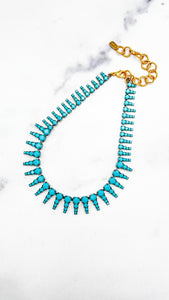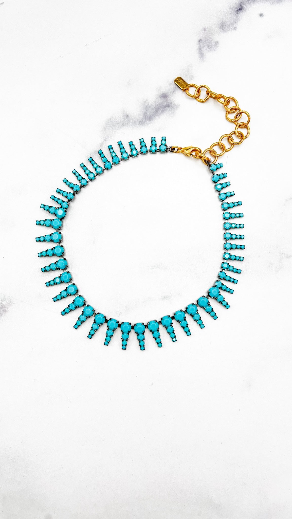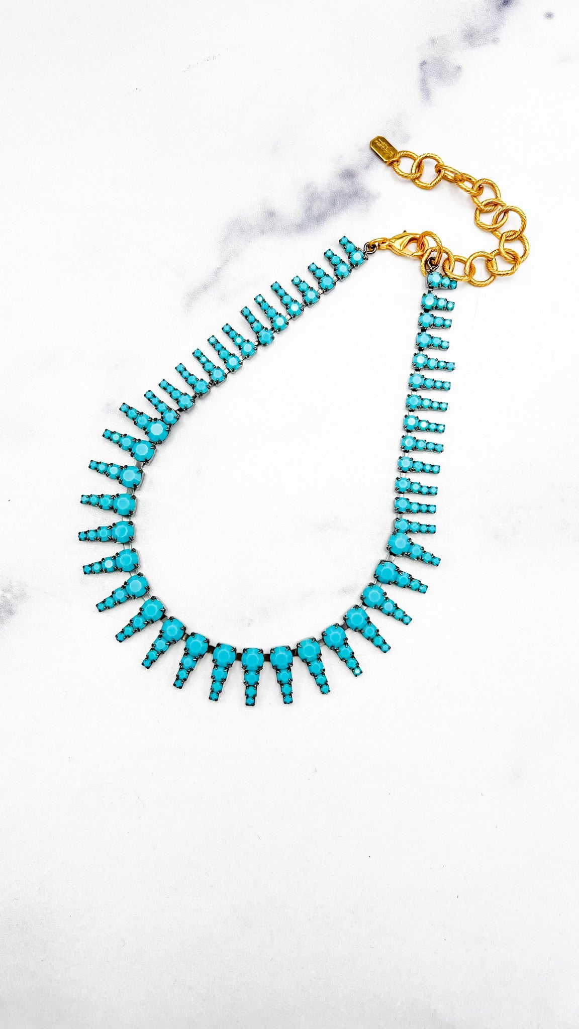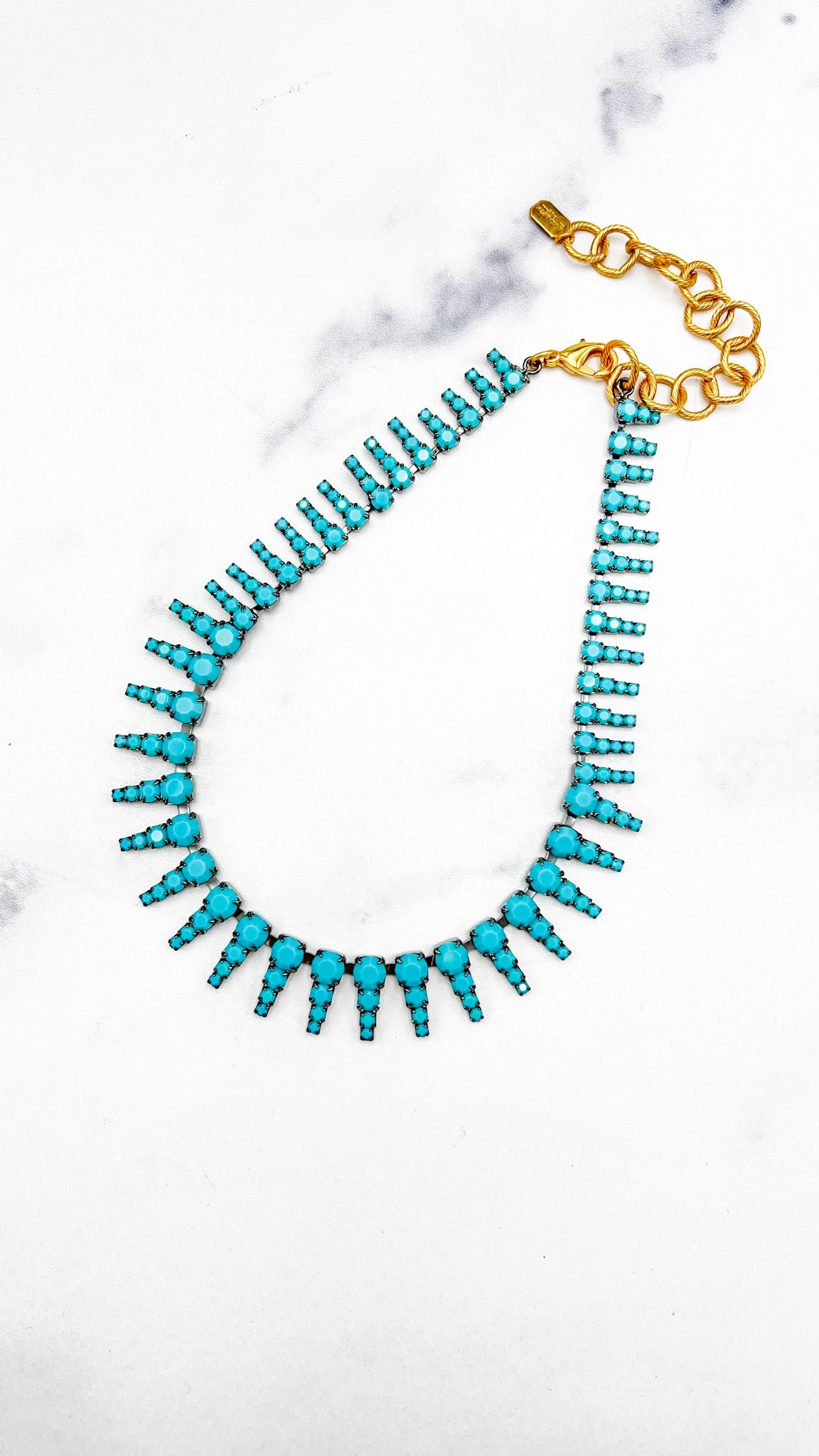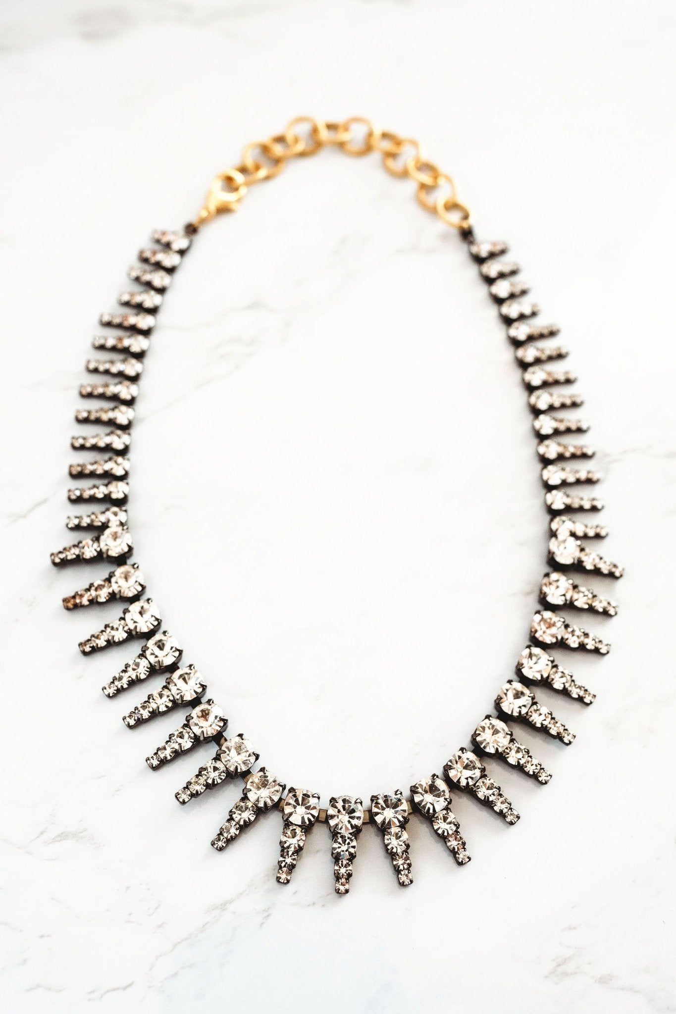 Wear it layered or alone, the Drew Necklace features graduated daggers of crystals and finished in a gunmetal hue. Austrian Crystals, Hematite Plate, Lobster Claw Closure. Proudly Made in the USA.