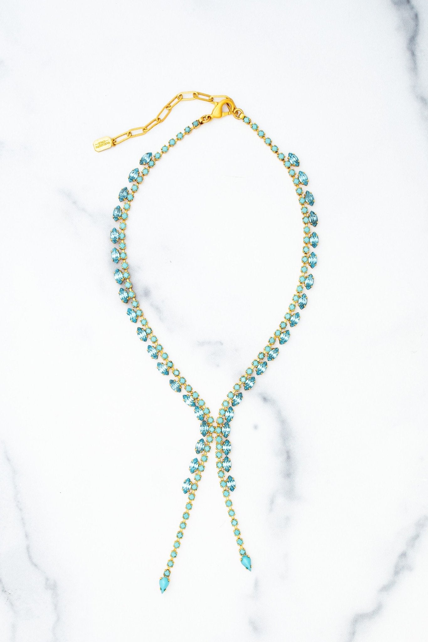 Feel chic and edgy with this Murphy Necklace! It features a zipper necklace with a splash of marquis stones, giving you the perfect touch of elegance and style. Finished with vintage blue or crystal pears, this fashionable piece is sure to become your go-to accessory! Zip it on and stand out!