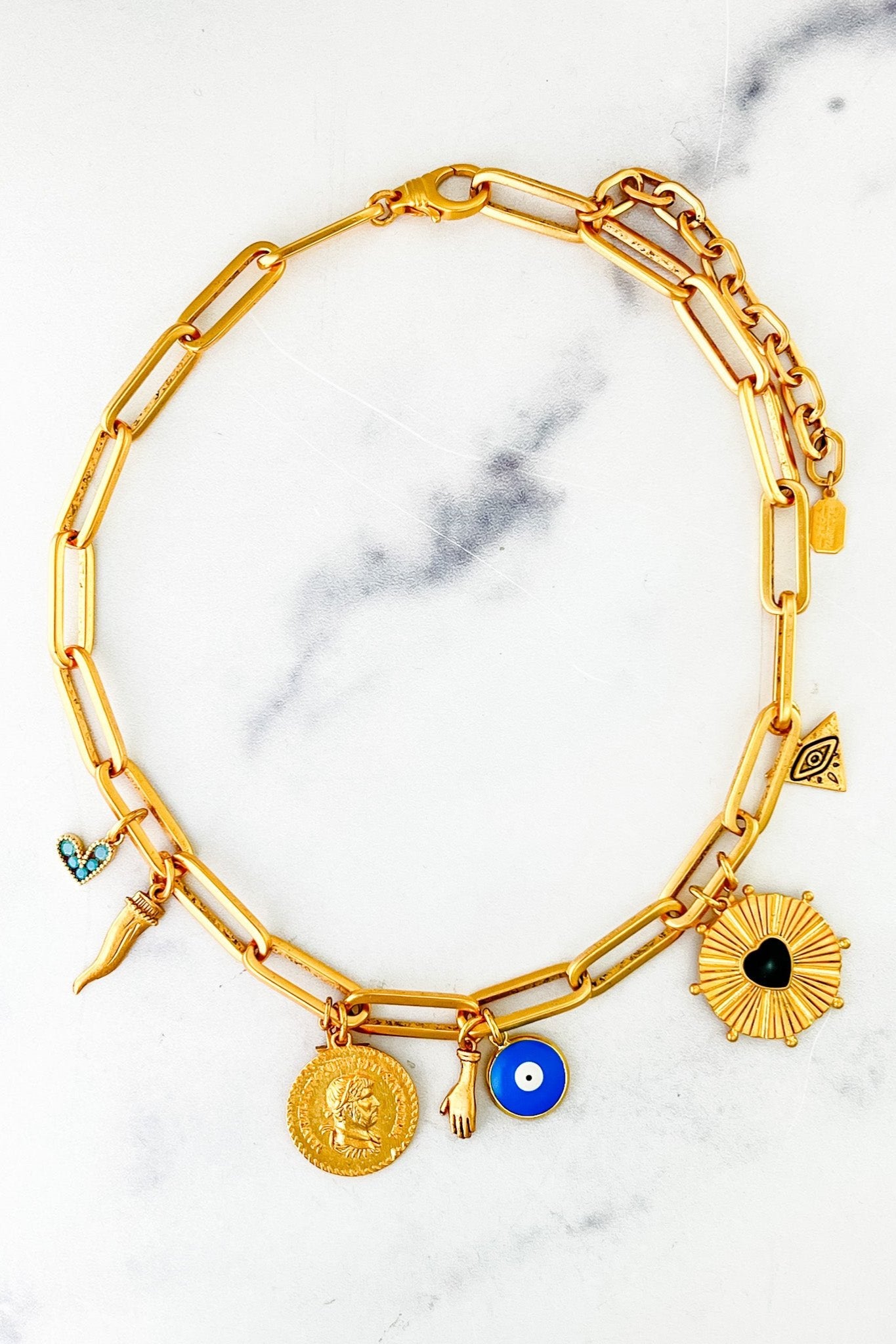 Elevate your style with our Goodluck Necklace! This oval open link necklace features 2 evil eye, figa, Italian horn, Roman coin, small heart with turquoise accents, and sunburst charm with a black heart center. Plus, 2 small star charms for a touch of celestial beauty. Bring some good vibes into your life with this stunning necklace. 24K Gold Plated. Lobster Claw Closure. Made in the U.S.A