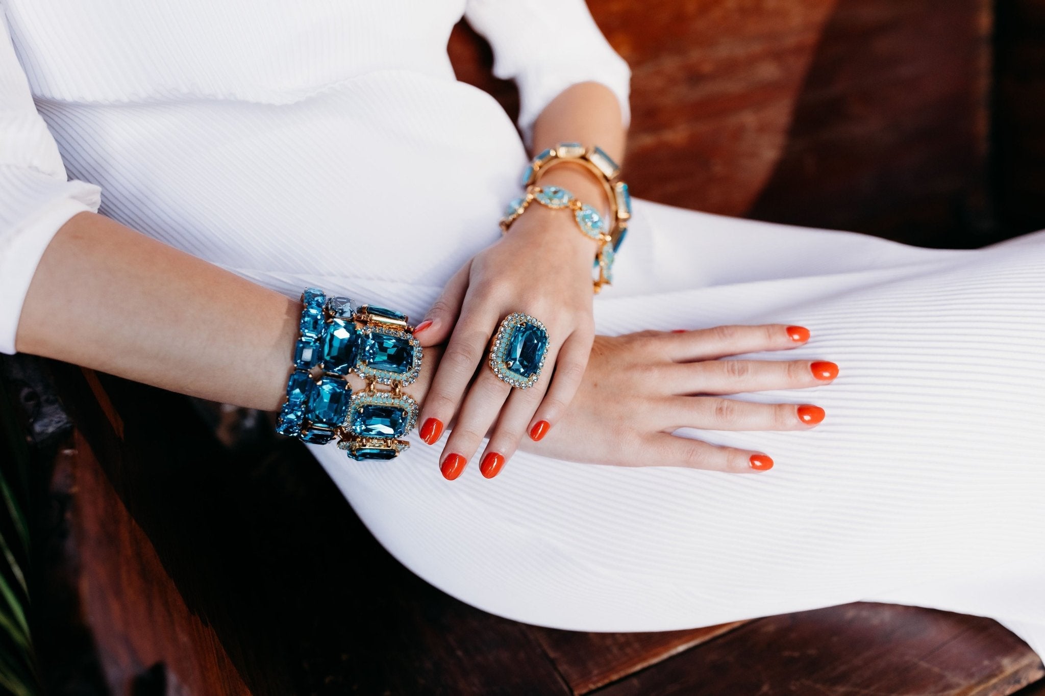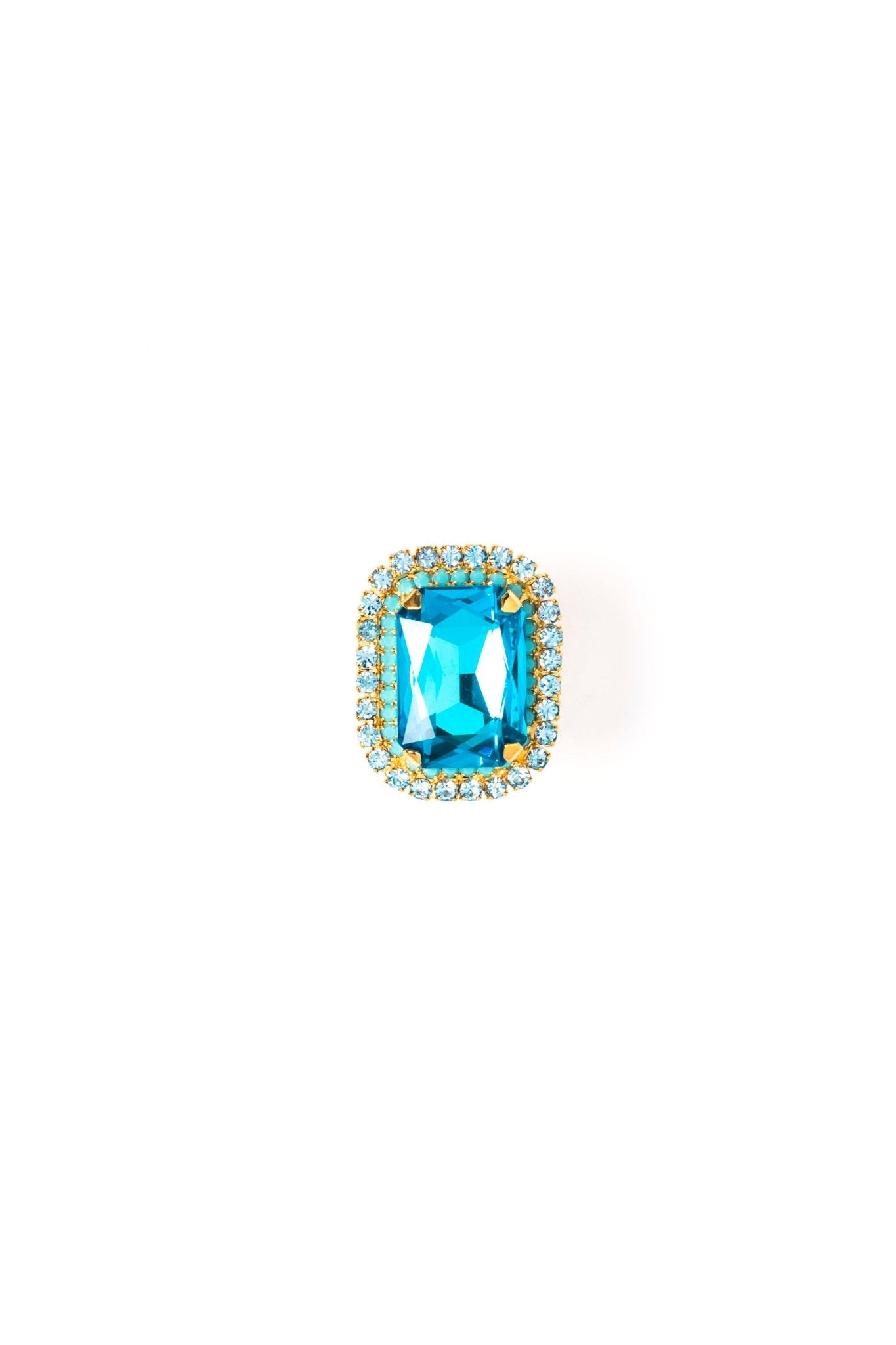 The Ariana Ring showcases a large radiant cut center crystal encircled by a double row of ombre crystals, offering a beautiful gradient effect. Available in your choice of pink or blue, this ring adds a touch of elegance and color to your collection while making a confident, dazzling statement. Its design is perfect for those who appreciate both boldness and elegant charm. 24K Gold Plate. Premium Crystals. Made in the U.S.A