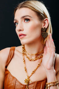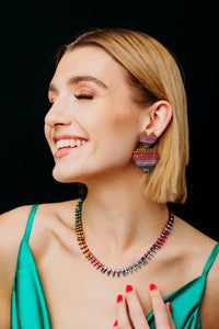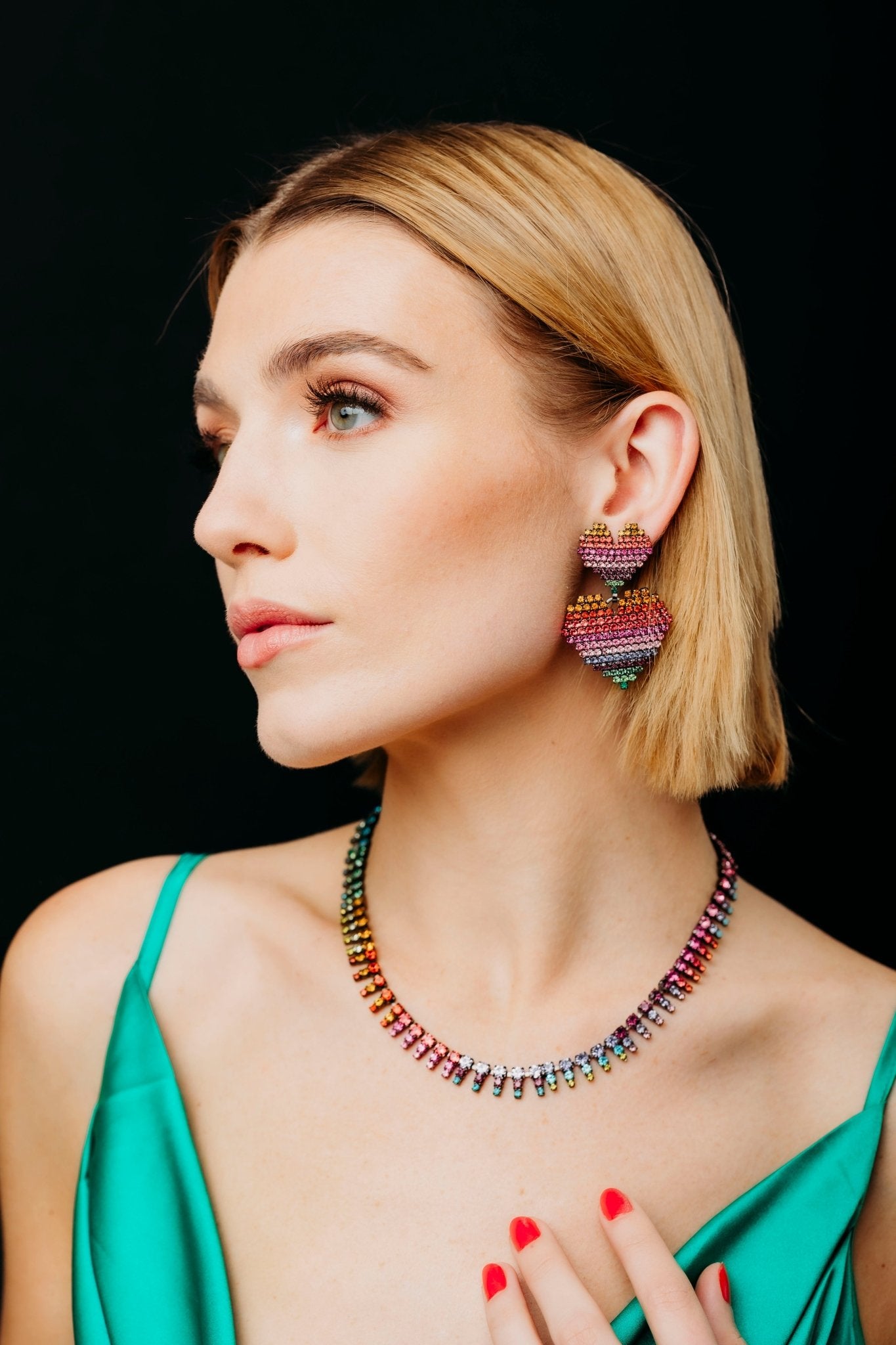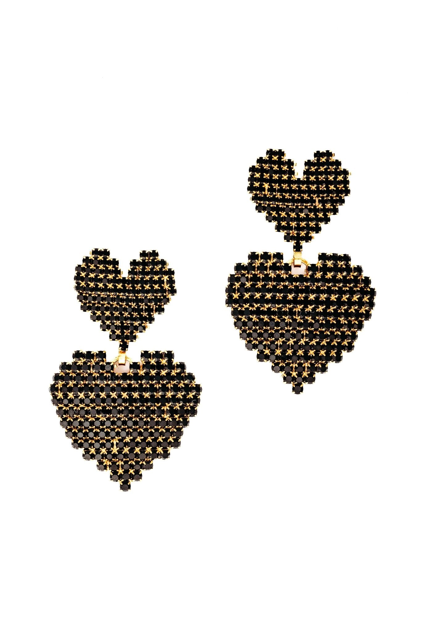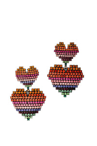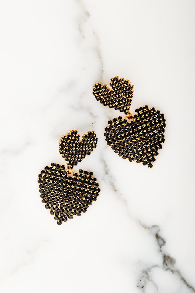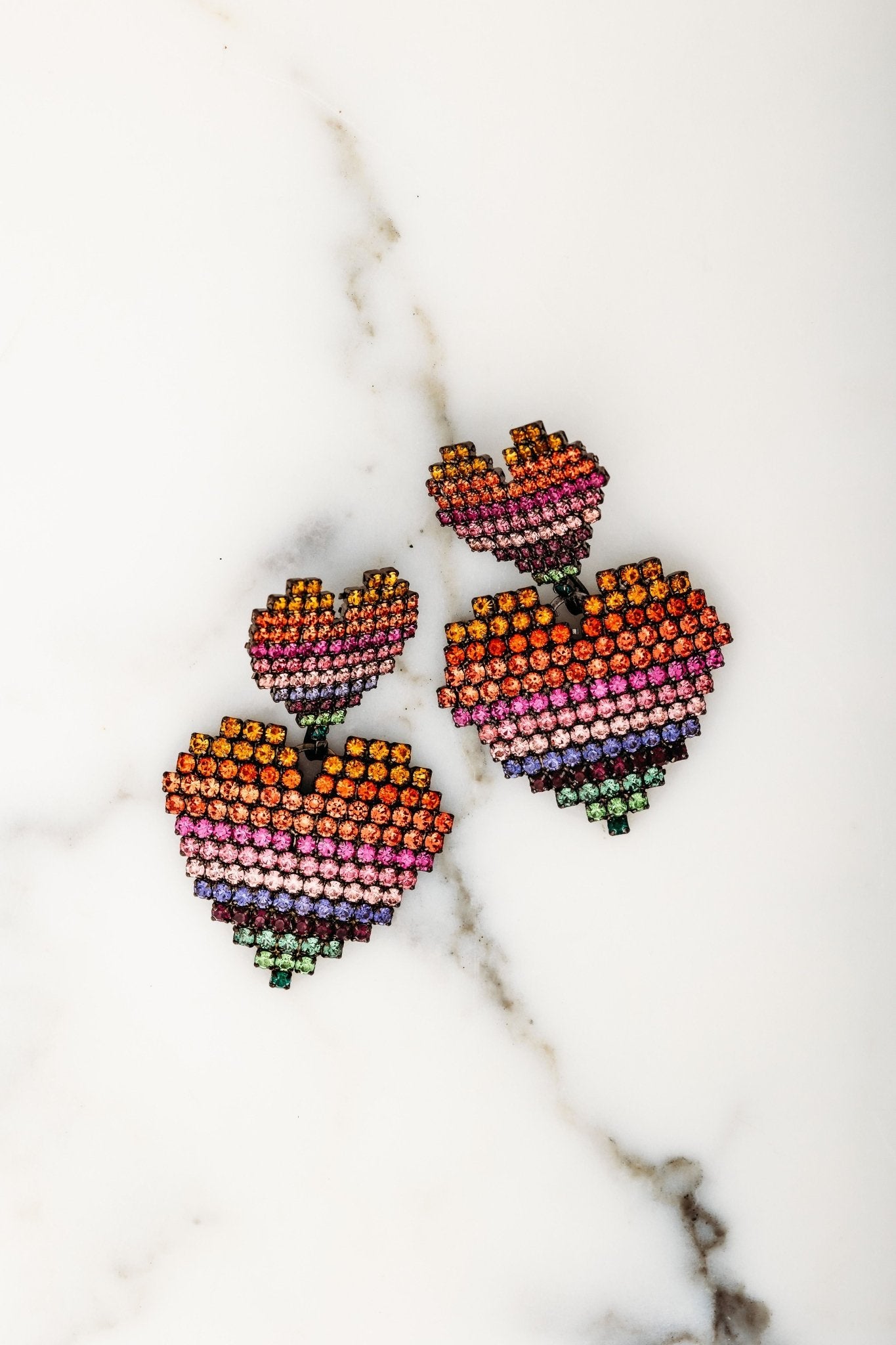 Stay sparkling in our Abby Earrings! These dazzling double heart earrings feature two sets of graduated hearts for a show-stopping look. Choose between breathtaking rainbow and classic jet Czech Crystals, both shimmering with the highest quality. Styled and made with love in the USA. Look and feel your best with Abby Earrings! 24kt Gold Plate or Hematite Plate, Post Closure, Made in the USA.
