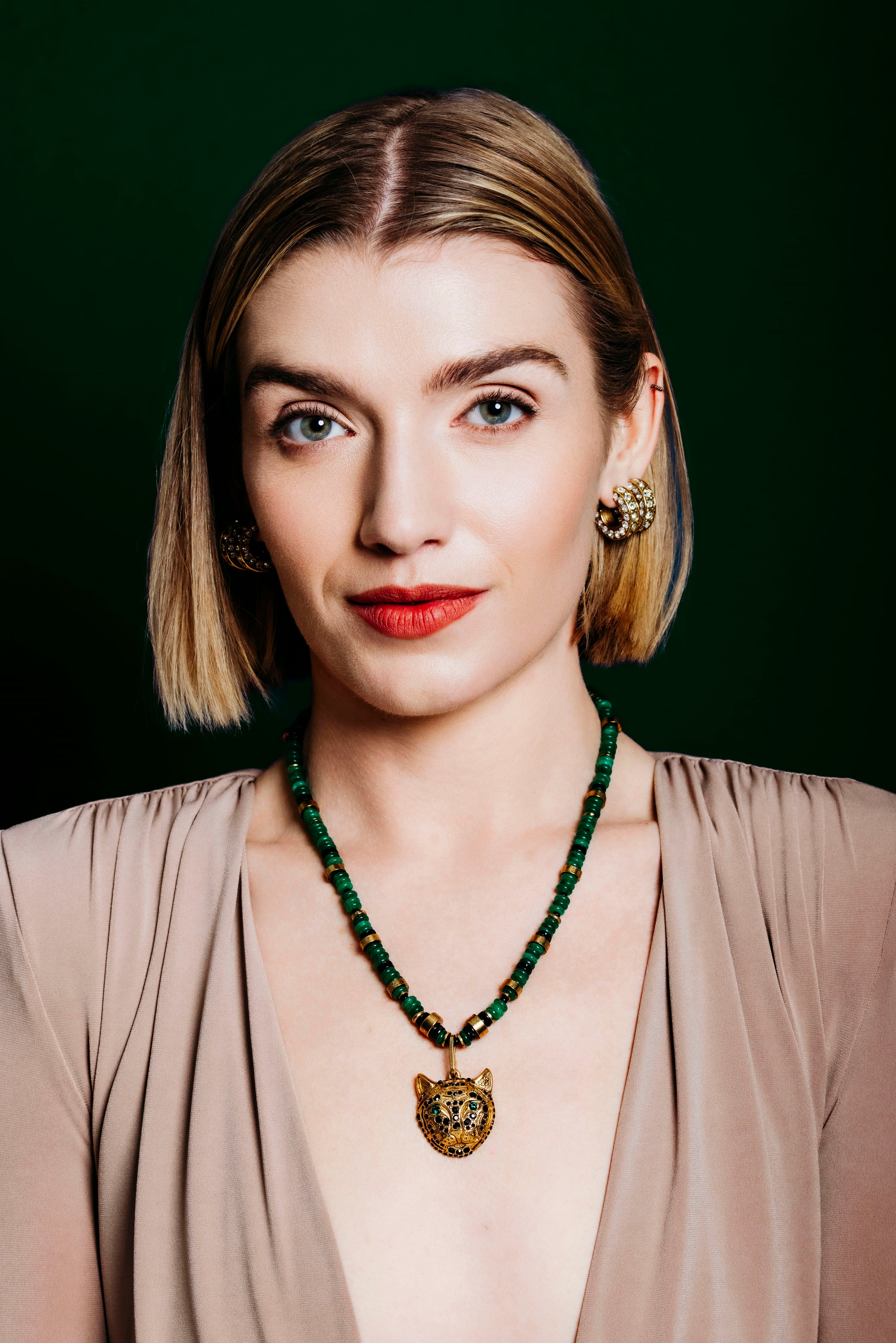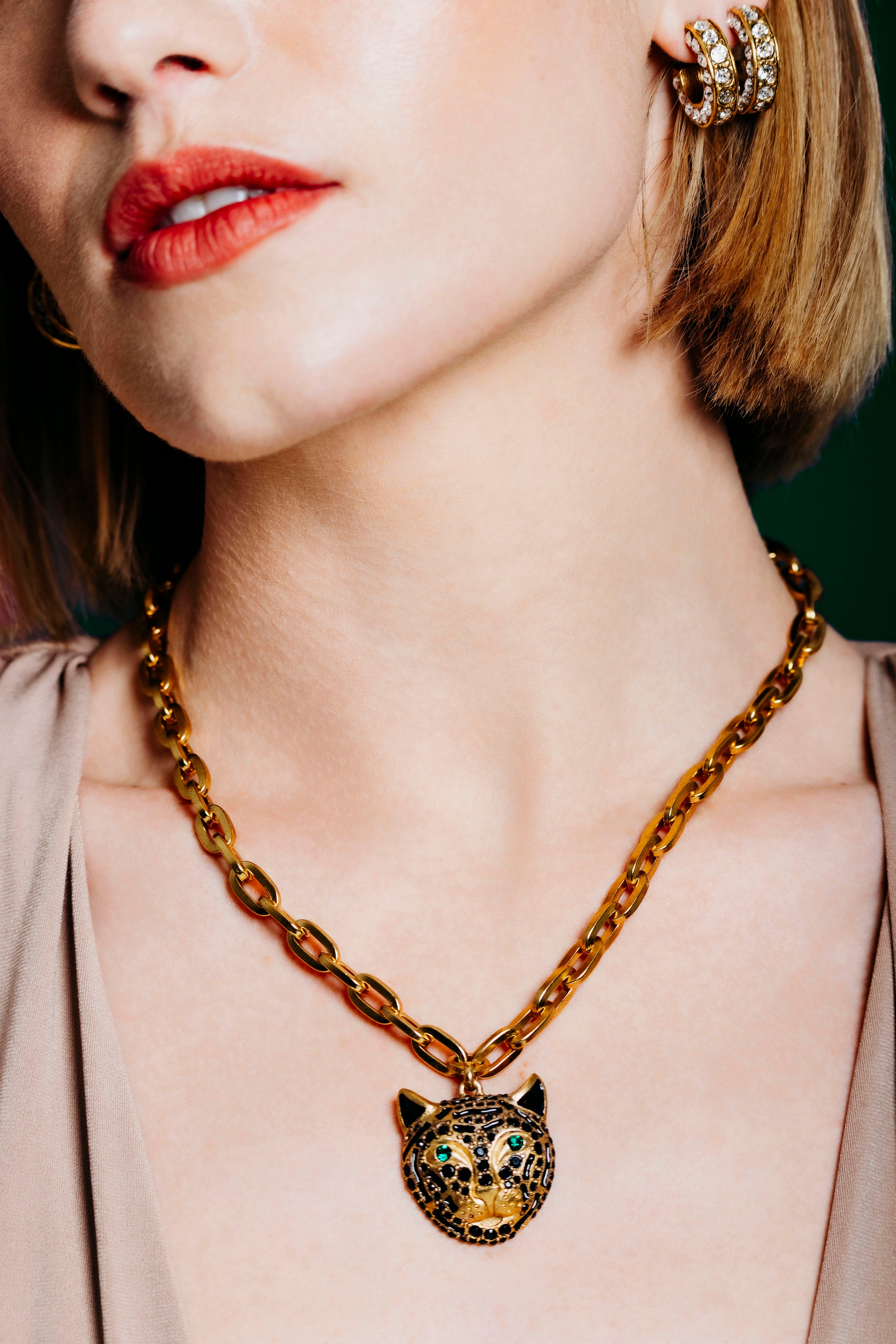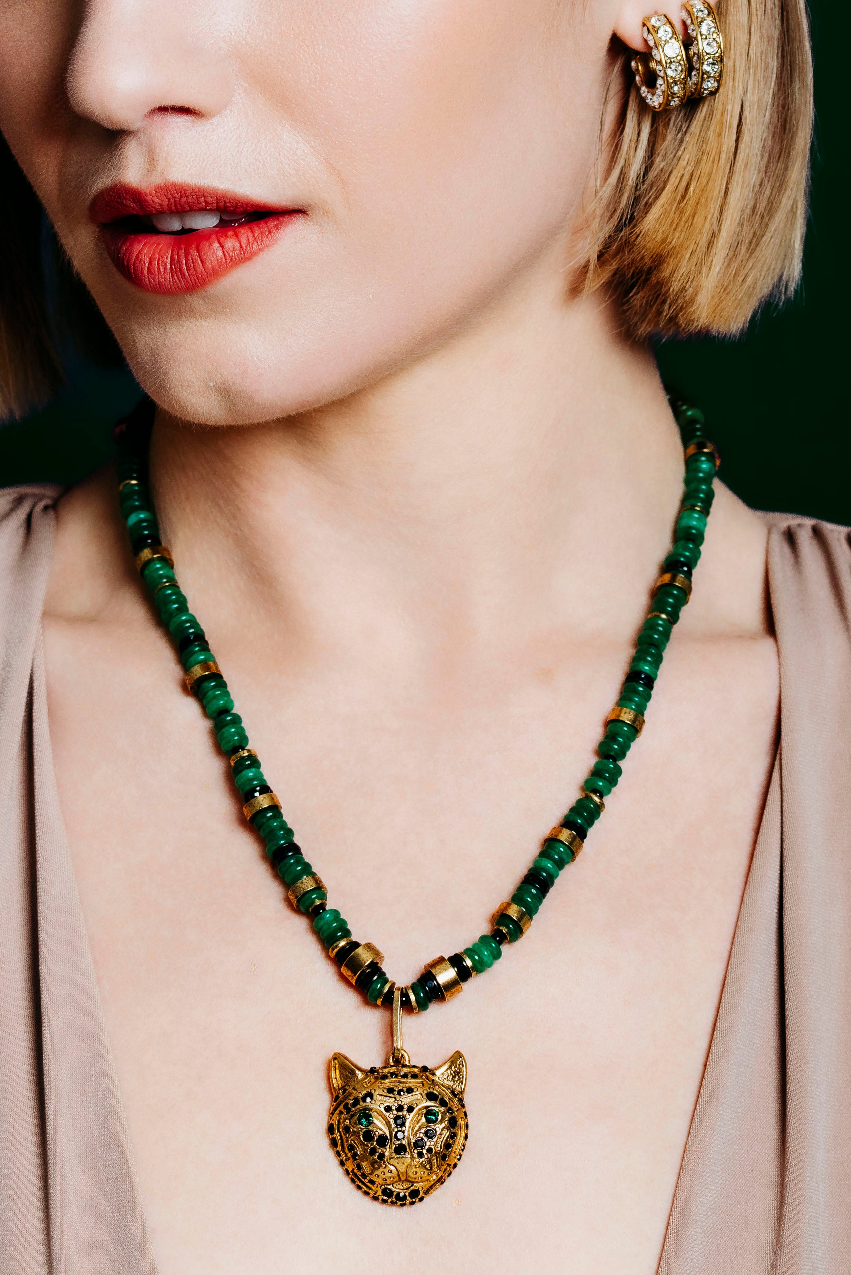 The Shere Necklace boldly blends a glass jade disc bead neck with sleek black onyx, accented by radiant gold rondells and black crystal rondell spacers. Its fierce tiger head charm, detailed with black enamel, fiery orange crystals, and vivid green crystal eyes, makes a striking statement that empowers your fearless style.24K Gold Plated.Swarovski Crystals. Lobster Claw Closure. Handcrafted Proudly in the U.S.A