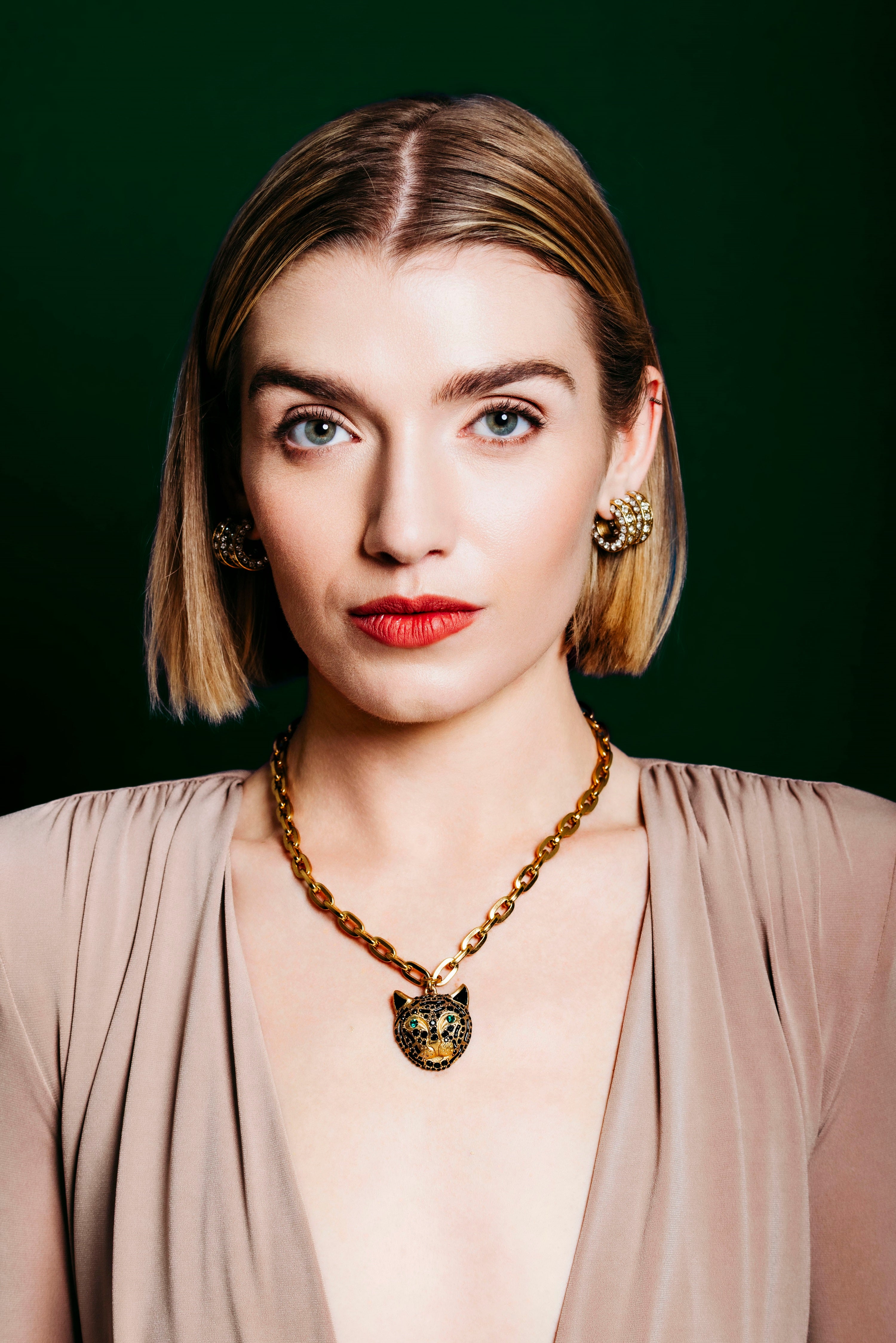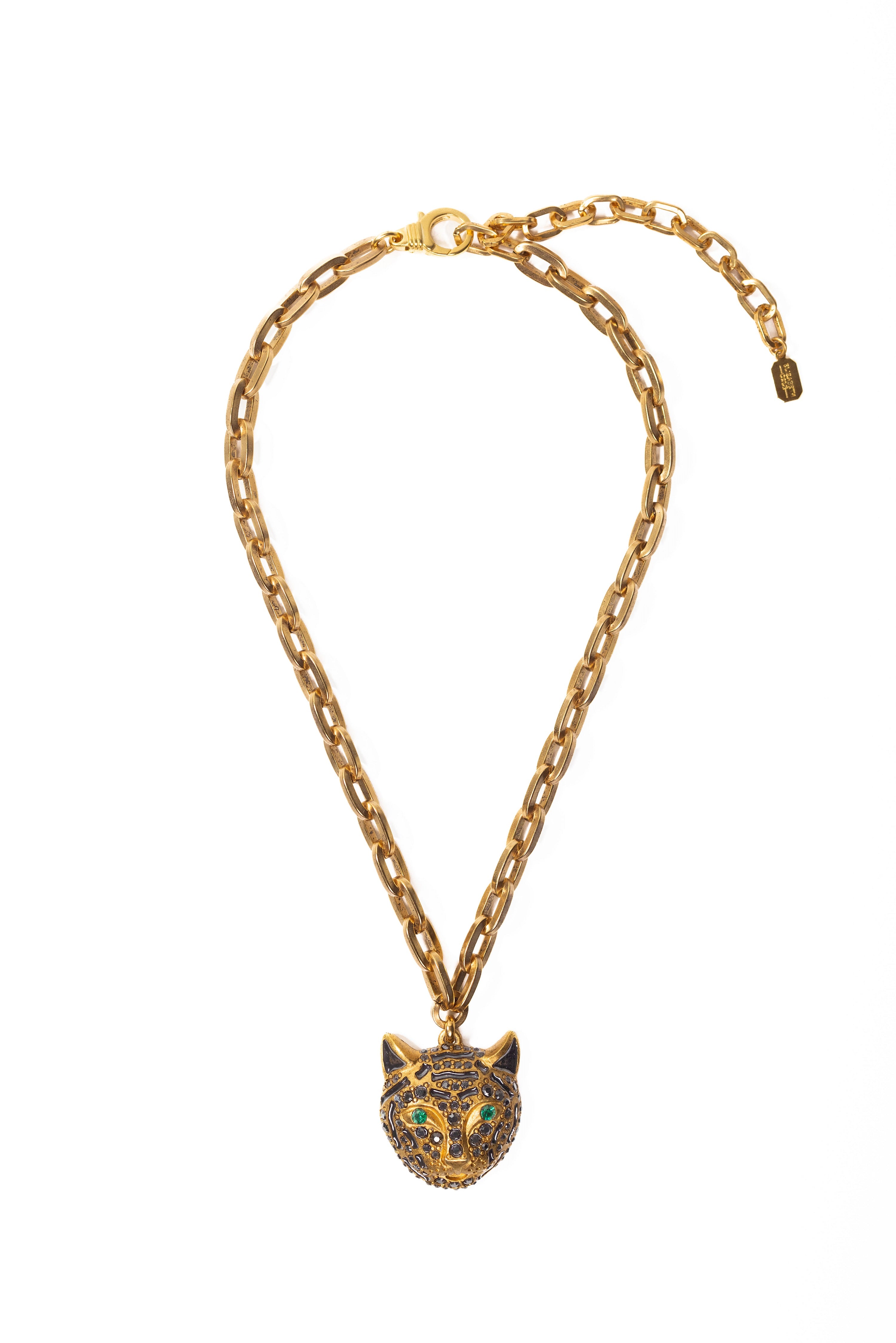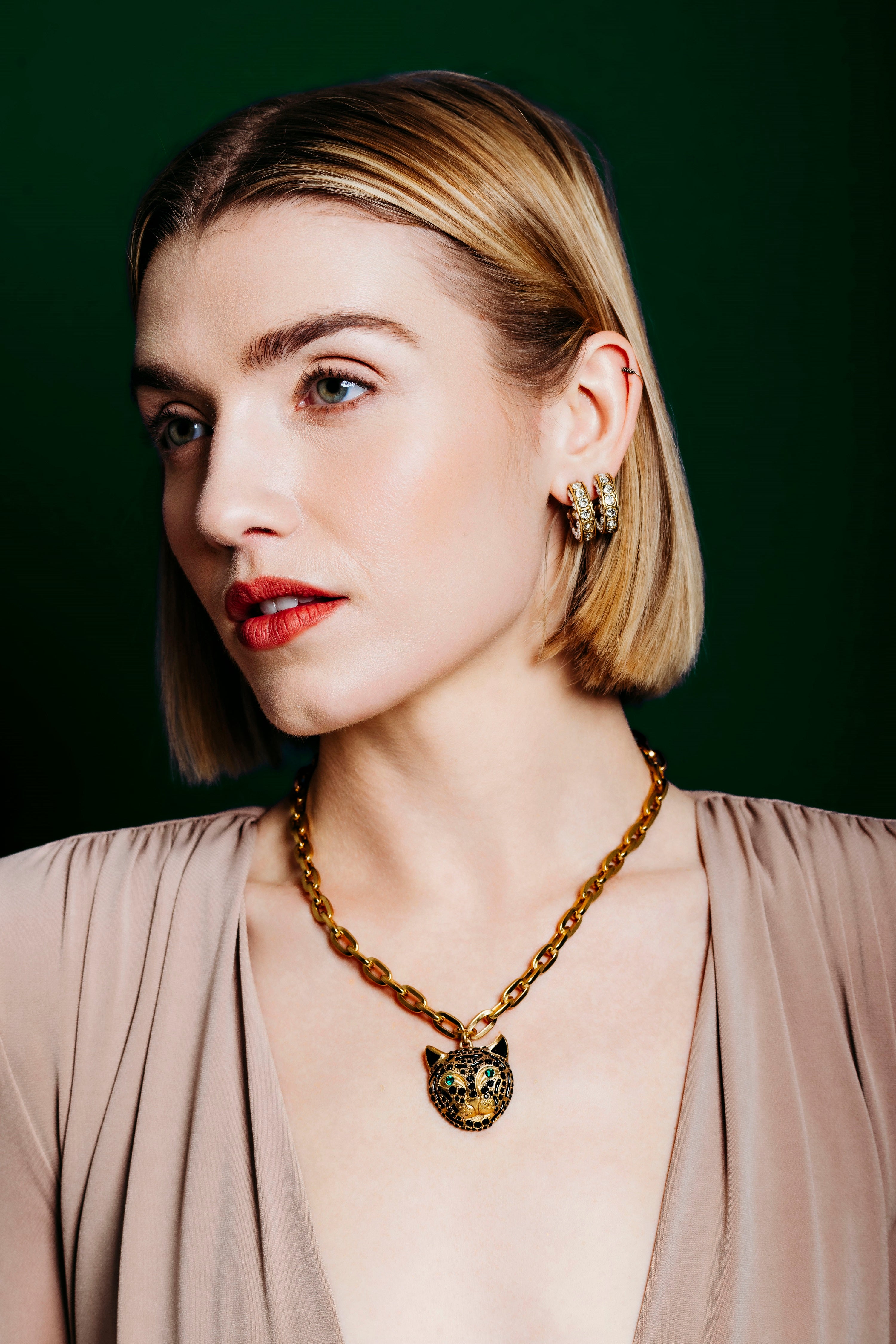 The Shere Necklace boldly blends a glass jade disc bead neck with sleek black onyx, accented by radiant gold rondells and black crystal rondell spacers. Its fierce tiger head charm, detailed with black enamel, fiery orange crystals, and vivid green crystal eyes, makes a striking statement that empowers your fearless style.24K Gold Plated.Swarovski Crystals. Lobster Claw Closure. Handcrafted Proudly in the U.S.A