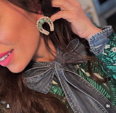 Giving a nod to our Western roots, we've embraced a traditional Horseshoe Earrings featuring a hand blown turquoise matrix stone atop clusters of brilliant crystals. As we are making these to order, select if you'd like a gold or silver finish (pictured in gold finish)