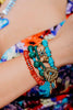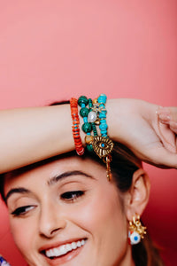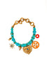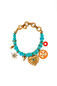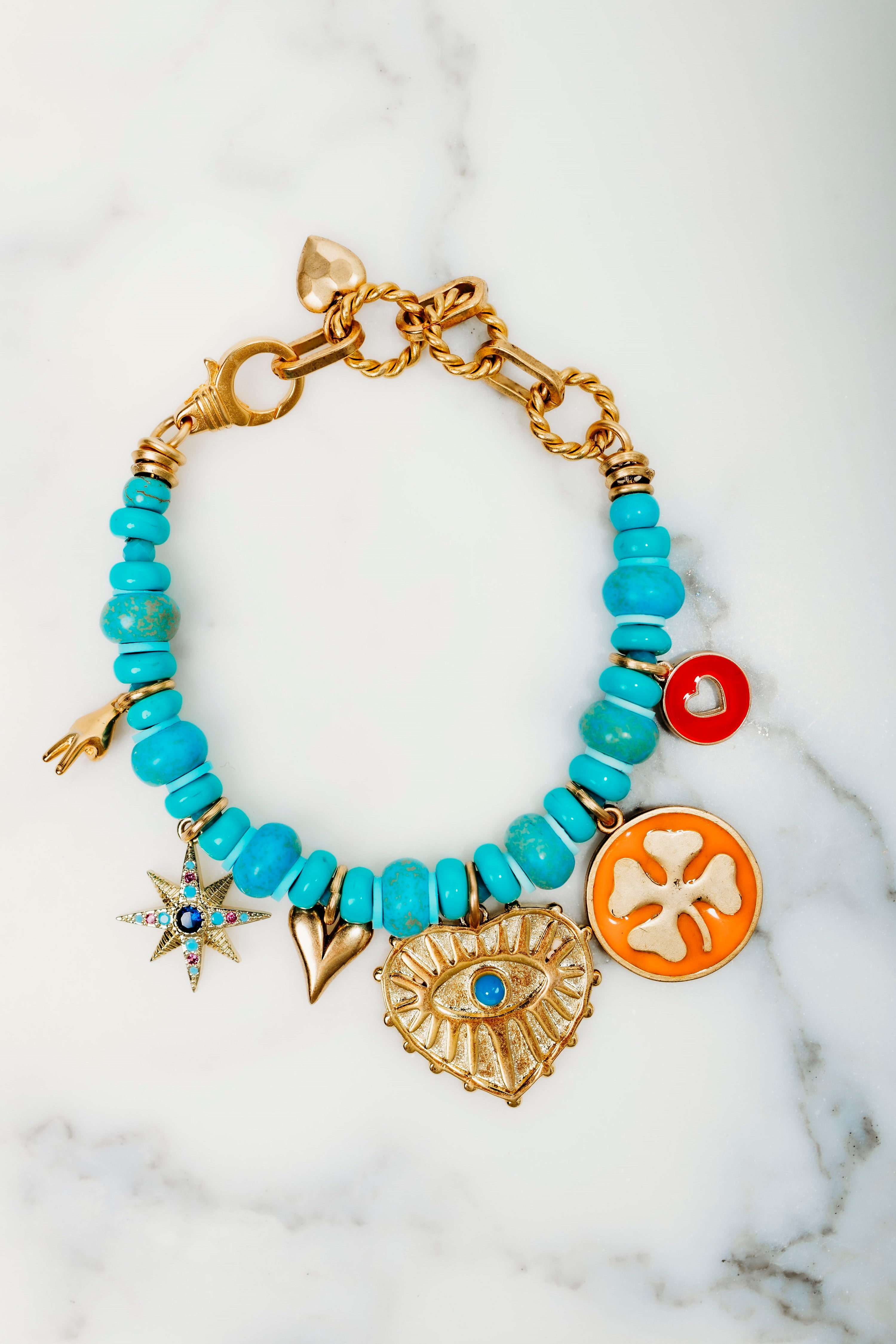 Add some eclectic style to your outfits with the Bellatrix Bracelet. Featuring faux howlite turquoise and acrylic beads, this bracelet is adorned with various charms including a large evil eye heart charm, orange enamel round clover charm, peace sign, cut out small red enamel heart charm, small puffy heart charm, and star charm with premium crystals. Show off your unique personality with this playful and eye-catching accessory. 24k Gold Plated