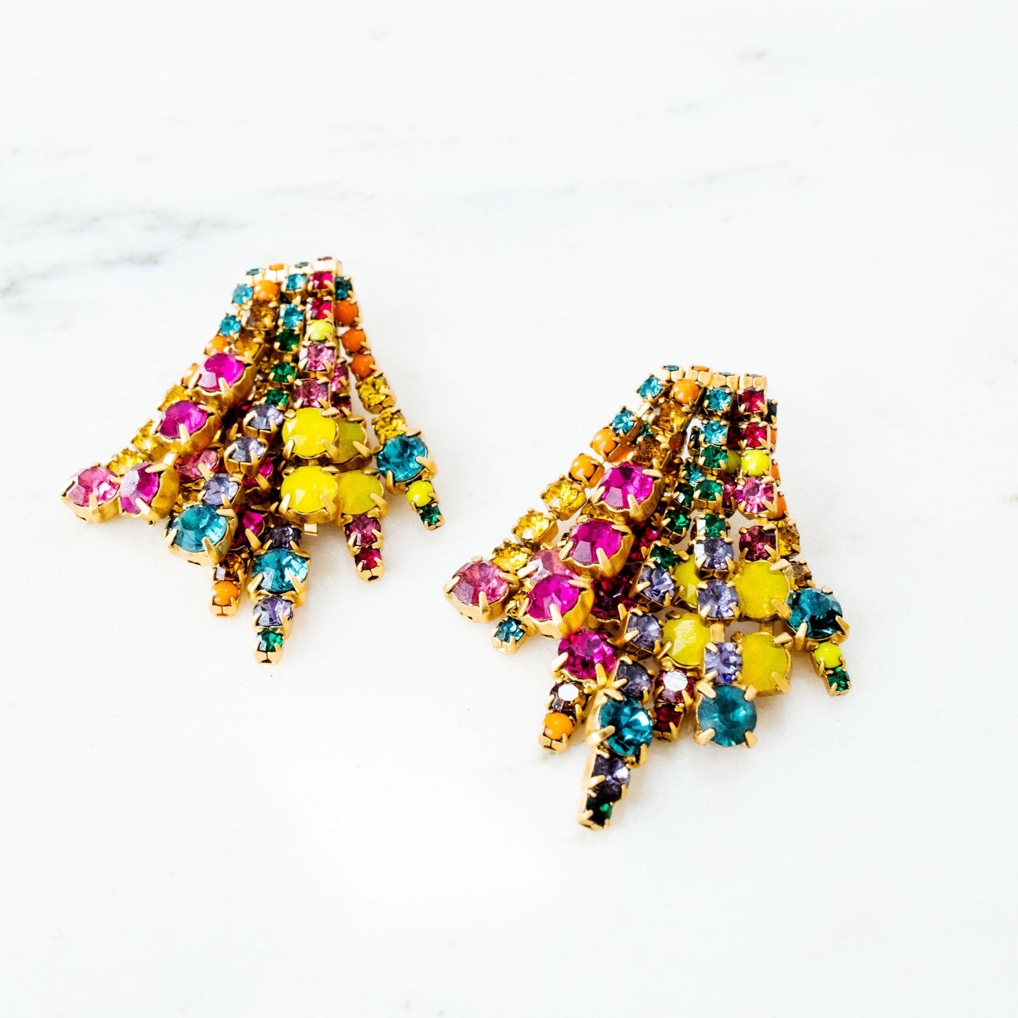 An explosion of color makes the Bette Earrings a personal favorite at Elizabeth Cole. Featuring a rainbow of different colored stones, these earrings are perfect for your Zoom Calls or a socially distant date! Swarovski Crystals, 24kt Gold Plate, Post Closure, Proudly Made in the USA.