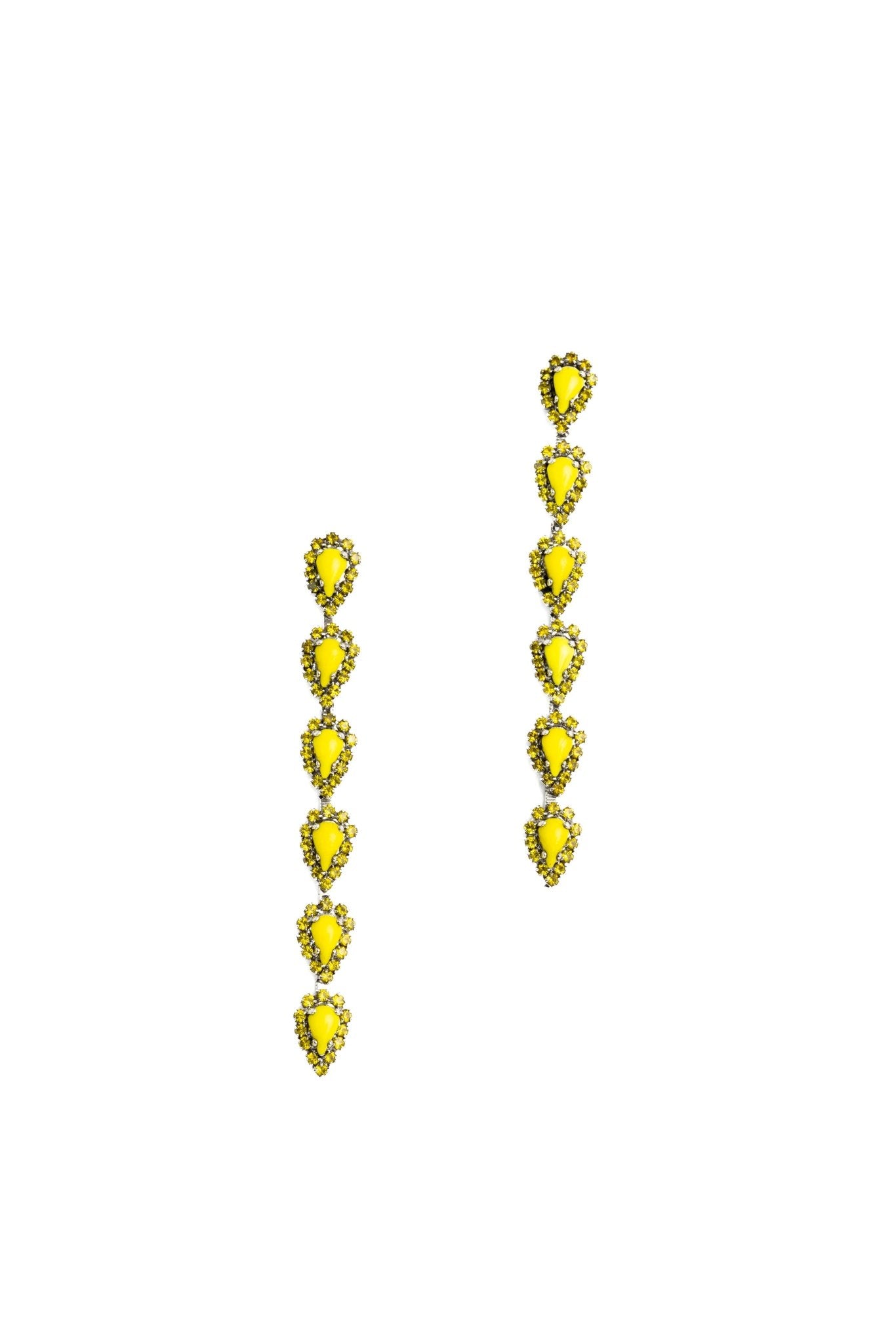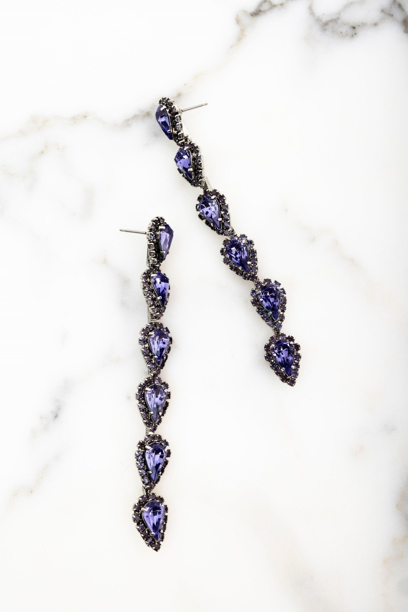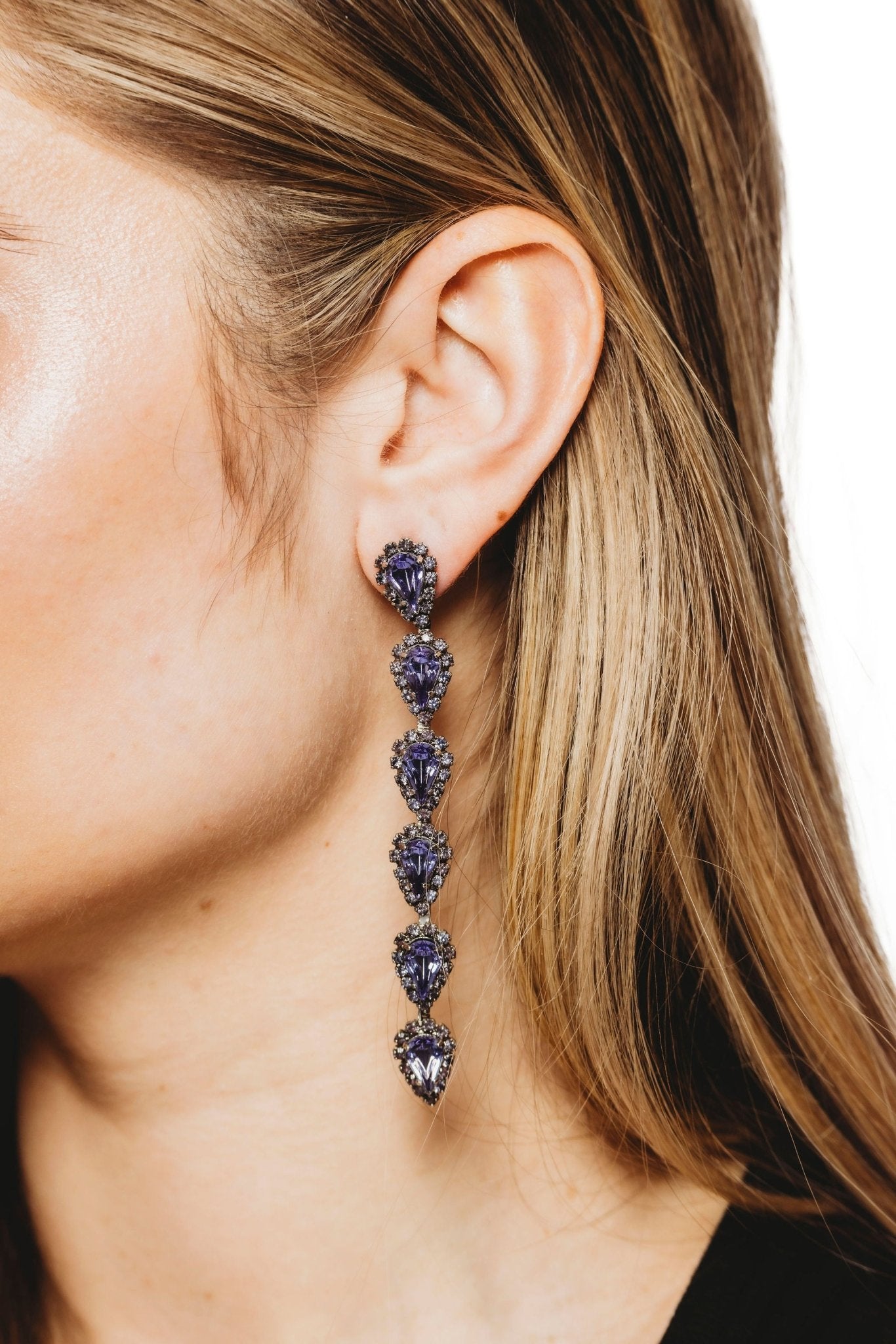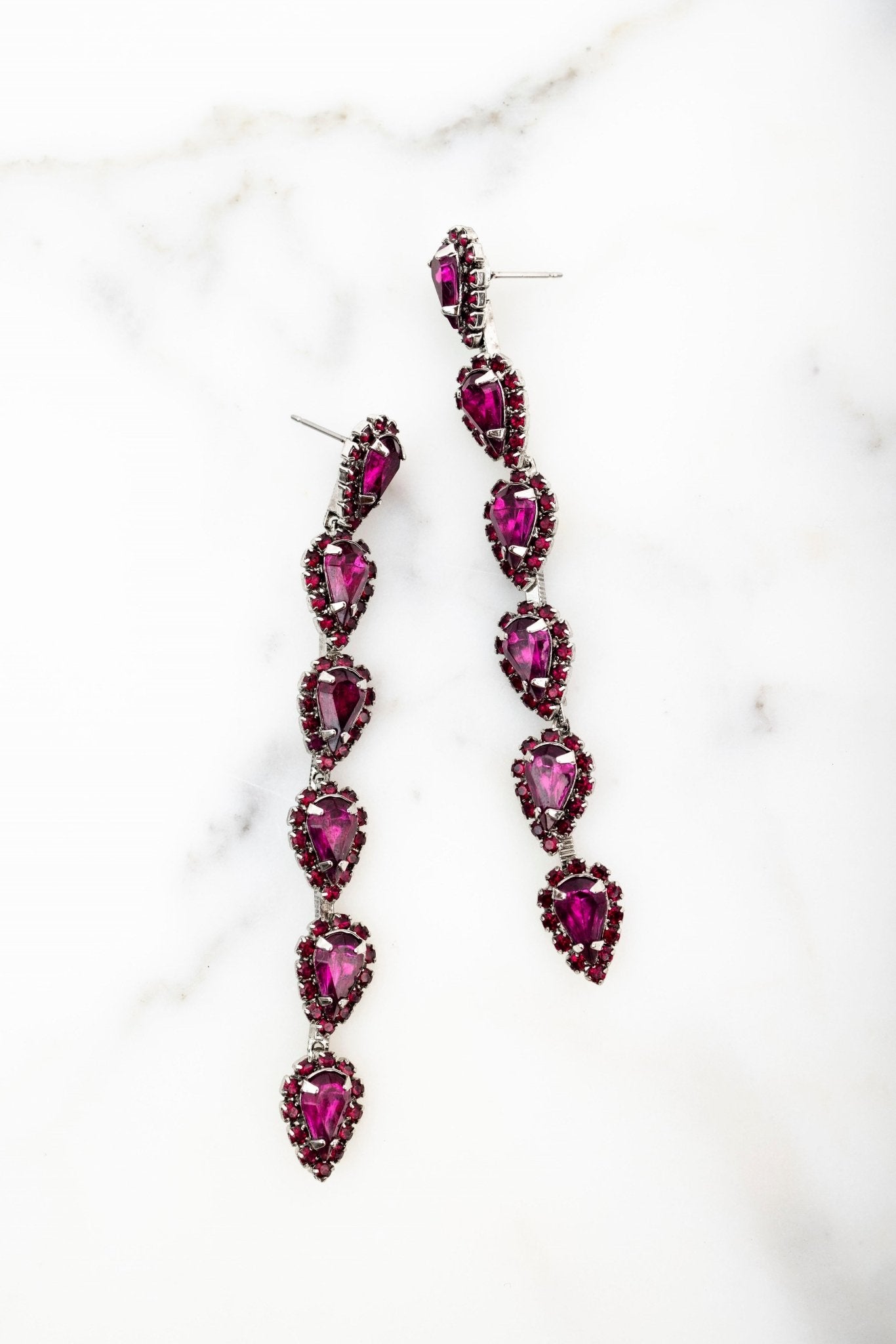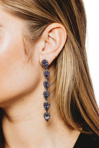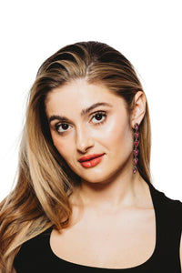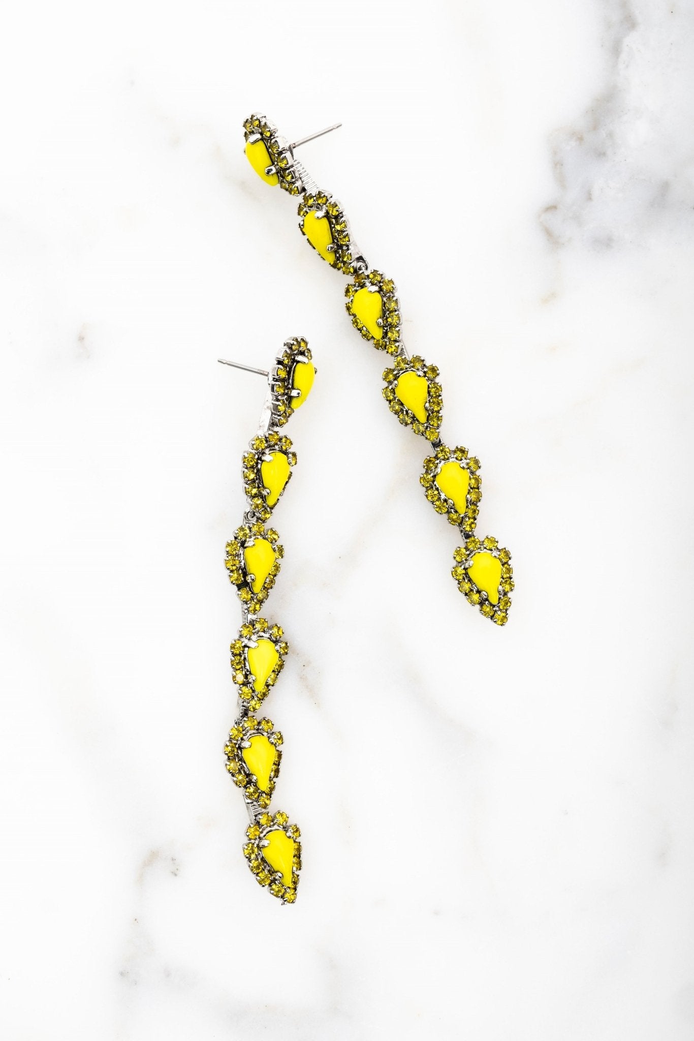 Add some playful sparkle to your look with our Catríona Earrings! These long linnear earrings feature a collection of glittering petite pears, surrounded by crystal details. Available in a variety of colors such as classic crystal, pink, black, turquoise, purple, and yellow. Perfect for adding a touch of whimsy to any outfit.