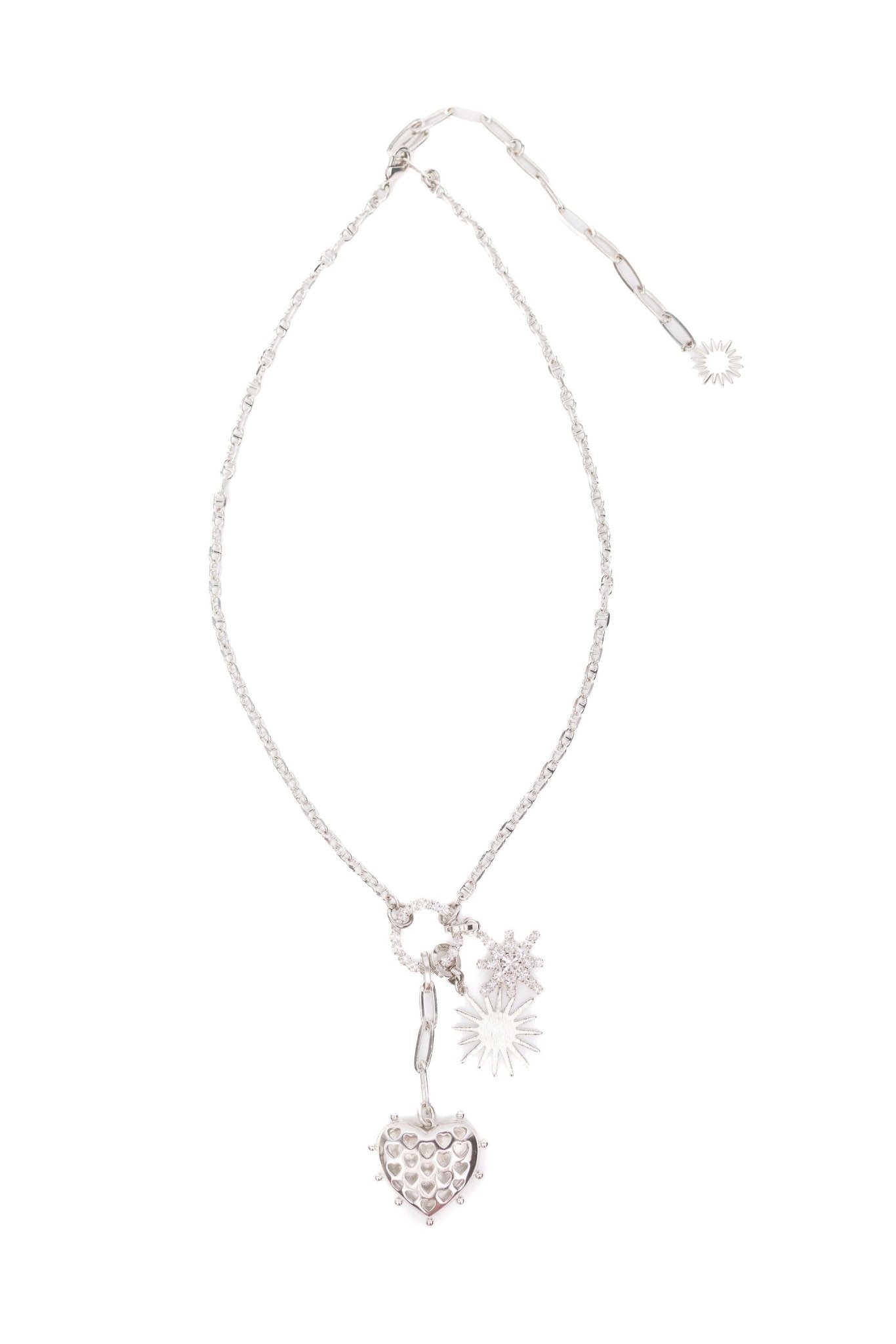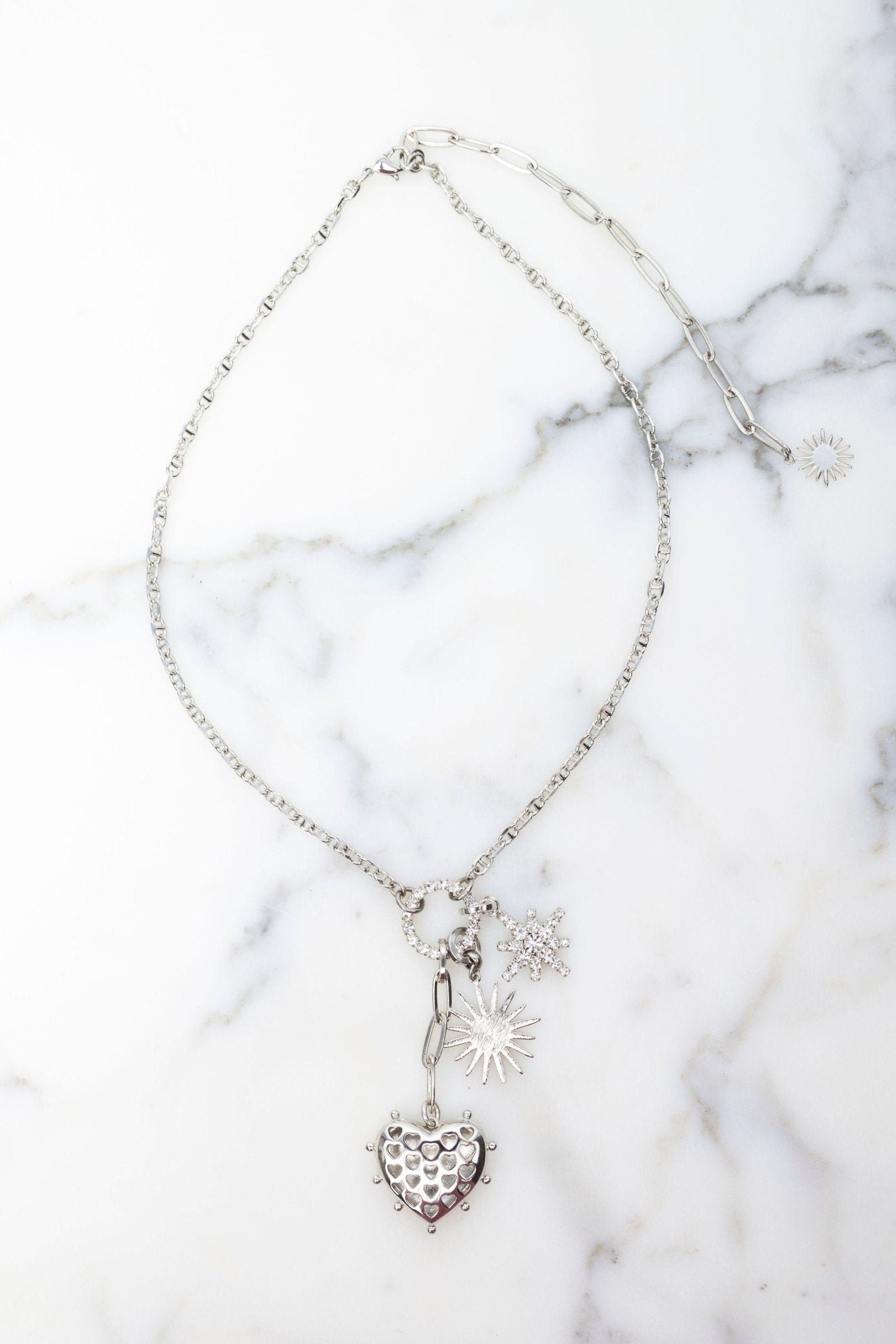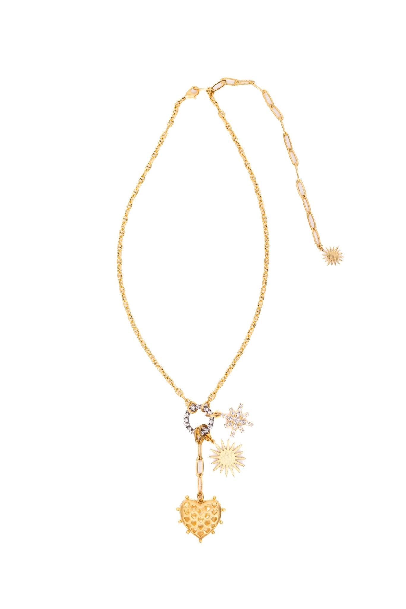 The Cerelia Necklace is a playful twist on our popular Roxanne design. Featuring a perforated heart with charming golden and crystal stars, this necklace is available in both gold and silver finishes. Add a touch of whimsy to any outfit with the Cerelia Necklace. Swarovski Crystals. 24K Gold Plated or Imitation Rhodium Plate. Lobster Claw Closure. Made in the U.S.A.