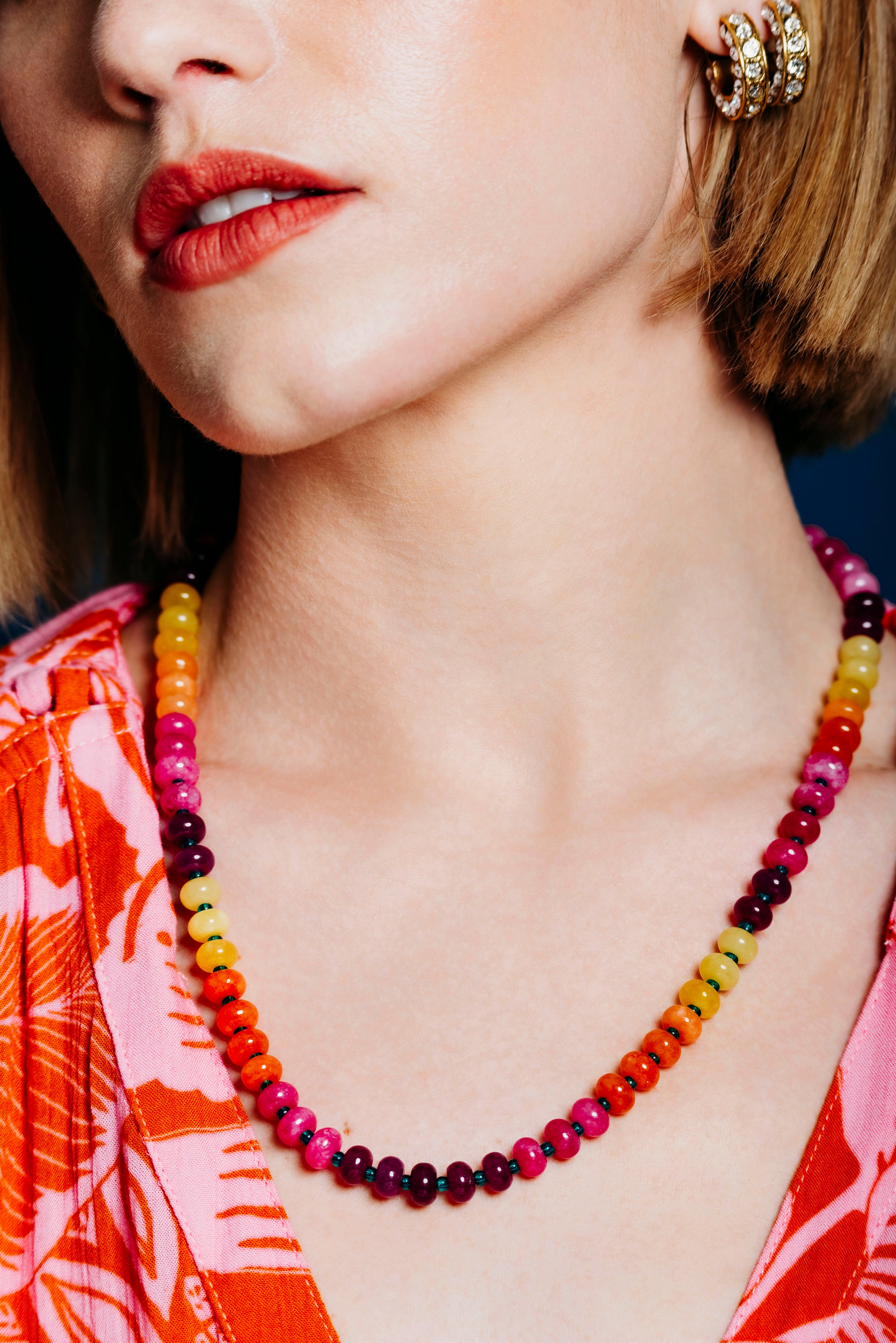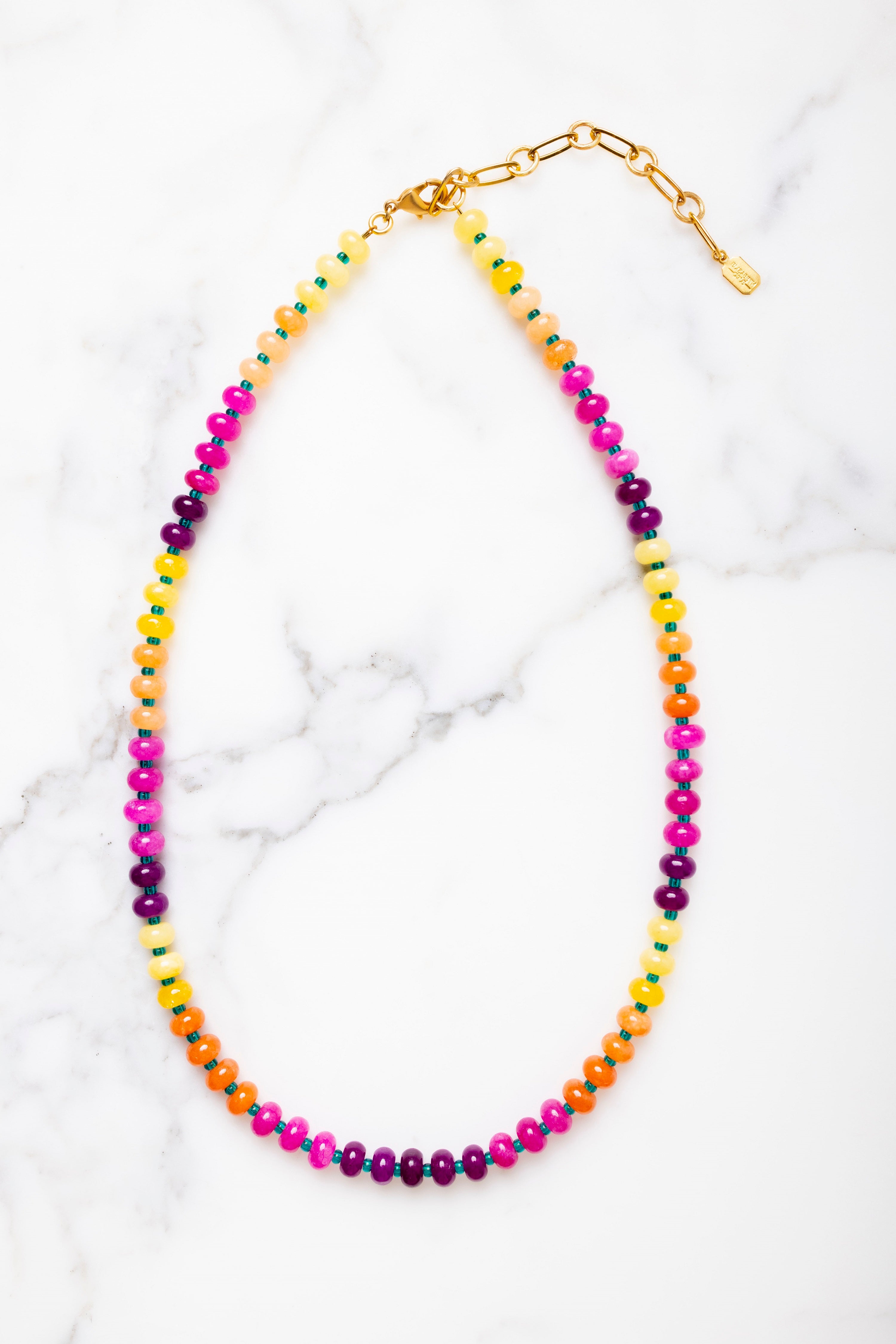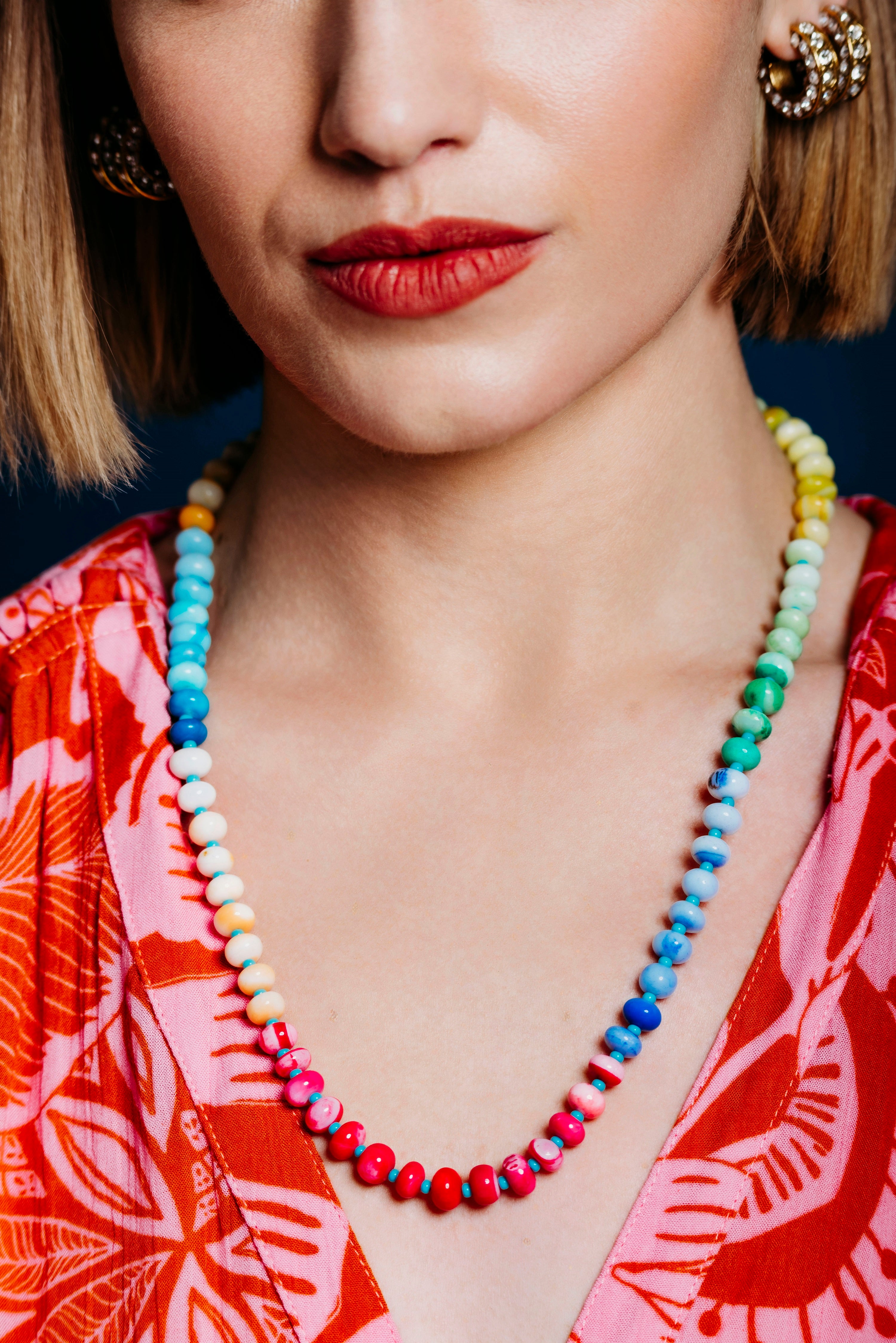 The Chancina Necklace is a vibrant celebration of color and craftsmanship. Strung with an eye-catching mix of beads in rich autumnal oranges, warm golds, or cool blues, this playful piece brings instant personality to any outfit. Each bead is carefully selected to create a harmonious blend of hues that transitions beautifully from season to season. Proudly handcrafted in the USA, this necklace combines artisanal quality with a fun, eclectic spirit—perfect for anyone who loves to make a colorful statement.