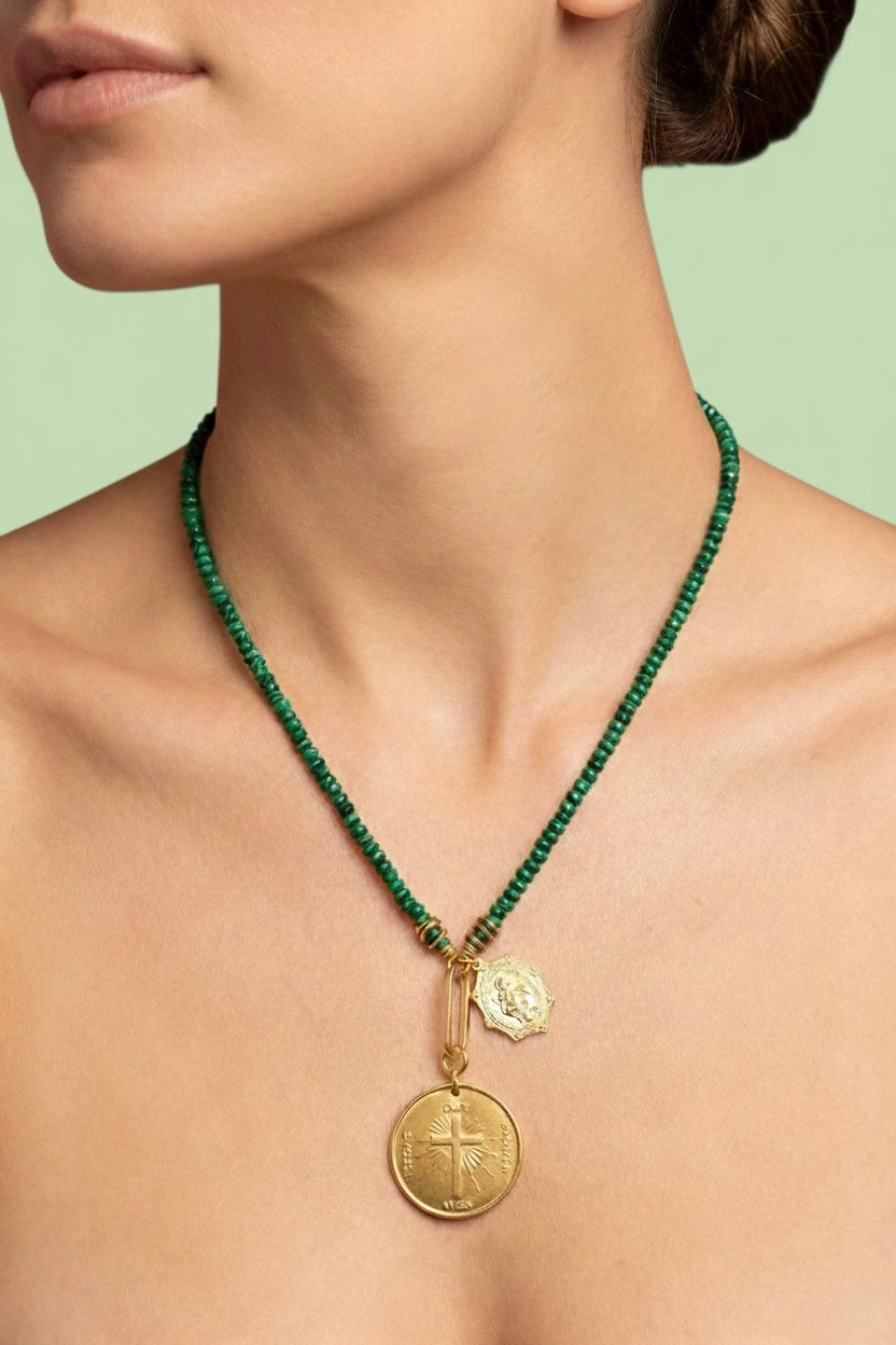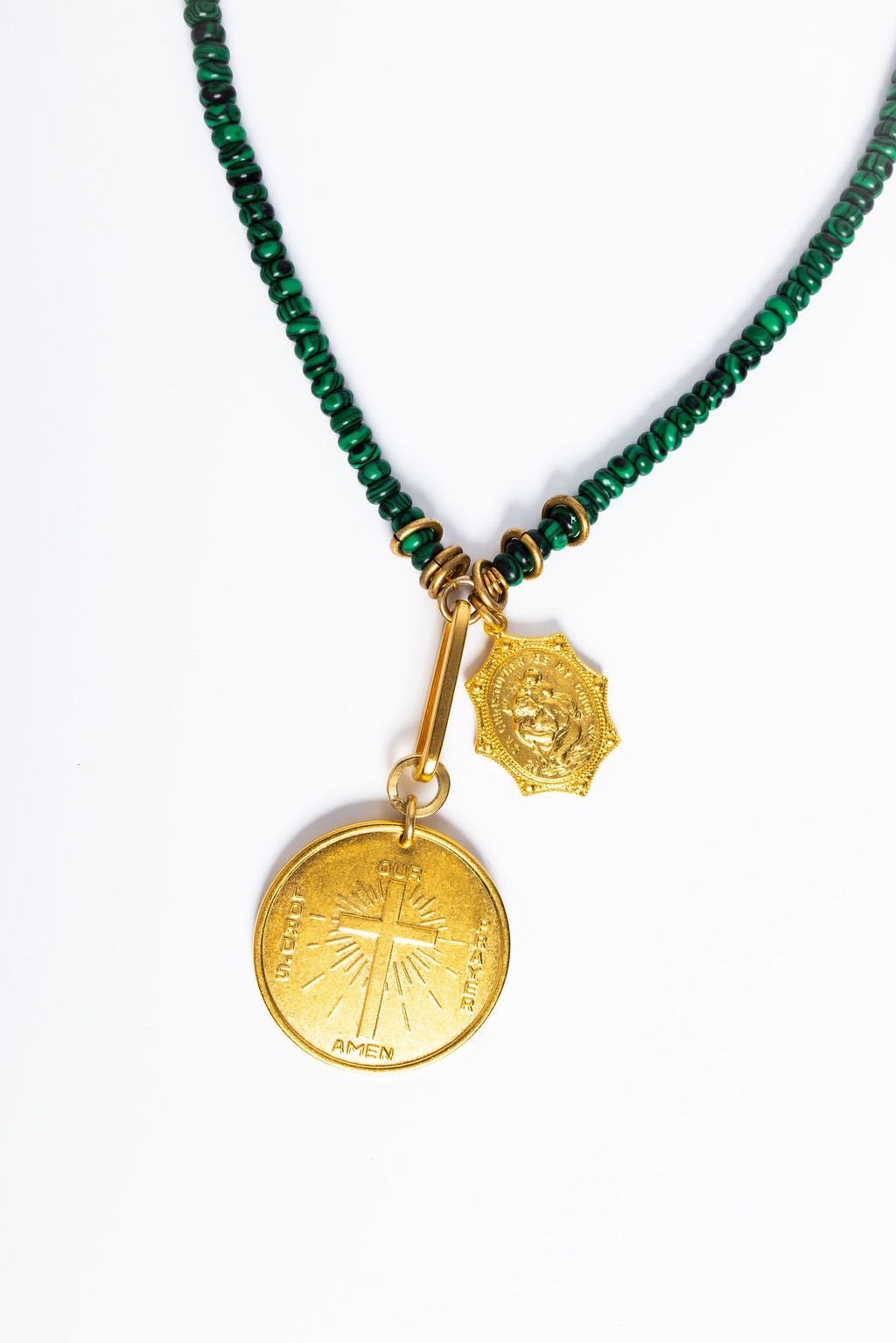 Embrace spiritual elegance with the Christiana Necklace, a meaningful piece that combines natural beauty with faith-inspired design. This striking necklace features rich faux malachite beads that create a luxurious foundation, paired with a bold Lords Prayer disc charm and a scalloped St. Christopher charm—both accented with gold rings. Perfect for layering or wearing solo, this versatile necklace serves as a daily reminder of your beliefs while adding sophisticated style to any outfit. A thoughtful gift for yourself or someone special. 24K Gold Plate. Lobster Claw Closure. Proudly Handcrafted in the U.S.A