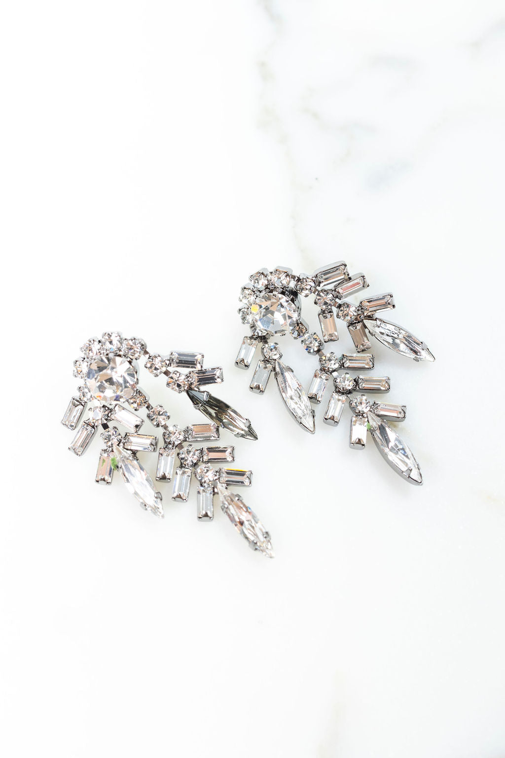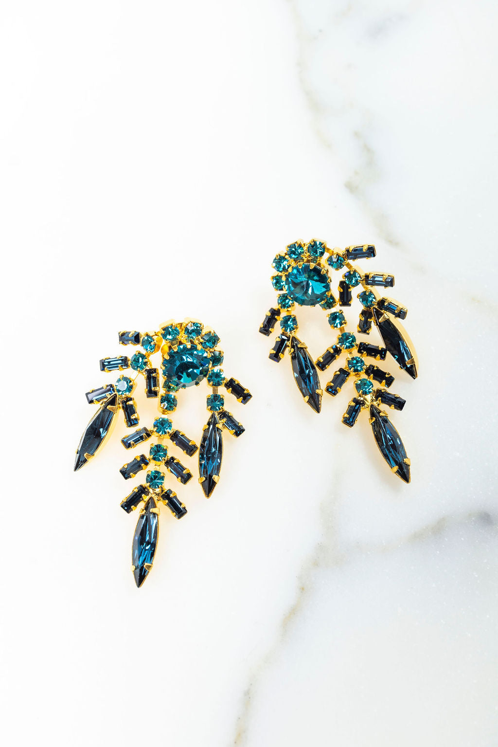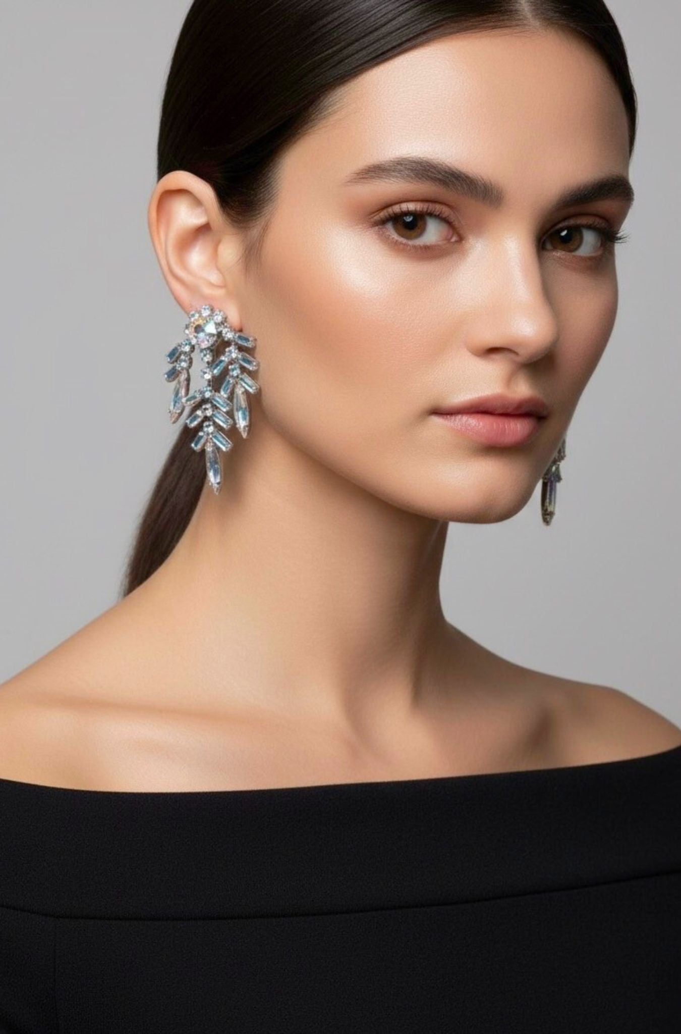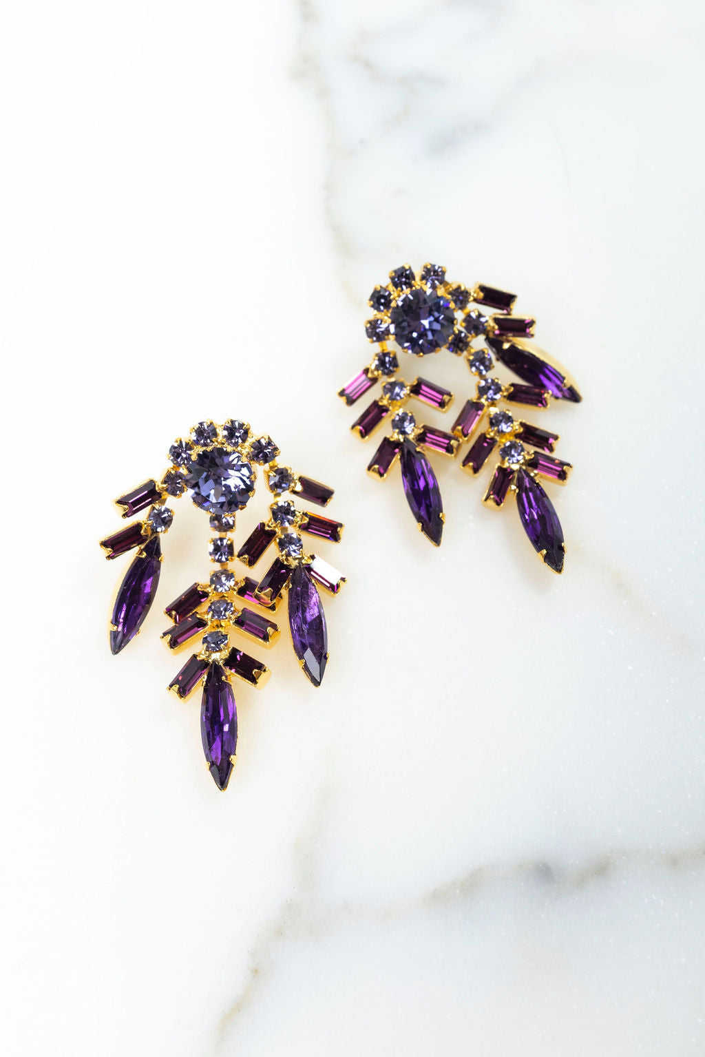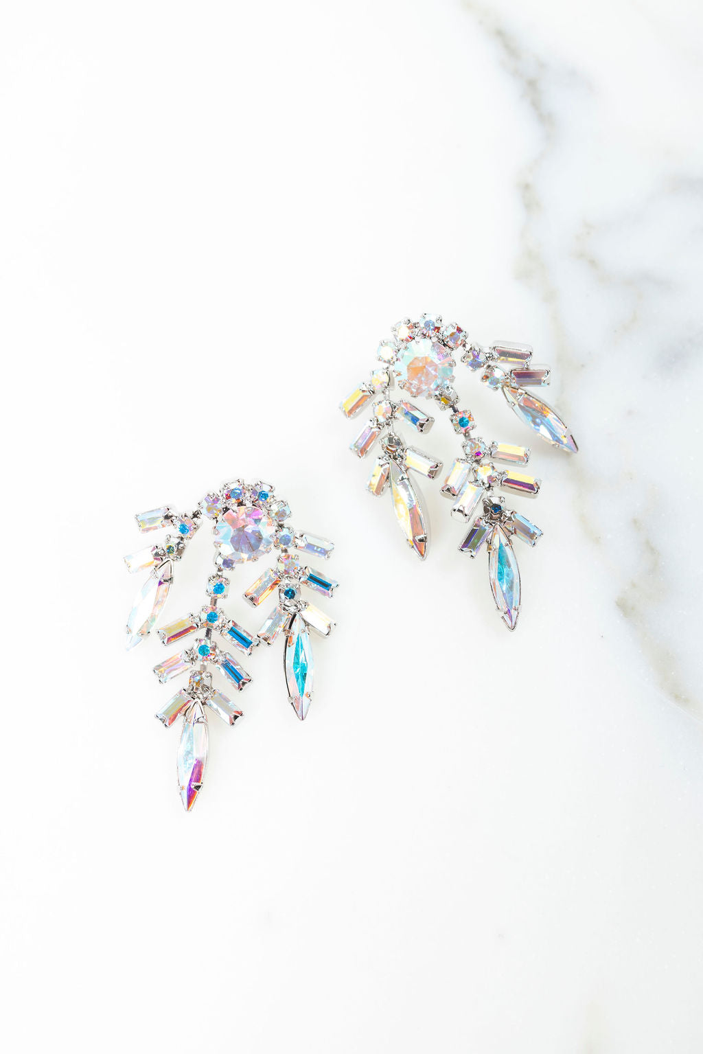 Elegant and versatile, the Clary Earrings feature a multi-shape crystal design with a round topper accented by a delicate semi-halo and graceful leaf-shaped dangles. Available in your choice of sparkling crystal, shimmering aurora borealis, soft blush, regal purple, or serene blue, these earrings add a refined touch to any ensemble. Perfect for elevating both everyday looks and special occasions with a subtle yet striking shimmer.24k Gold Plate, Rhodium Plate. Swarovski Crystals, Post Closure. Proudly Handcrafted in the U.S.A