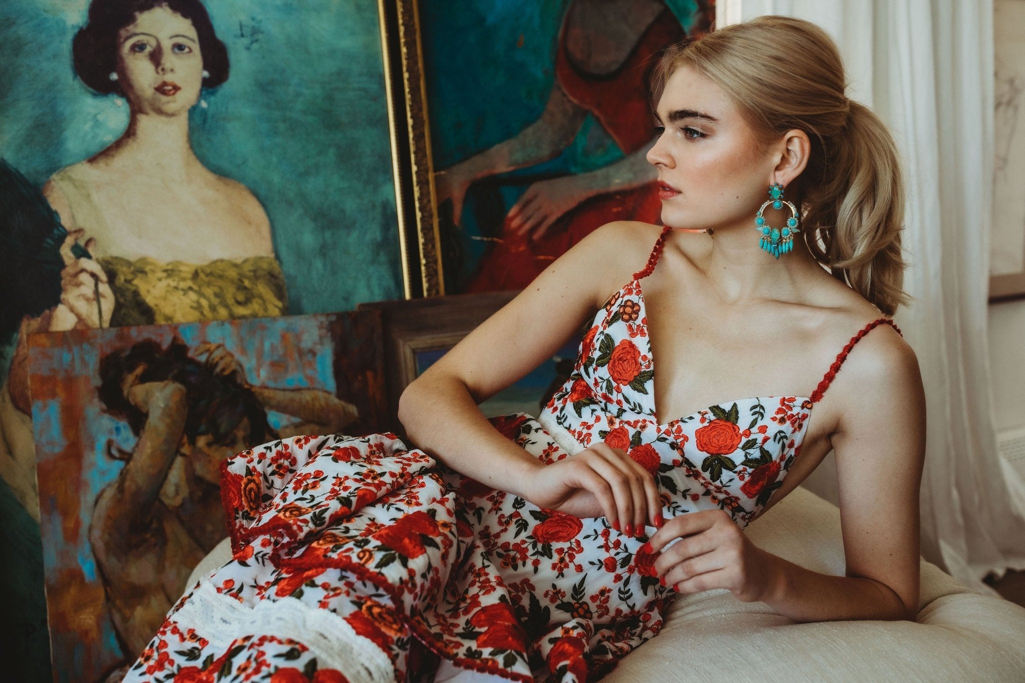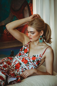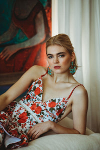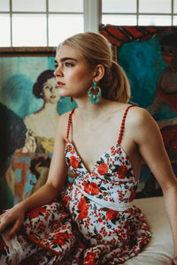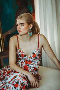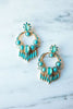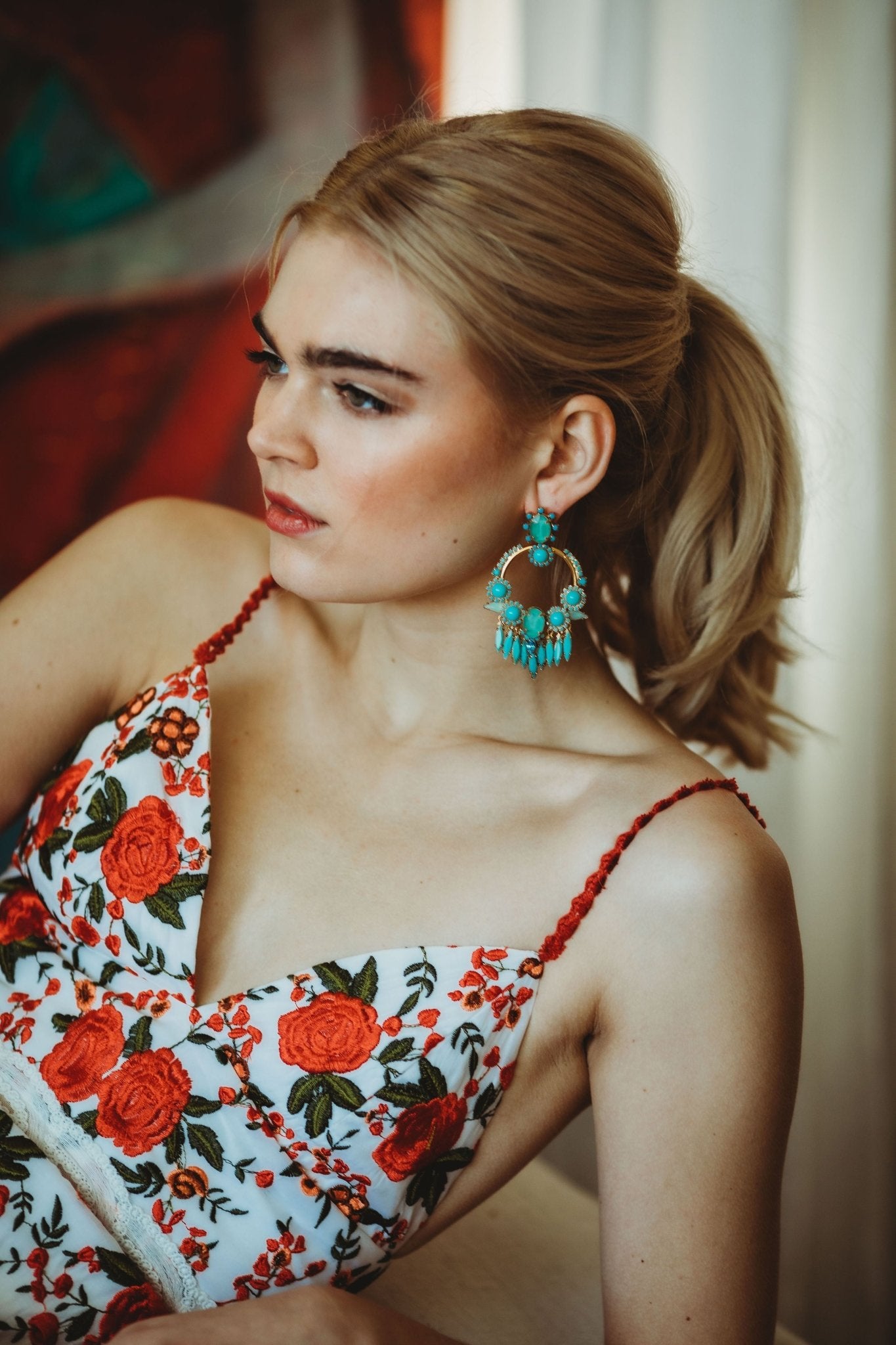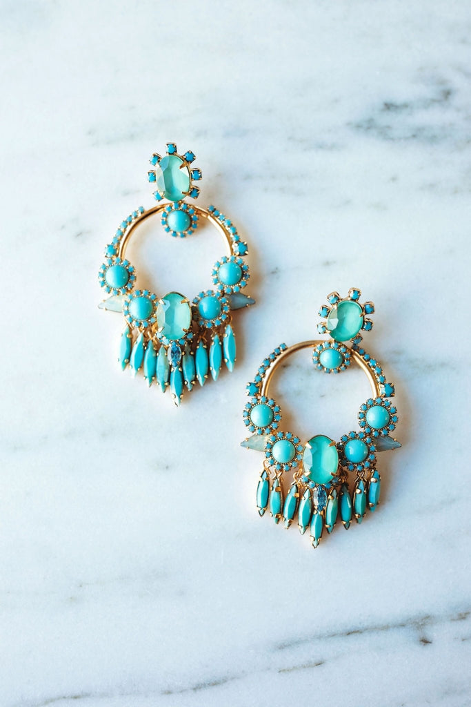 Make a statement with the Fiona Earrings, featuring a oval topper encircled by sparkling crystal or faux turquoise stones, resting elegantly above a stone-outlined hoop. Multi navette-shaped dangles complete the look, available in your choice of faux turquoise, aurora borealis, blush, or vintage glass jade stones. These earrings effortlessly blend bold design with vibrant color, perfect for adding a touch of glamour to any outfit.24K Gold Plate. Rhodium Plate. Swarvoski Crystals Post Closure. Proudly Handcrafted in the U.S.A