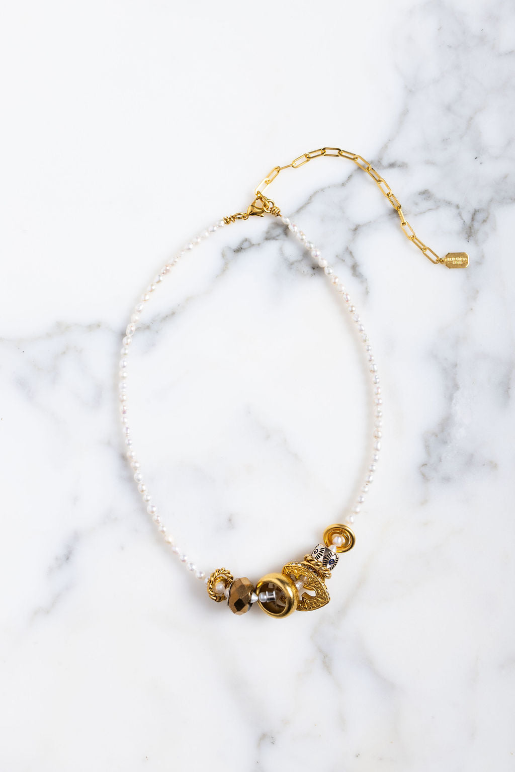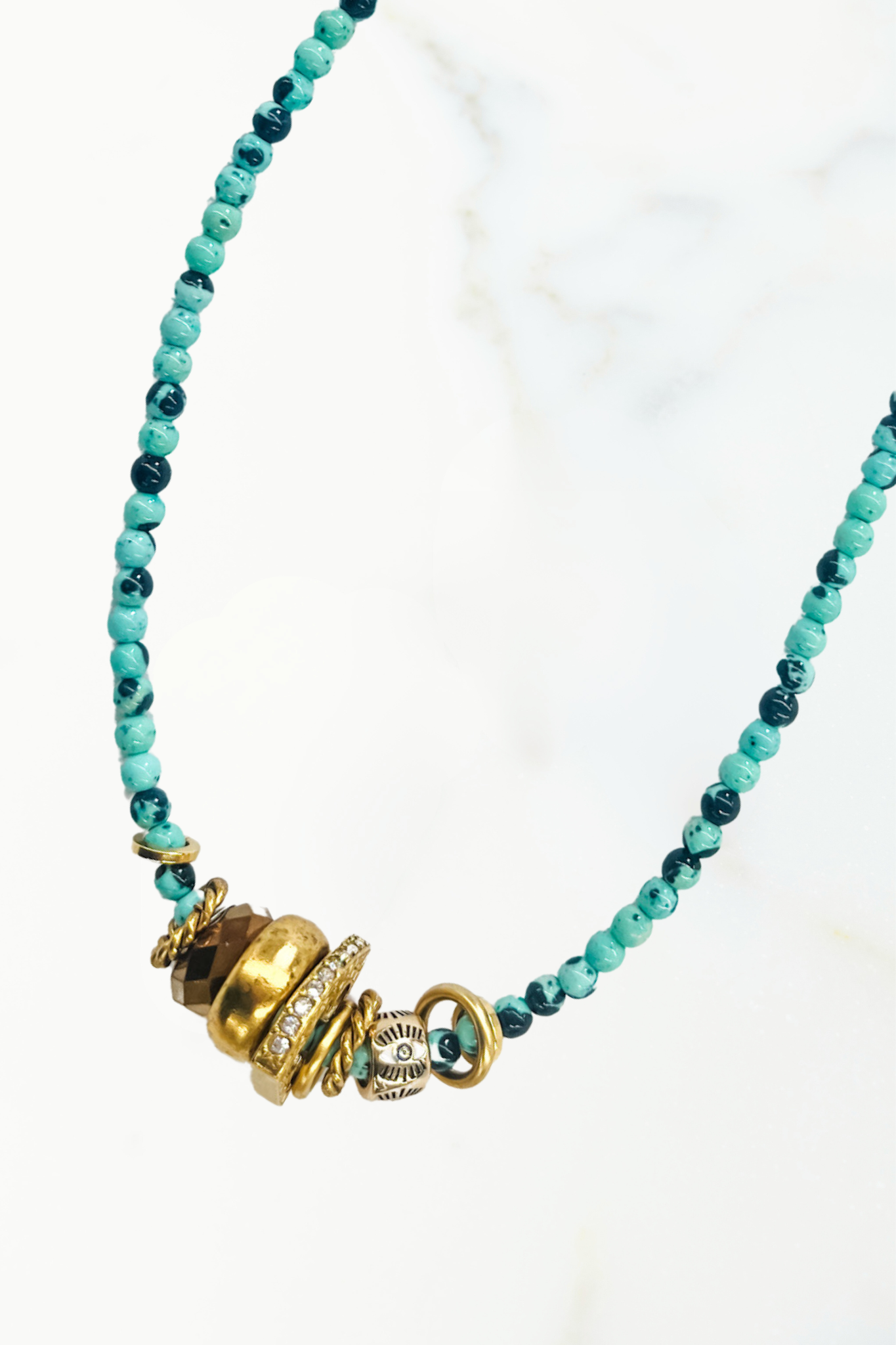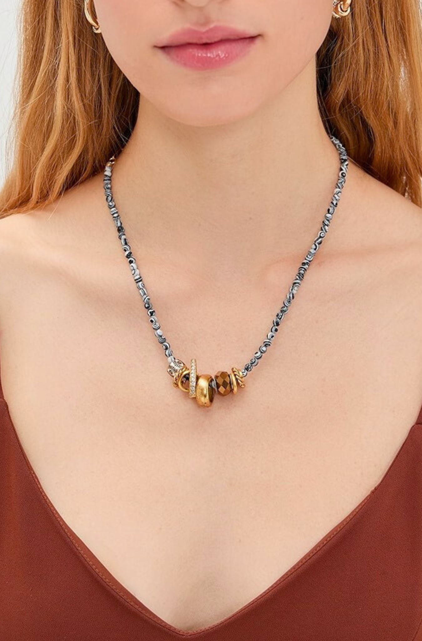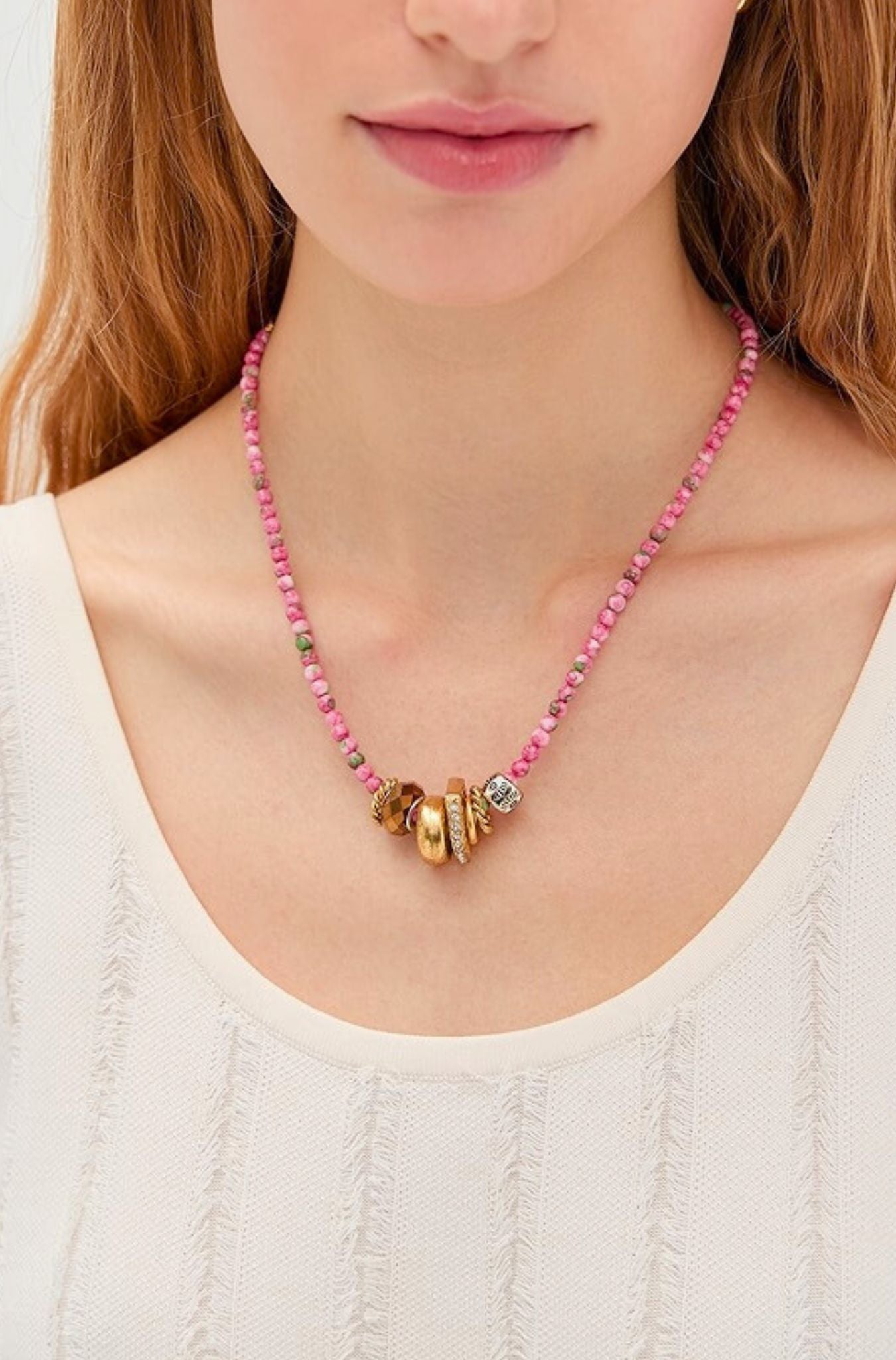 Take a daring leap with the Ines Necklace! Featuring a stunning  beaded neck adorned with various sized rings, this necklace also boasts an evil eye rondelle and a lucky clover center rondelle with crystal accents. Embrace the adventurous edge this piece brings to any outfit. Comes in an array of colors. 24K Gold Plated. Lobster Claw Closure. Proudly Made in the U.S.A.