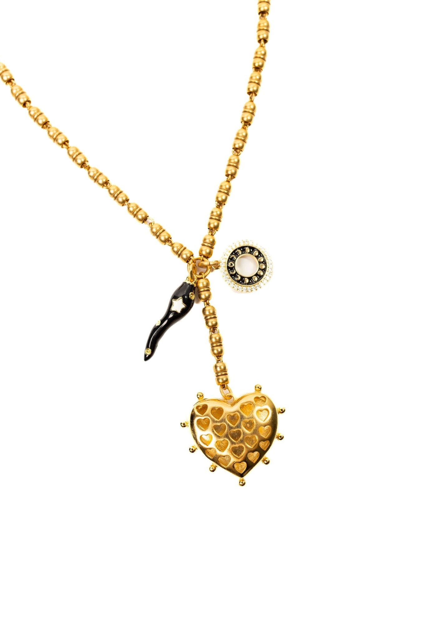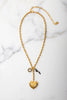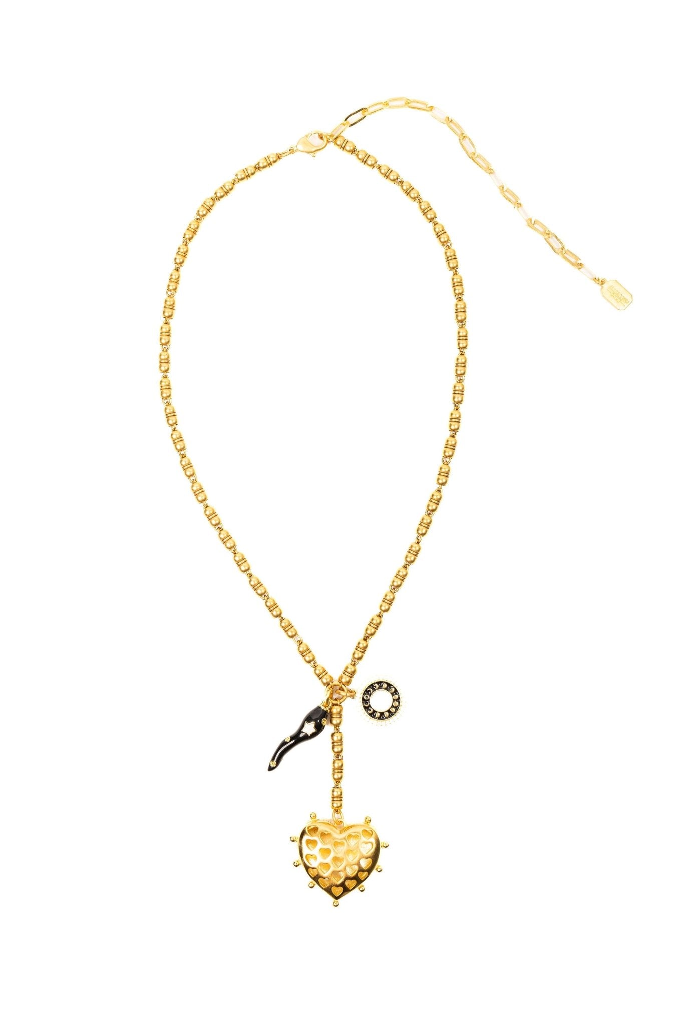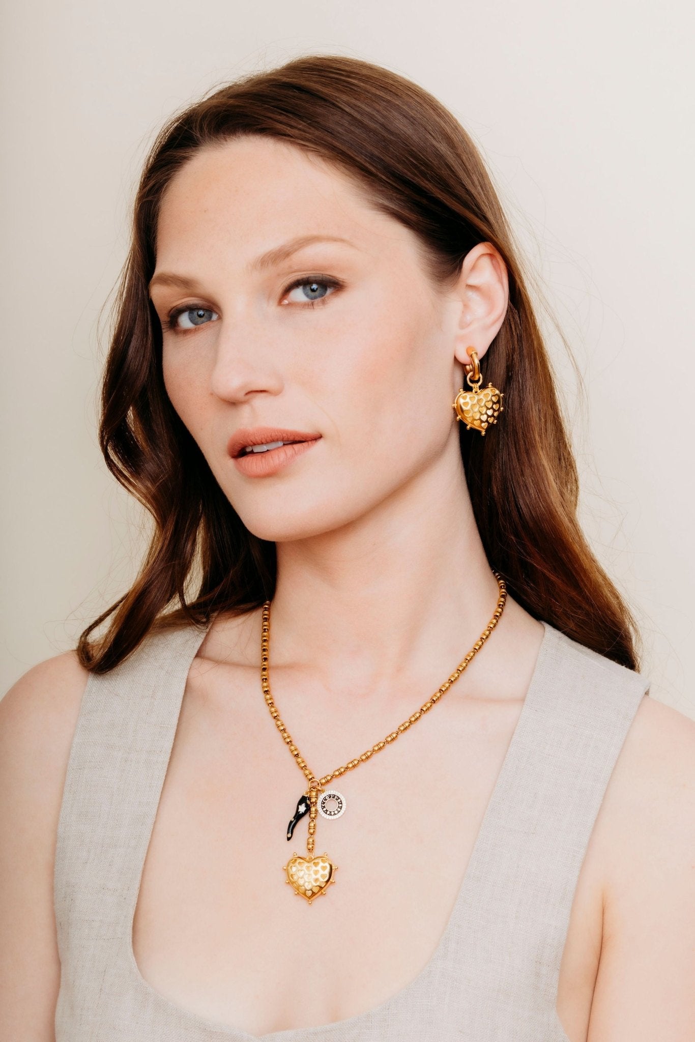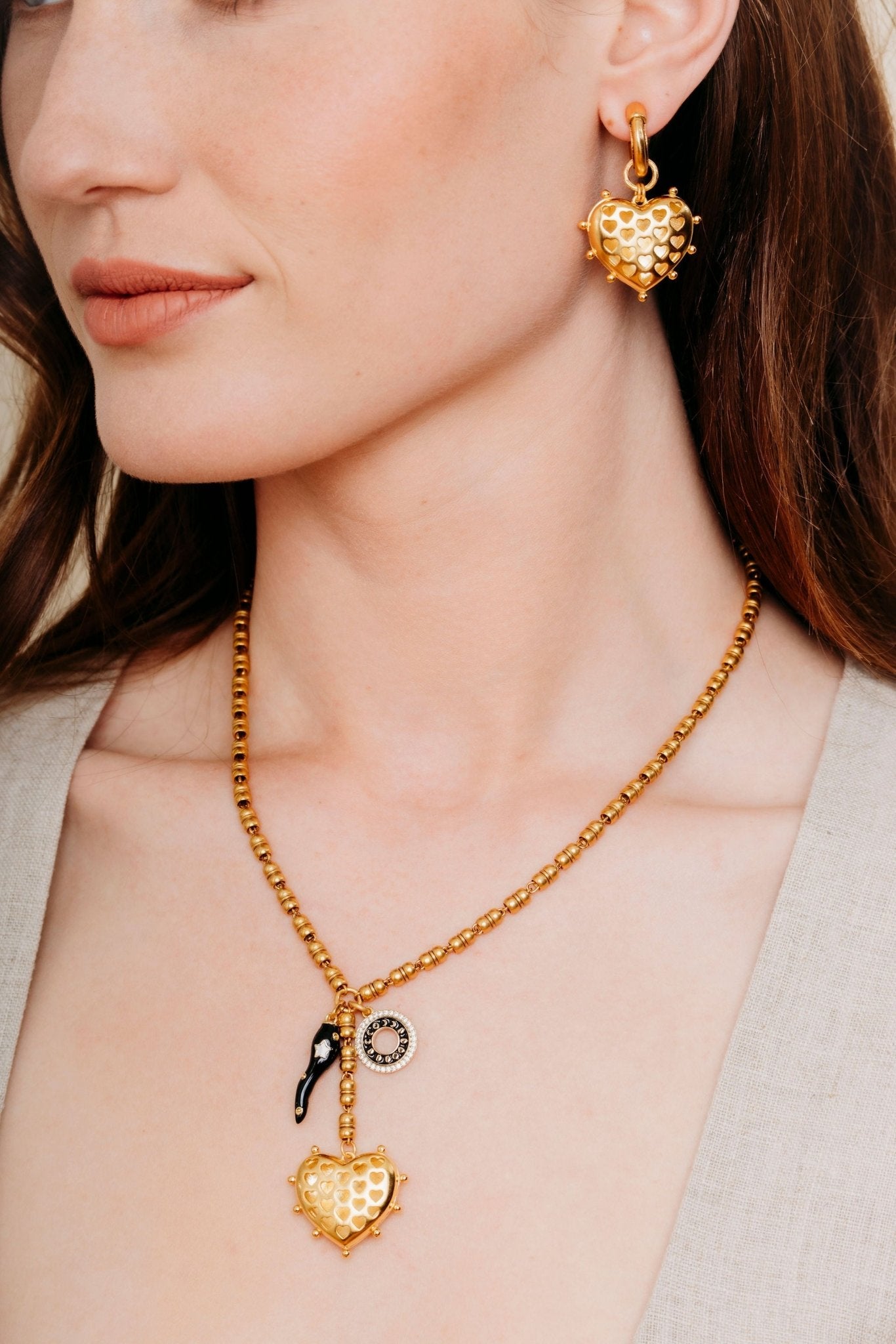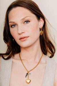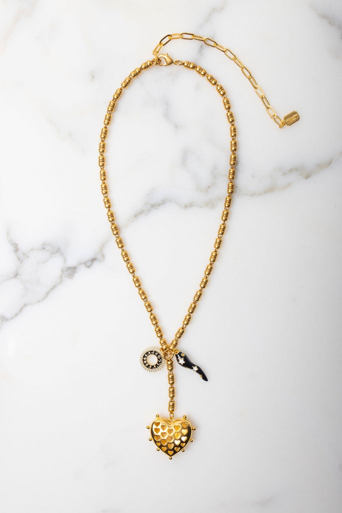 Add a touch of adventure to your style with the Keira Necklace. Featuring a perforated heart, black pepper charm, and compass charm, all plated in 24kt gold, this necklace can be worn alone as a statement piece or layered for a unique look. 24kt Gold Plate, Proudly Made in the USA.