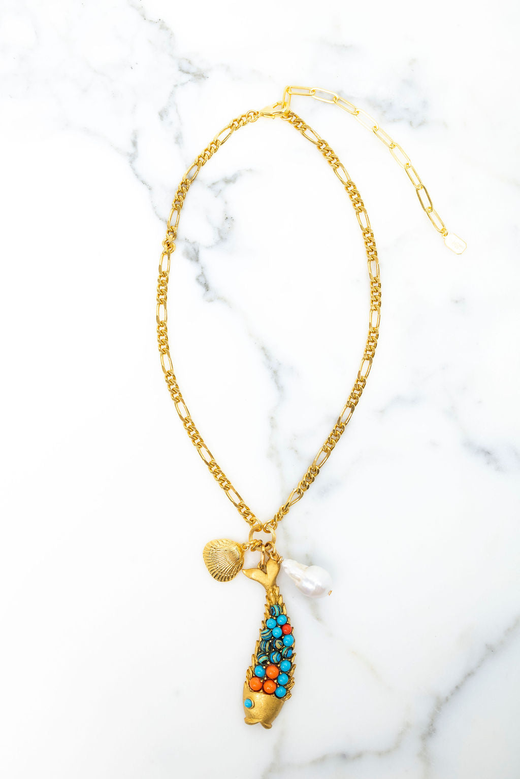 Dive into whimsy with this enchanting Koi Necklace, where a graceful koi fish charm takes center stage alongside a lustrous freshwater baroque pearl and delicate shell accent. Strung on a classic figaro chain, the koi's vibrant faux bead body brings movement and personality to your everyday look. Perfect for ocean lovers and charm collectors alike, this piece captures the playful spirit of the sea in one stunning statement. 24K Gold Plate. Lobster Claw Closure. Proudly handcrafted in the U.S.A,