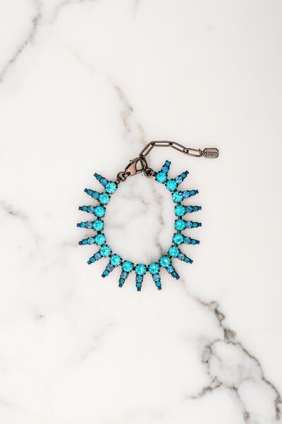 "Add a splash of color to your outfit with the Lauryn Bracelet! This playful rainbow or blue bracelet features multi-shade crystals that catch the eye and elevate any look. Perfect for adding a touch of fun to your everyday style." Hematite Plate. Lobster Closure. Proudly made in the U.S.A