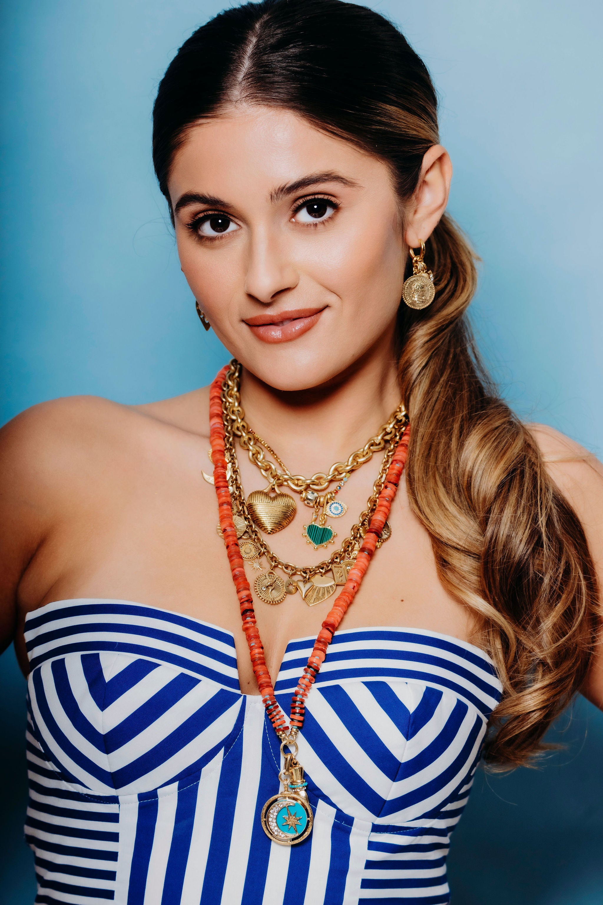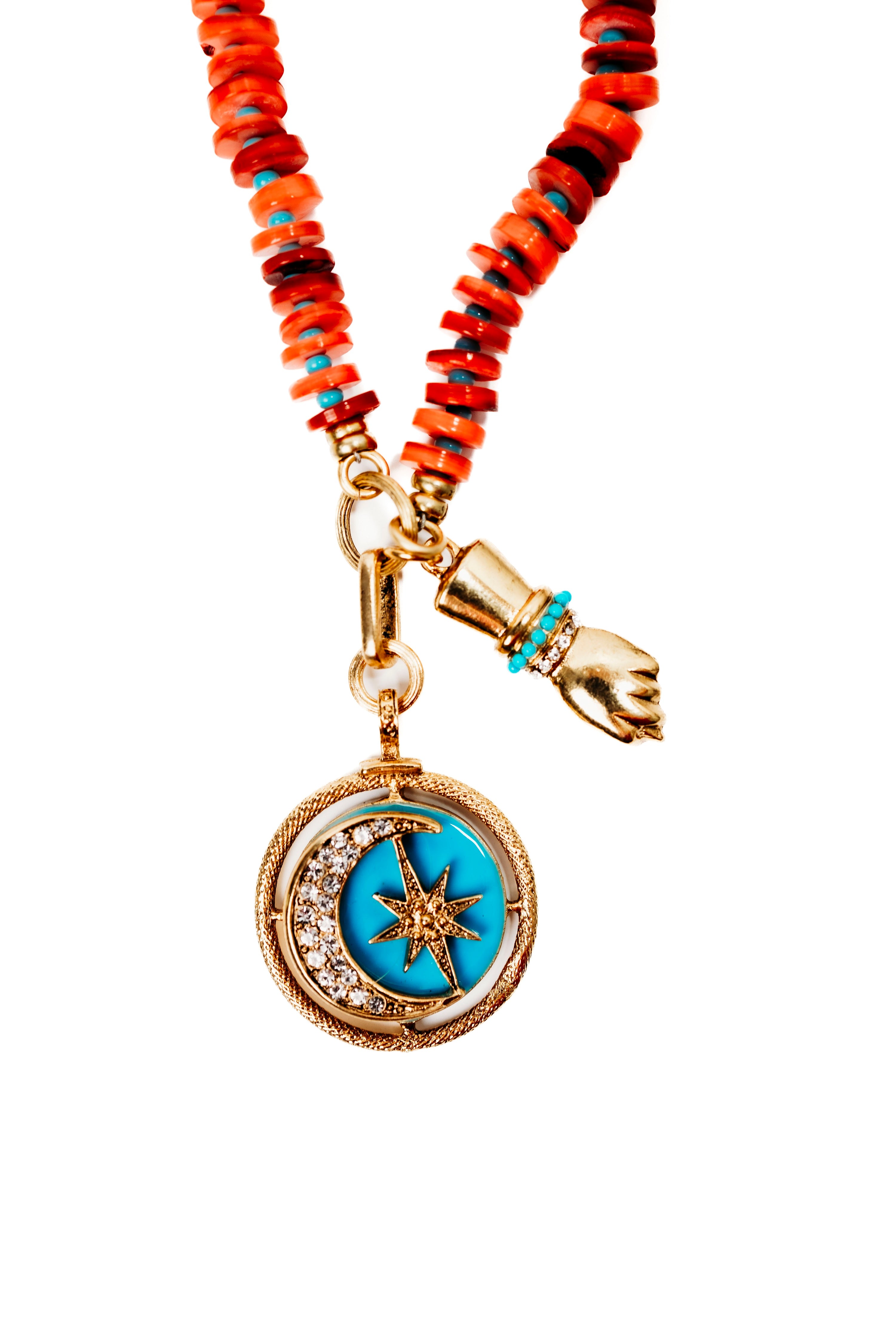 The Lunaria Necklace invites you to wear the wonder of the night sky. Strung with warm red coral heishi disc beads and delicate faux turquoise spacers, this piece radiates natural beauty and bohemian charm. The centerpiece features a turquoise enamel crescent moon and star charm, elegantly encrusted with crystals that catch the light with every movement. Accompanied by a protective figa charm, this necklace combines celestial symbolism with meaningful intention. A versatile design that works beautifully on its own or layered with your favorite pieces, the Lunaria Necklace is your everyday reminder to embrace magic and possibility.24K Gold Plated. Swarovski Crystals. Lobster Claw Closure. Proudly handcrafted in the U.S.A
