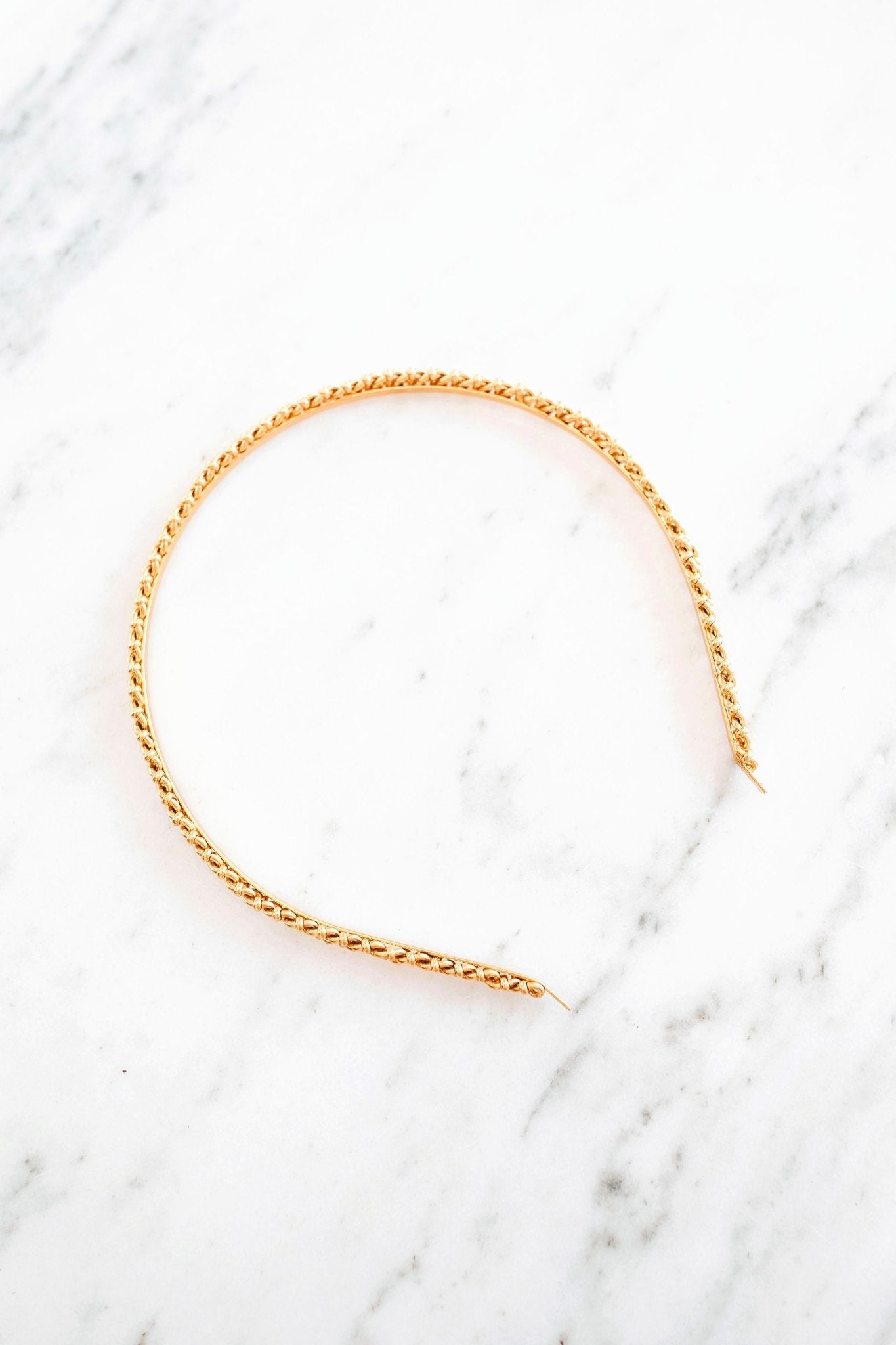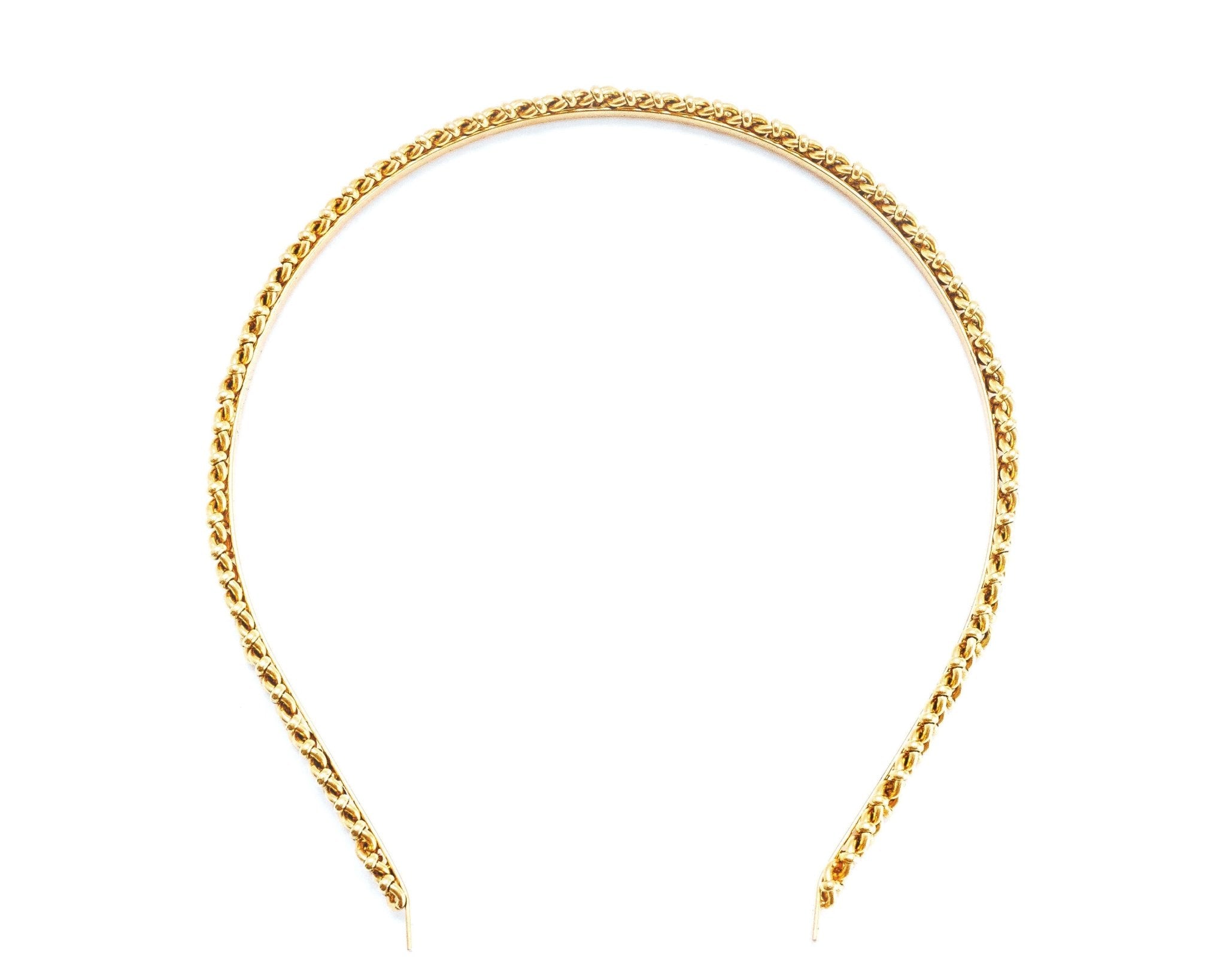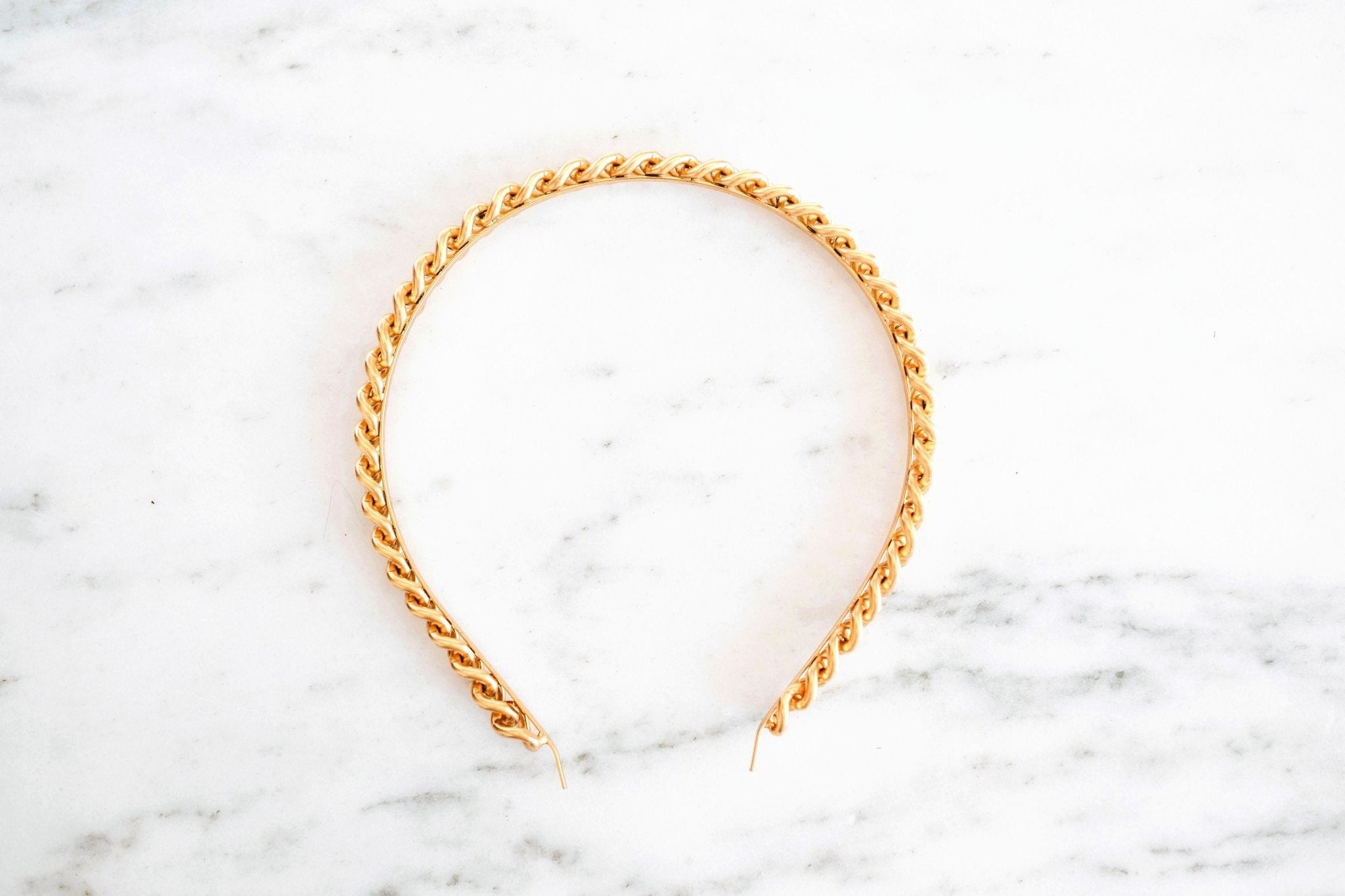 The Meika Headband features oversize golden links. 24kt Gold Plate, Proudly Made in the United States.