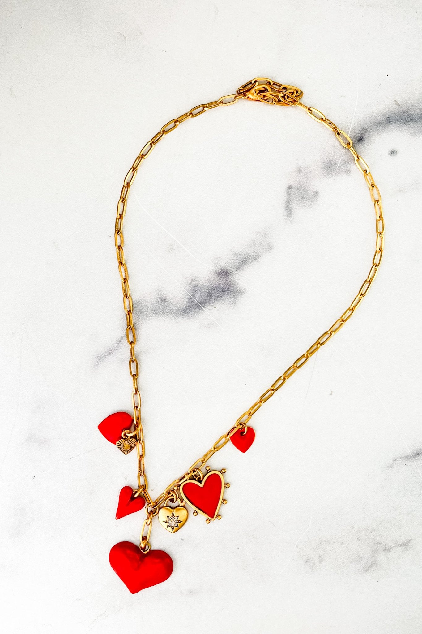 Upgrade your jewelry game with the Mercedes Necklace! This unique piece features a collection of graduated hearts, available in smooth red or black enamel, on a delicate golden chain. Make a bold statement and add a touch of quirky charm to any outfit. (Bonus: it's the perfect gift for any car-loving fashionista!). 24kt Gold Plate, Proudly Made in the USA.