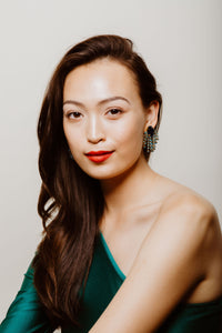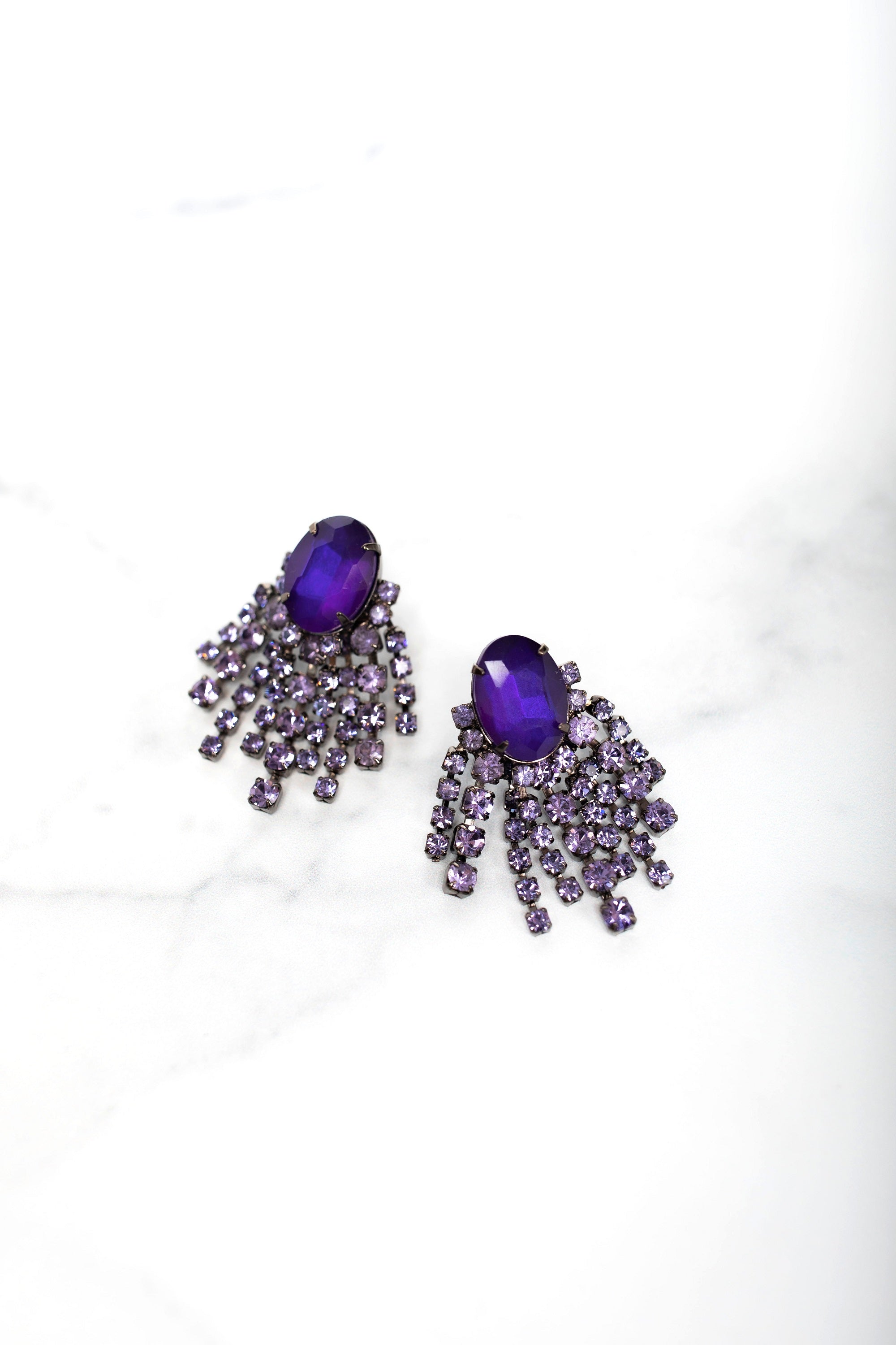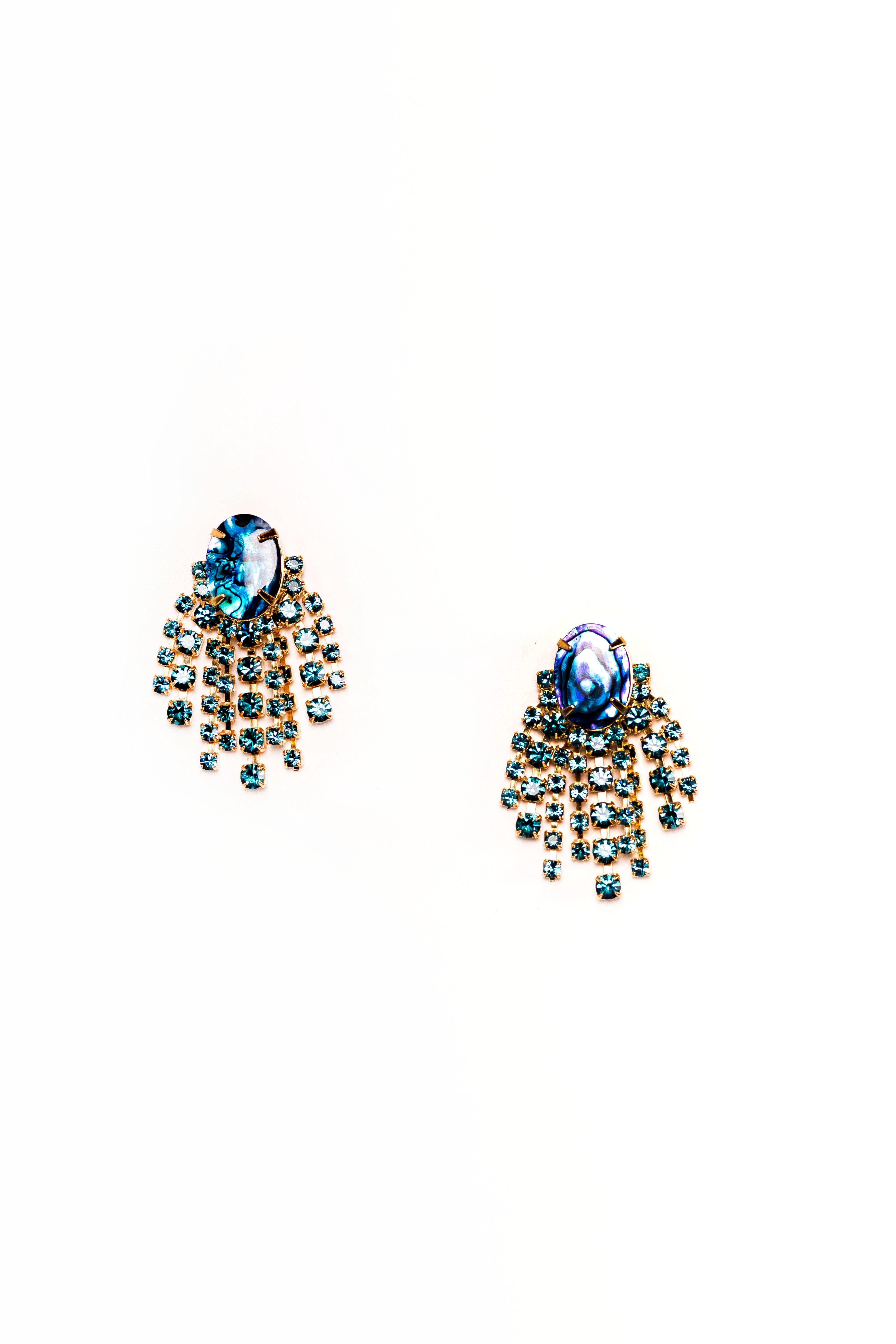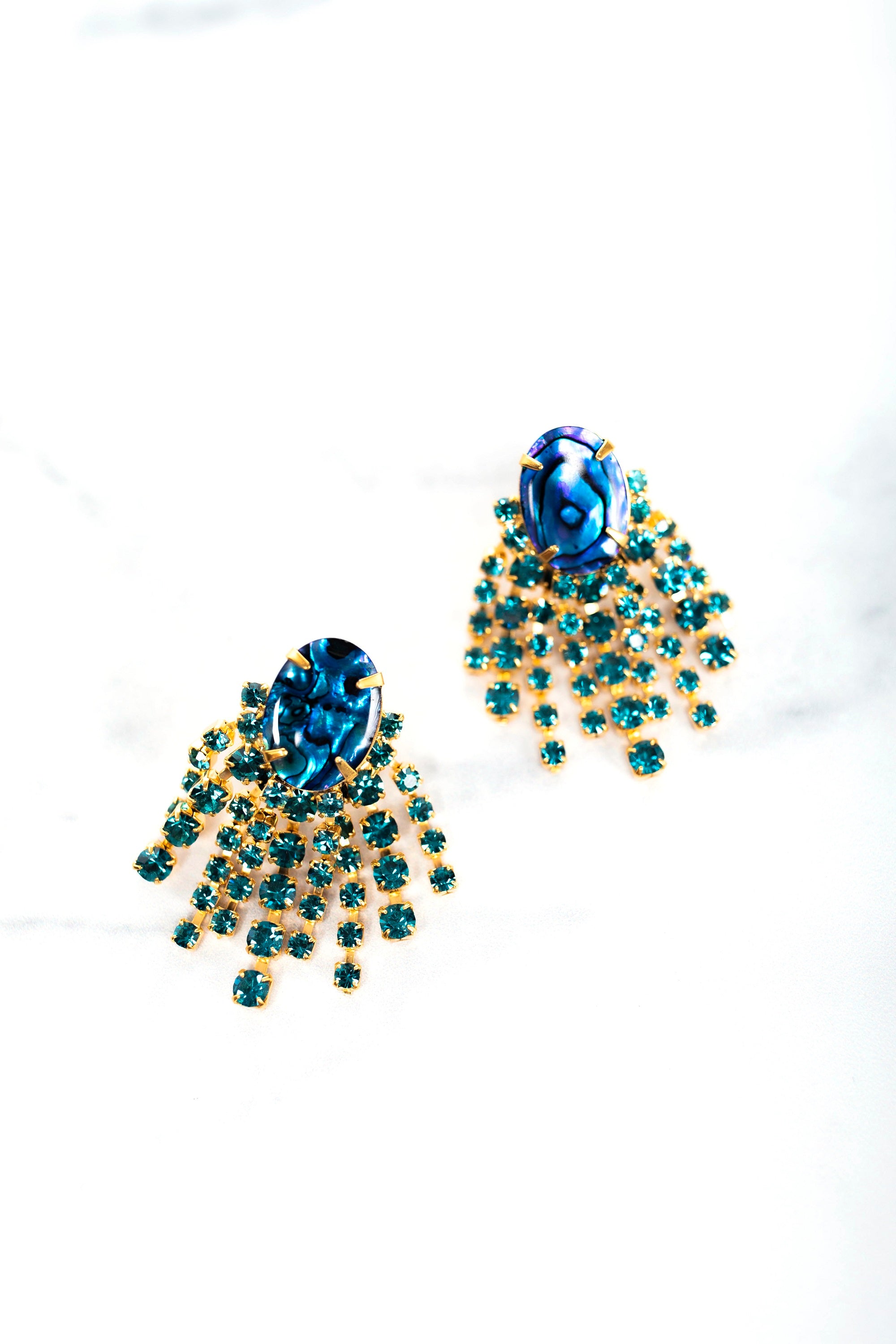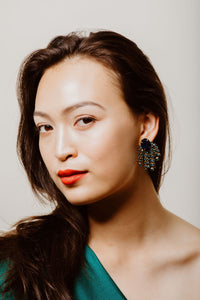 If our girl Cecilia is a bit much, the Nala is meant for you. Featuring a more demure oval stone, the Nala features the same cascade of glittering crystal fringe. Available in a variety of colors and finishes. Premium Czech Crystals, Glass Stones, 24kt Gold Plate & Hematite Plate, Post Closure, Proudly Made in the USA.
