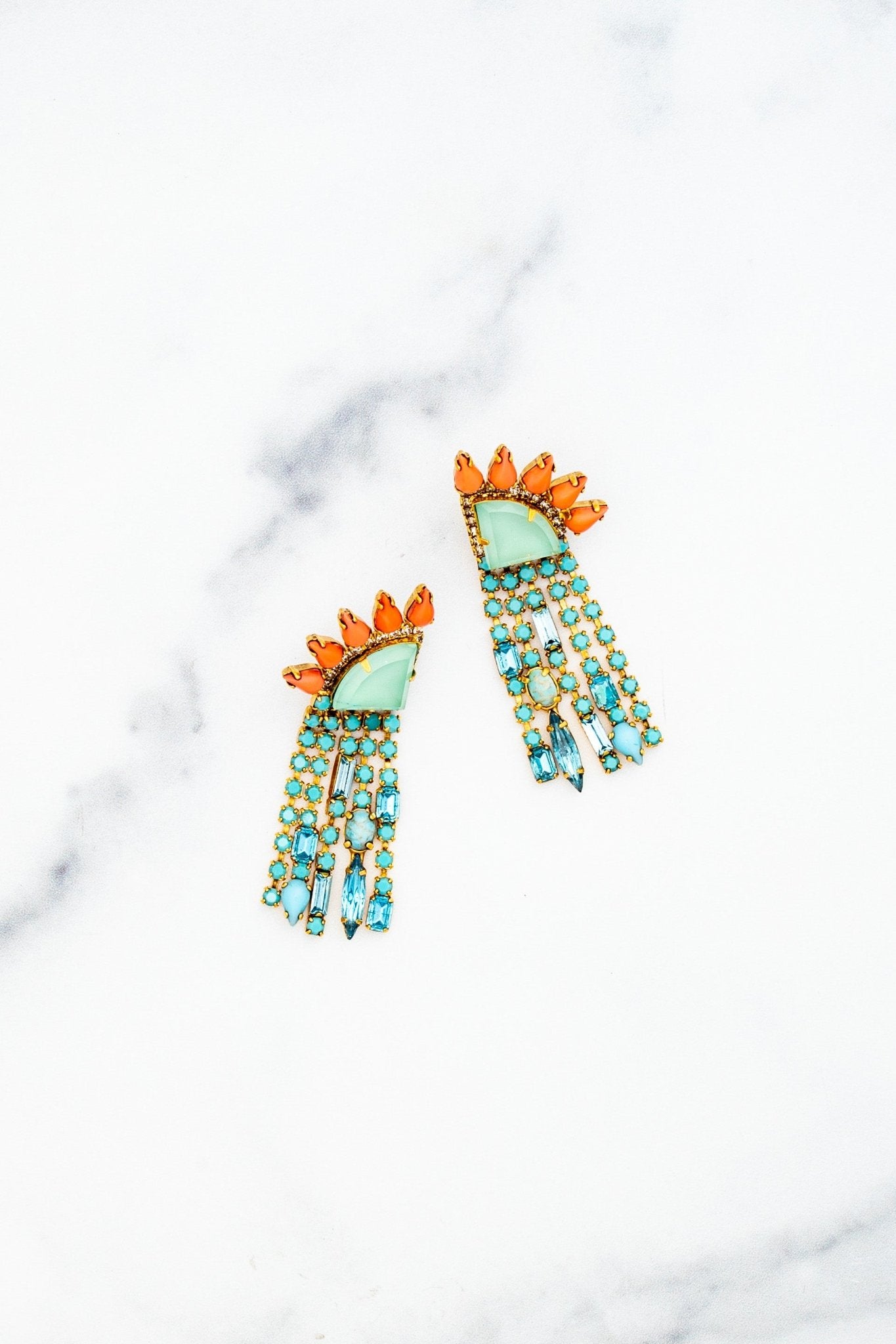 Add a little dose of glam to your ensemble with these stunning Glora Earrings! Featuring an eye-catching spray of aqua baguettes, aqua fans, turquoise details, and Czech & Swarovski crystals, these beauties will sprinkle a twinkle of delight in any style. With 24kt gold plate, you'll be sparkling all night long!