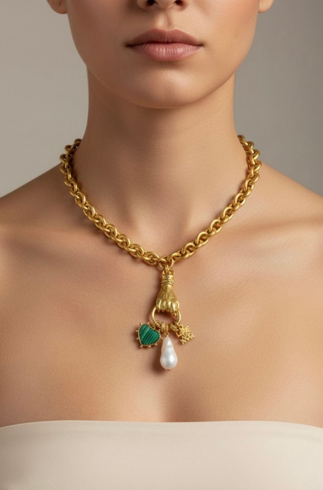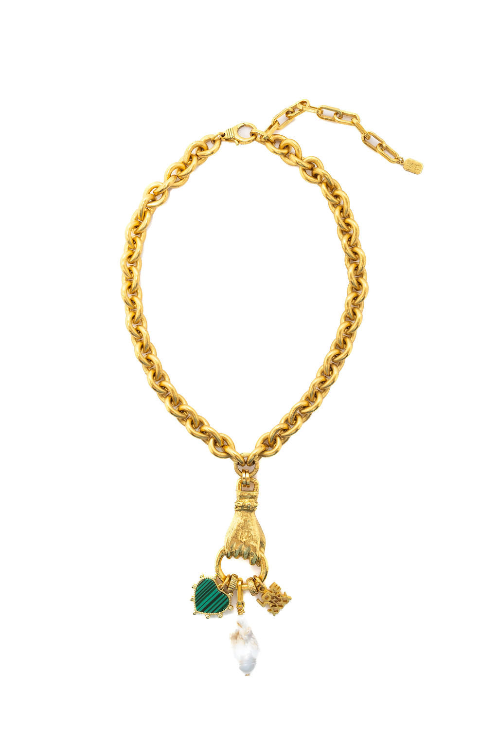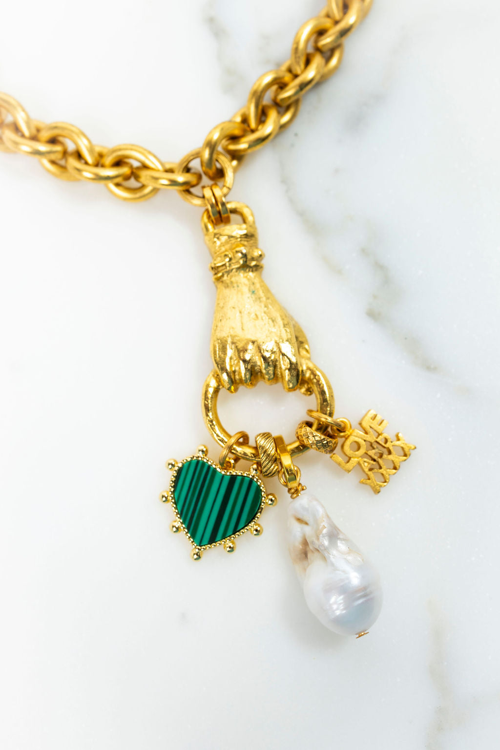 The Rowan Necklace features an open oval link chain with a striking hand charm gripping a ring adorned with a freshwater baroque pearl charm. Complemented by a faux-studded malachite heart charm, "love and xxx" charm, and textured rondell charms, this daring piece delivers a bold, layered look that commands attention. 24K Gold Plated, Lobster Claw Closure. Handcrafted in the U.S.A.