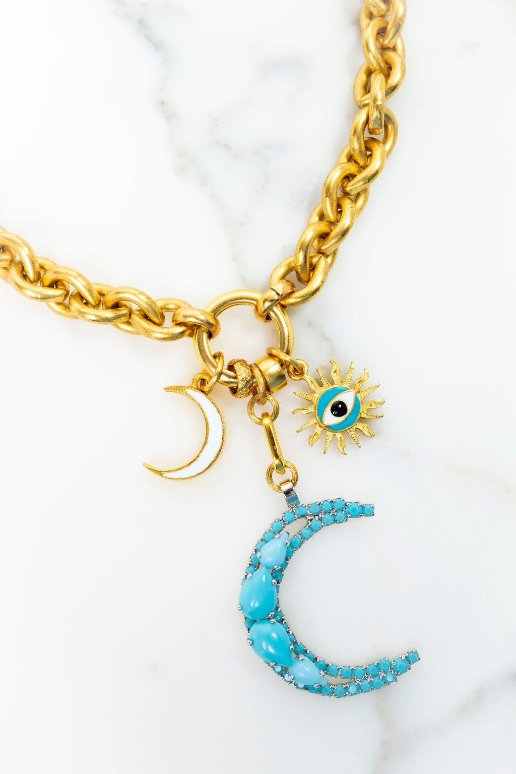Embrace celestial mystique with the Seluna Necklace—a daring statement piece featuring an open link chain adorned with a striking moon charm. Crafted with faux turquoise stones in both round and pear shapes, the white enamel moon charm exudes ethereal elegance. Paired with a bold sunburst enamel evil eye charm, this necklace merges protective symbolism with fearless style. Perfect for those who dare to blend cosmic wonder with edgy sophistication.24K Gold Plate. Lobster Claw Closure. Proudly made in the U.S.A
