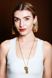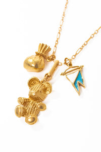 This playful Teddy Necklace features a delicate Figaro chain adorned with a textured teddy bear charm, a bag of gold charm, and a bright blue and white enamel flag charm. It's a fun and charming accessory that adds a touch of personality and joy to any outfit. 24k Gold Plate. Lobster Claw Closure. Proudly made in the U.S.A